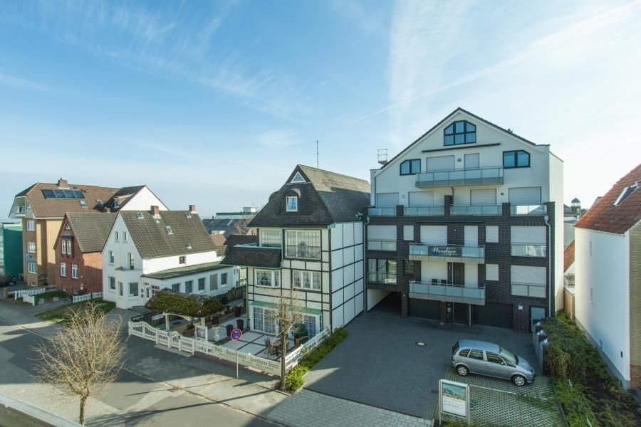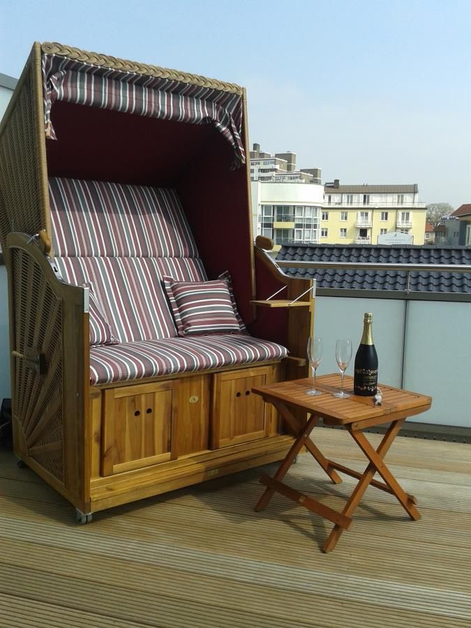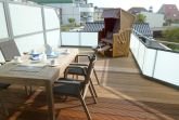 Ein wahres Highlight ist die großzügige Dachterrasse mit hochwertigem Bangkirai-Boden, Strandkorb, Teak-Tisch und gemütlichen Stühlen. Egal bei welchem Wetter, hier können Sie sich entspannen die Terrasse ist teilweise überdacht. Genießen Sie Ihr Frühstück in der gesunden Nordseeluft!