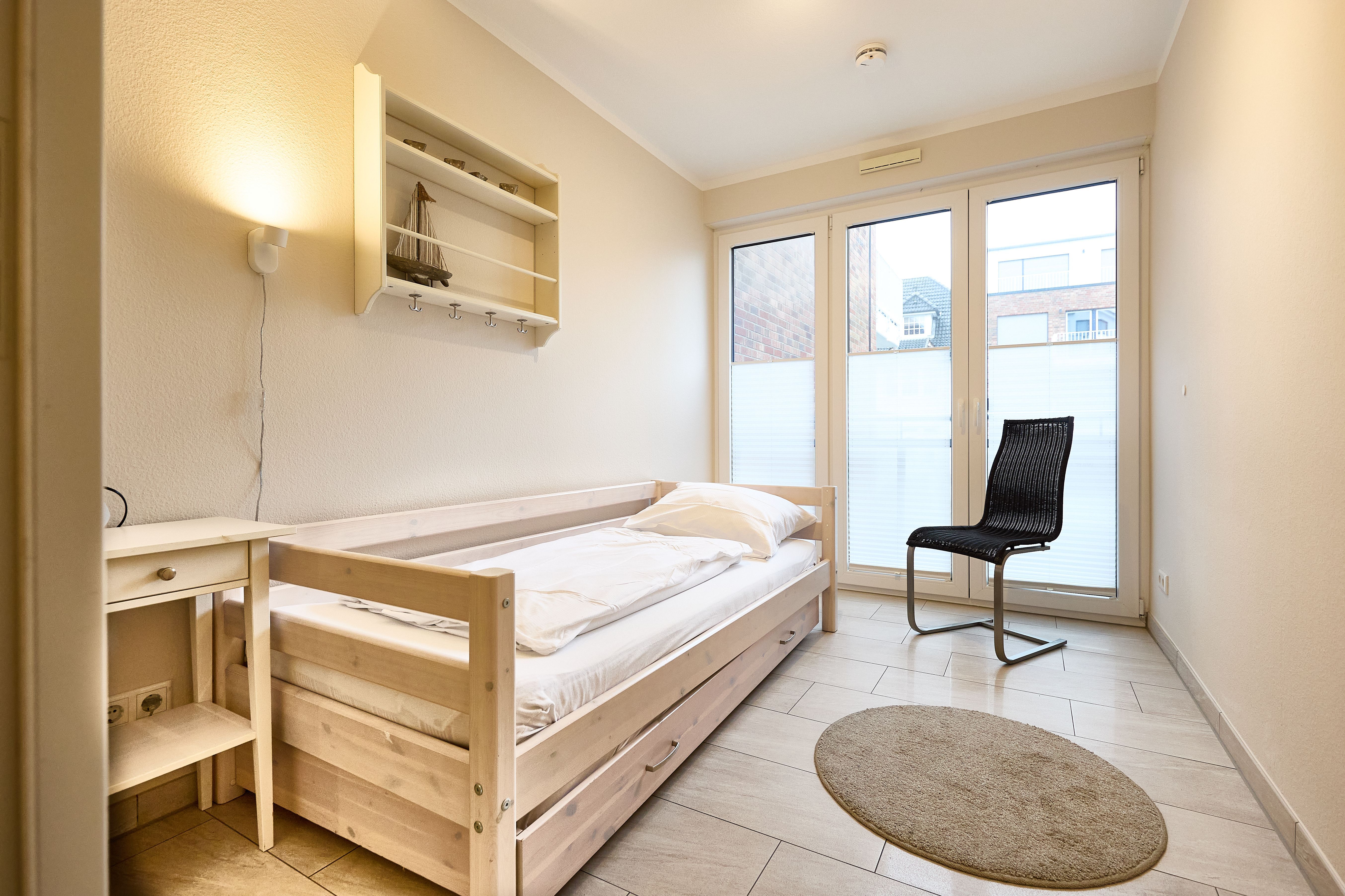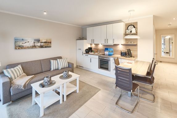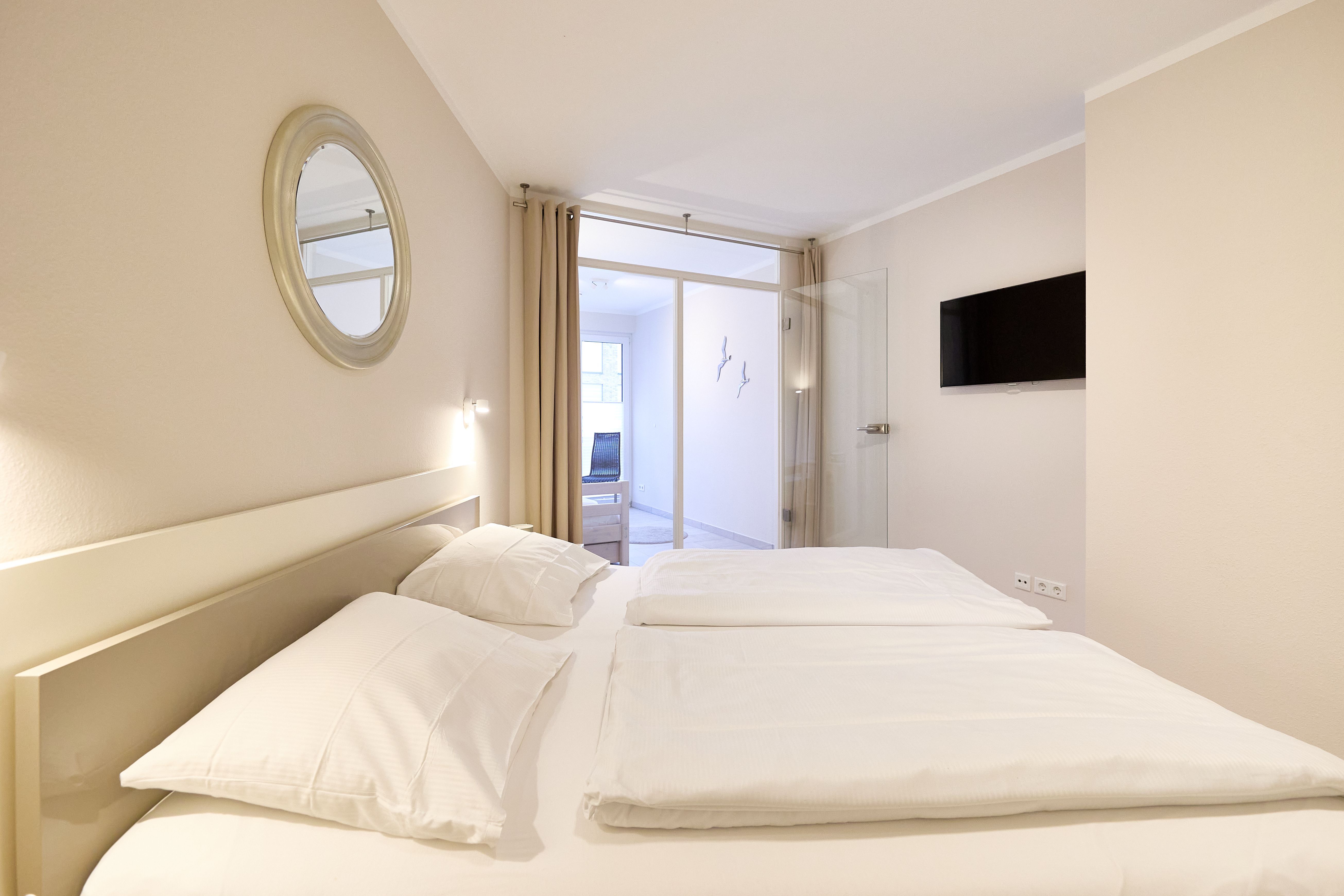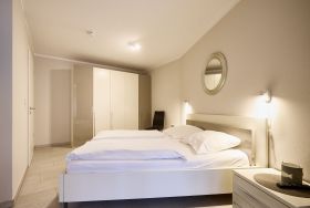 Die Ferienwohnung verfügt über einen lichtdurchfluteten Wohn- und Essbereich mit einer erstklassigen Küche, ein stilvolles Duschbad mit WC, ein erstklassiges Schlafzimmer mit Doppelbett (1,80 x 2,00m) und großem Kleiderschrank sowie ein angrenzendes Kinderzimmer mit einem komfortablen Sofa-Tandembett (Einzelbett mit Ausschubbett, 90x200cm, auch als Sofa nutzbar).