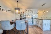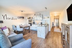 Der stilvoll eingerichtete Wohn- und Essbereich lädt zum Verweilen ein. Ausgesuchte Möbel, darunter Stühle mit Drehfunktion am Esstisch, erleichtern das Hinsetzen und Aufstehen und steigern den Komfort. Die Beleuchtung im Essbereich sorgt für ein besonders angenehmes, warmes Licht. Zusätzlich bietet die voll ausgestattete Einbauküche eine Kapselmaschine für Nescafé Dolce Gusto sowie alles, was Sie für ein genussvolles Frühstück benötigen. Alternativ können Sie Ihr Frühstück auf dem Nordost-Balkon mit seinen gemütlichen Möbeln genießen.
