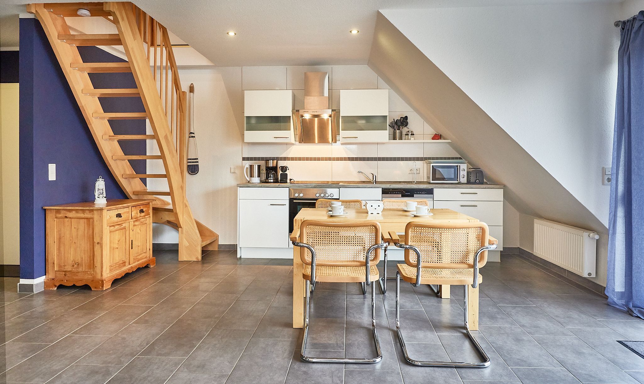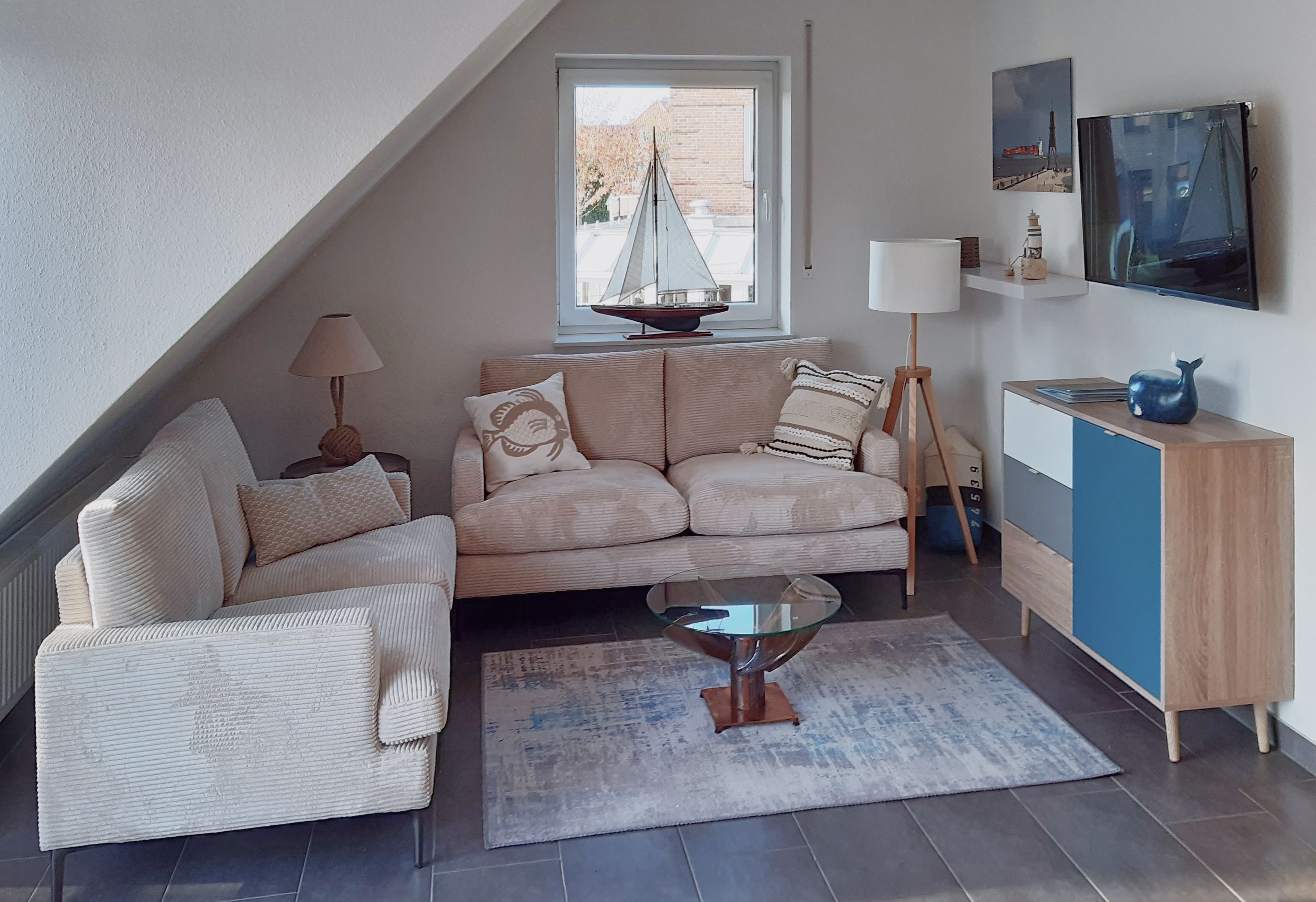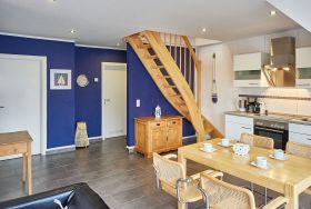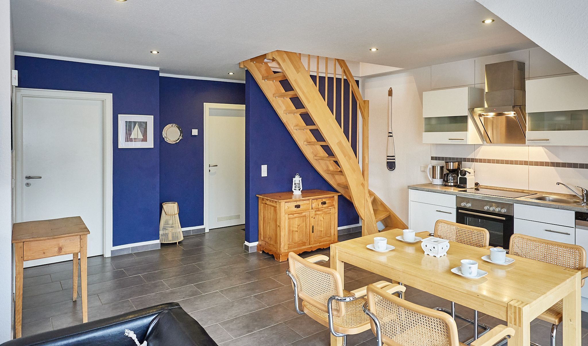 In dieser modernen und hellen, im maritimen Stil eingerichteten Wohnung Liegeplatz im Herzen von Döse empfängt Sie schon beim Betreten Nordsee-Flair. Ein geräumiger Südbalkon mit gemütlichen Balkonmöbeln lädt ganztägig zum Sonnenbaden und Entspannen ein. Die Wohnung verfügt über einen großzügigen und komfortablen Wohn- und Essbereich mit stilvollem Mobiliar und SAT-Fernsehen sowie einer komplett ausgestatteten Einbauküche. Die zwei Schlafzimmer sind mit einem Doppelbett und zwei Einzelbetten ausgestattet. Ein neuwertiges Duschbad mit WC und Fußbodenheizung ist ebenfalls vorhanden. Bitte beachten Sie, dass das 2. Schlafzimmer sich im Dachgeschoss befindet und diese über eine Treppe (siehe Fotogalerie) erreichbar ist.