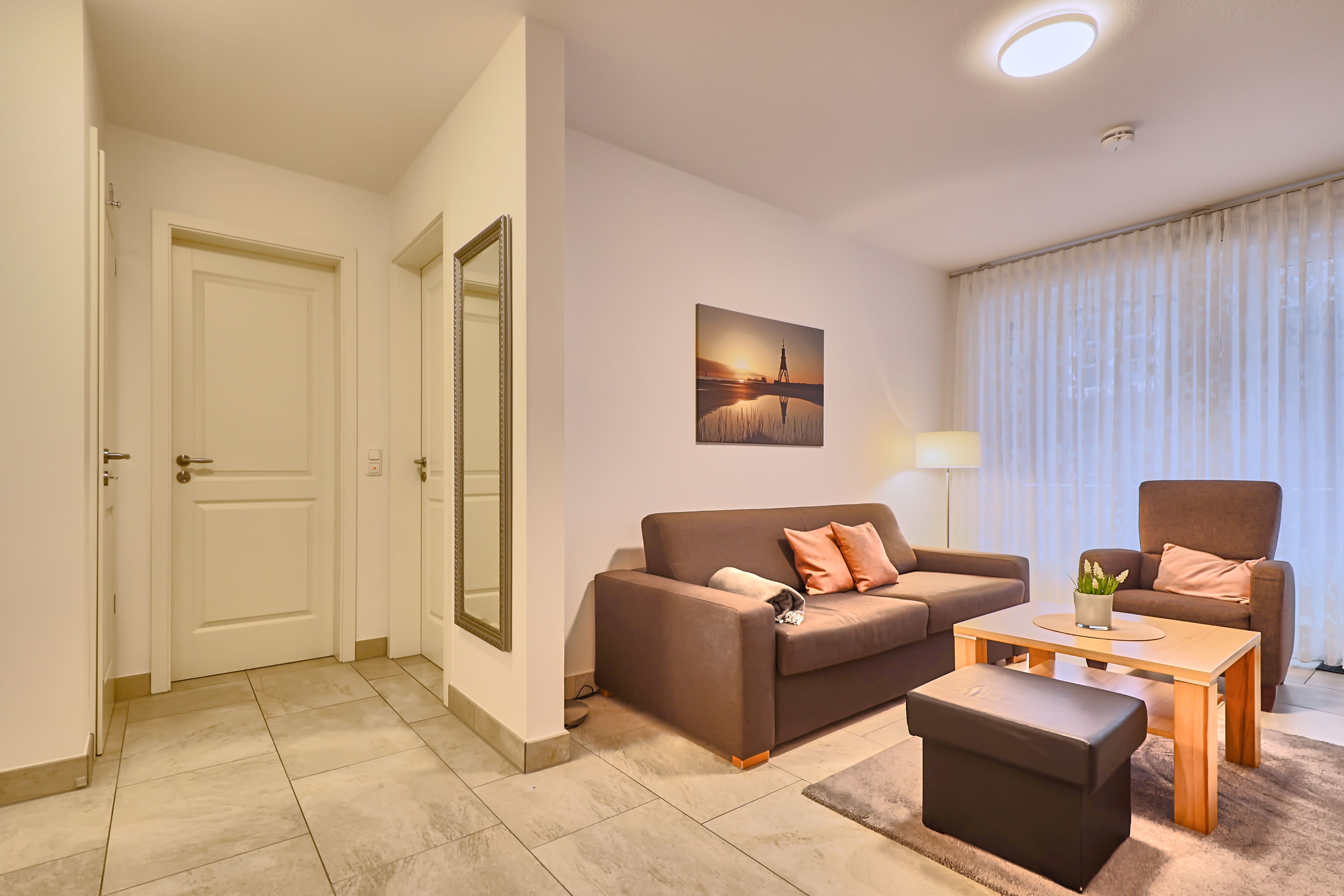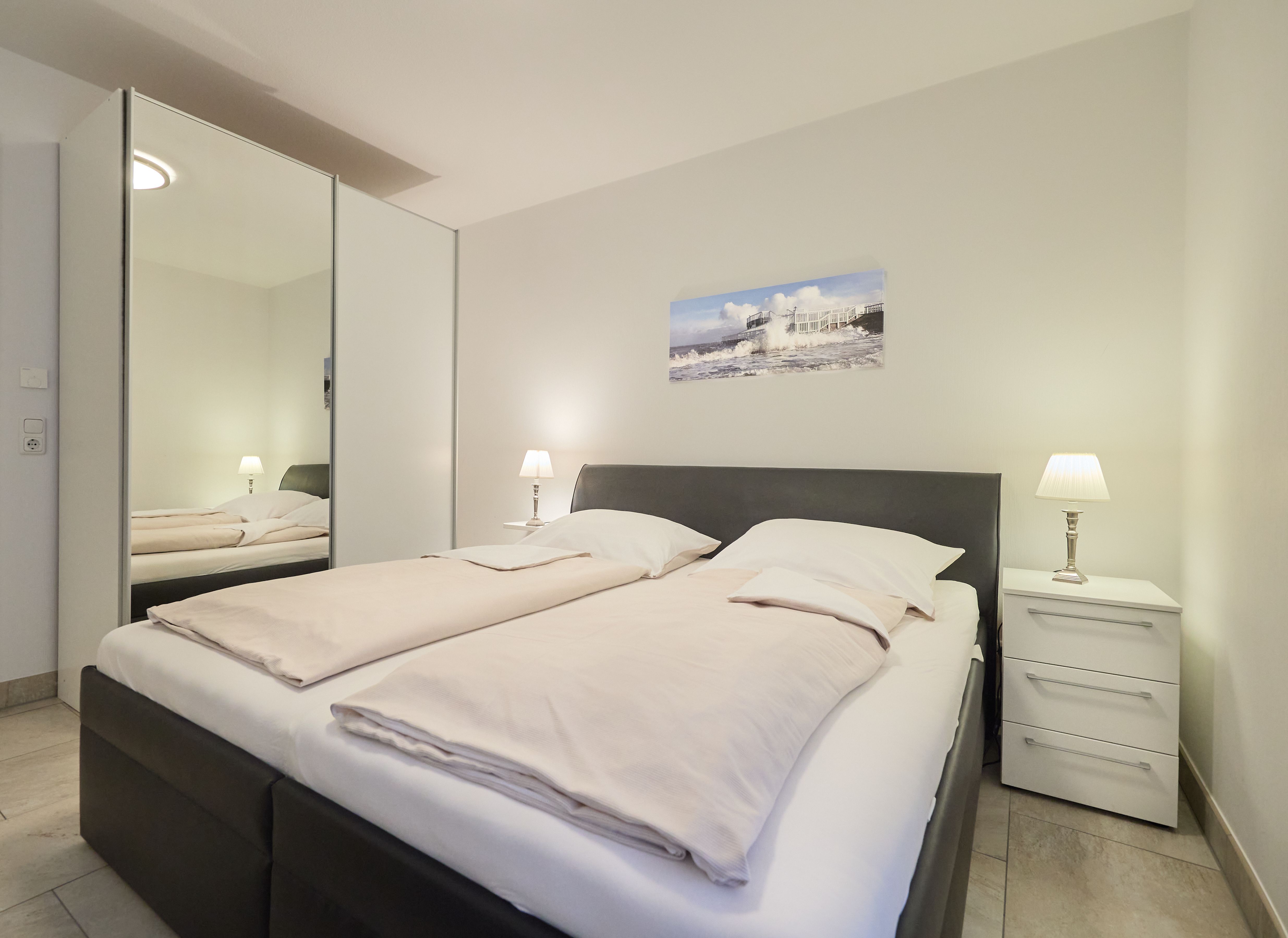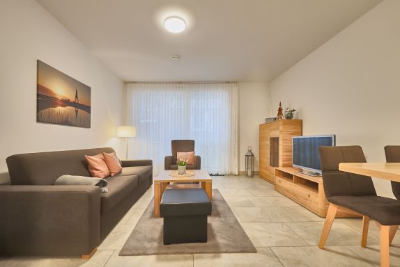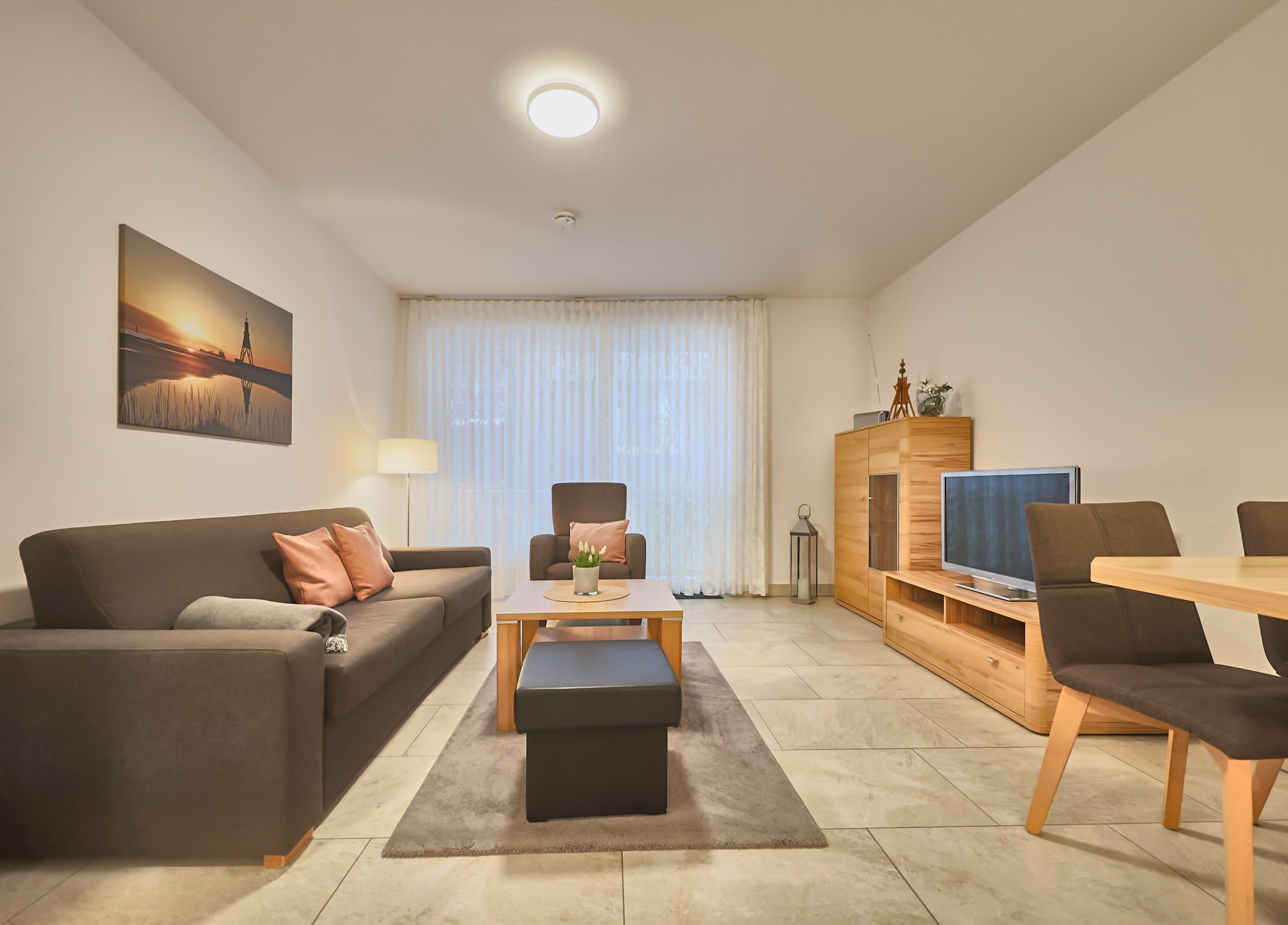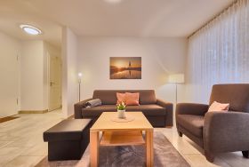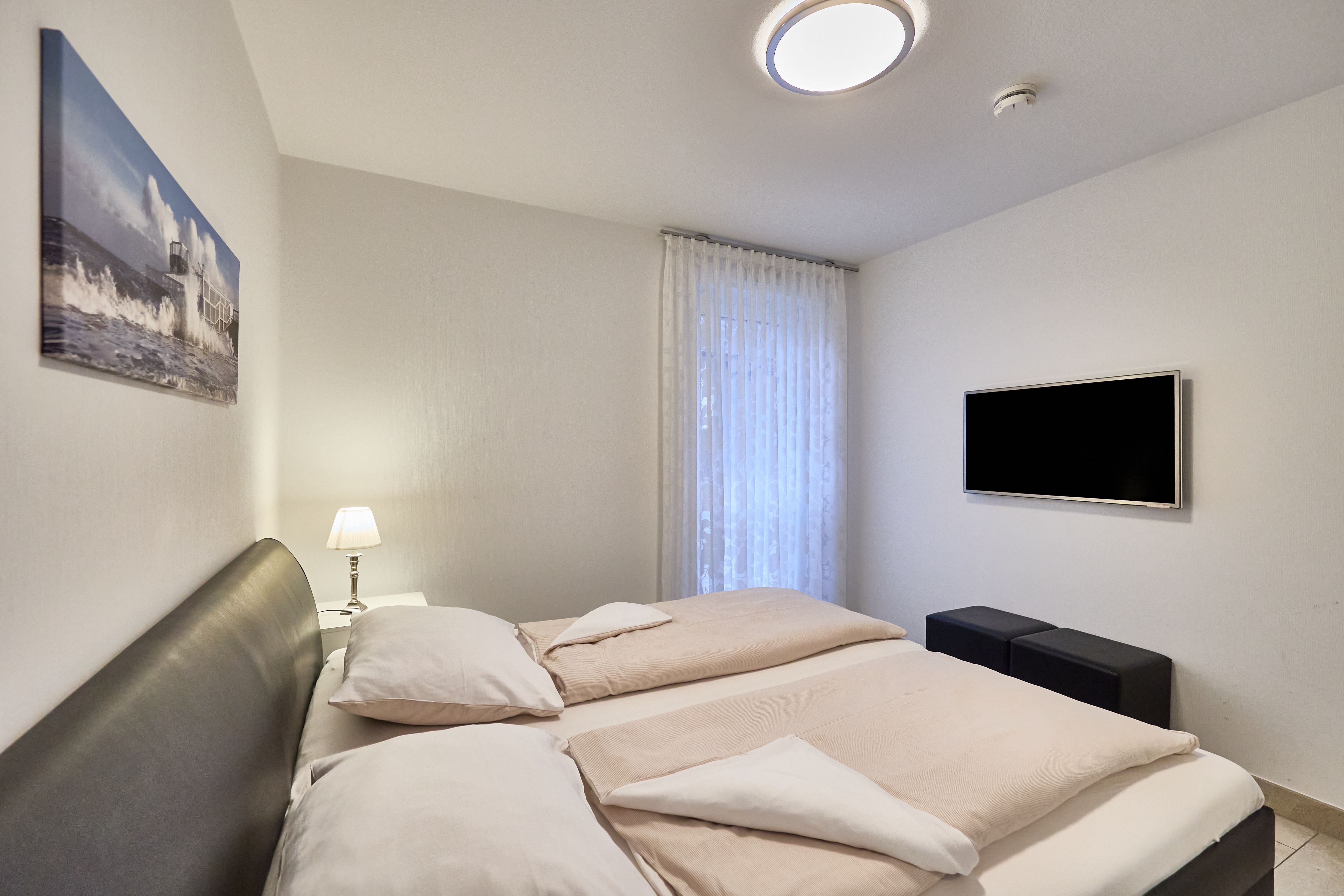 Der großzügige Wohn- und Essbereich bietet eine moderne Einbauküche inklusive Grillmikrowelle, einen behaglichen Wohnbereich mit Schlafcouch (160 cm breit) sowie Zugang zum komplett möblierten Südwest-Balkon mit einer kleinen, aber spürbaren Seesicht. Das separate Schlafzimmer verfügt über einen großen Kleiderschrank und einen zweiten HDTV. Das geräumige Badezimmer ist mit Dusche und WC ausgestattet.