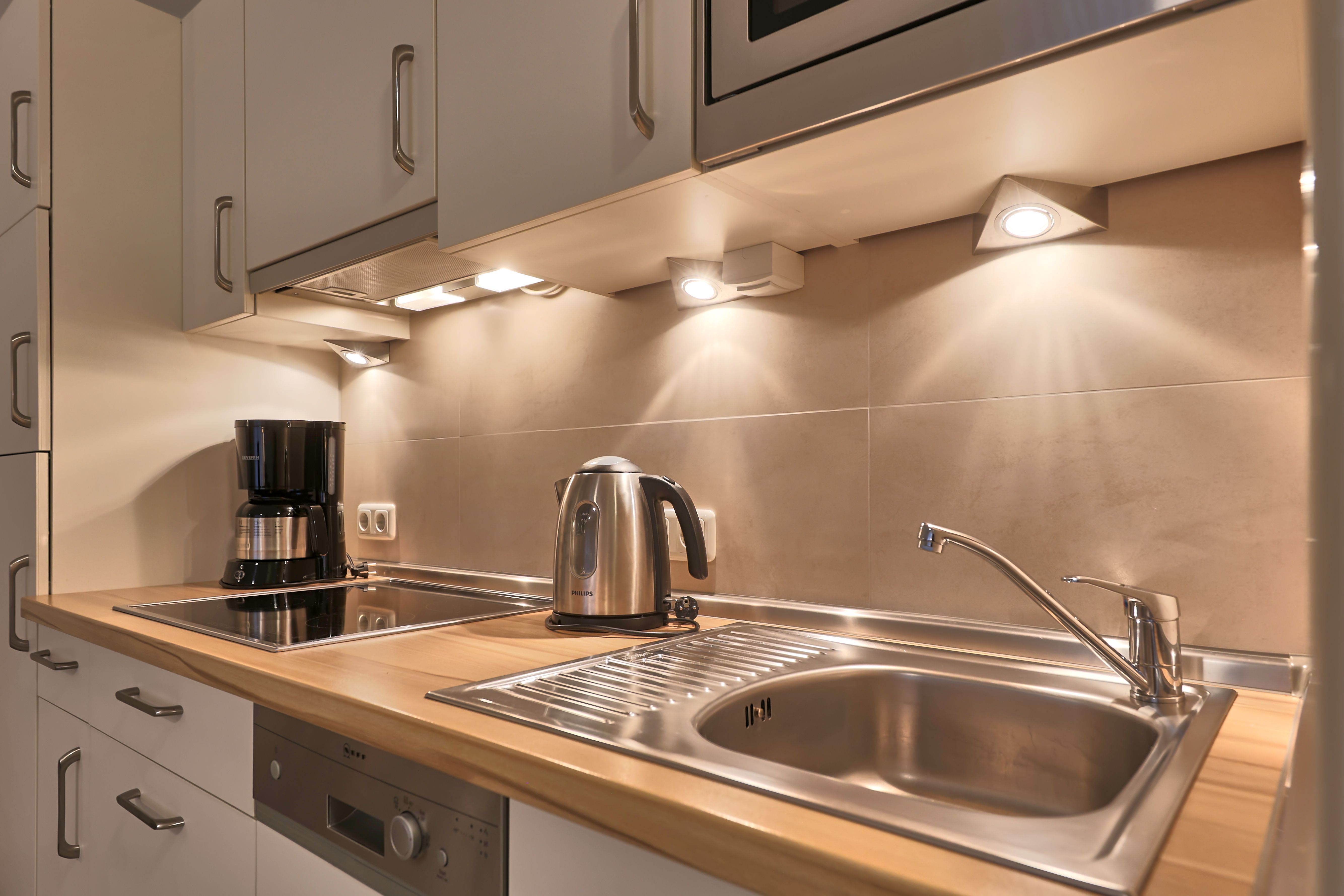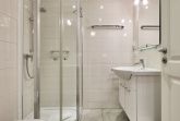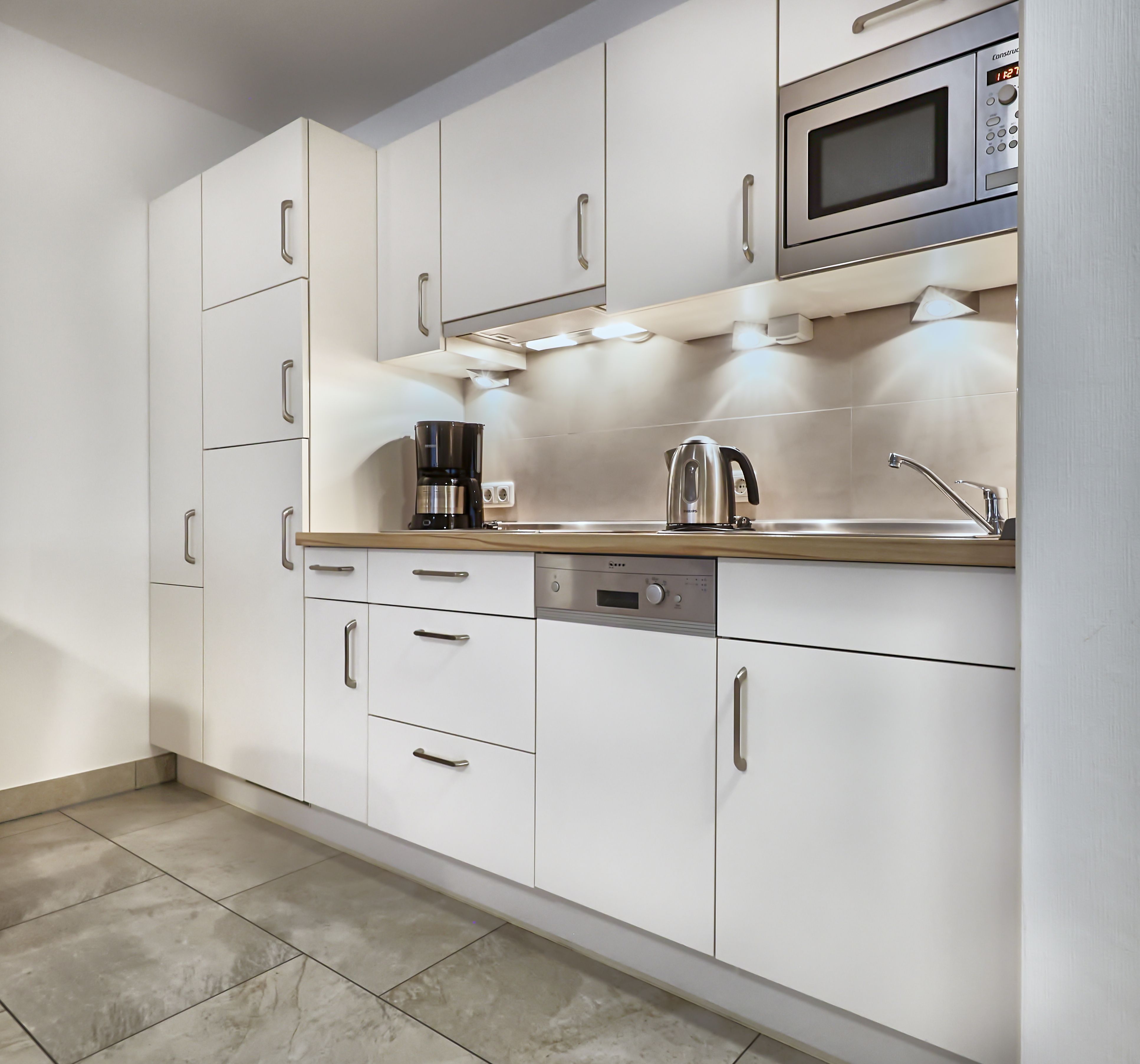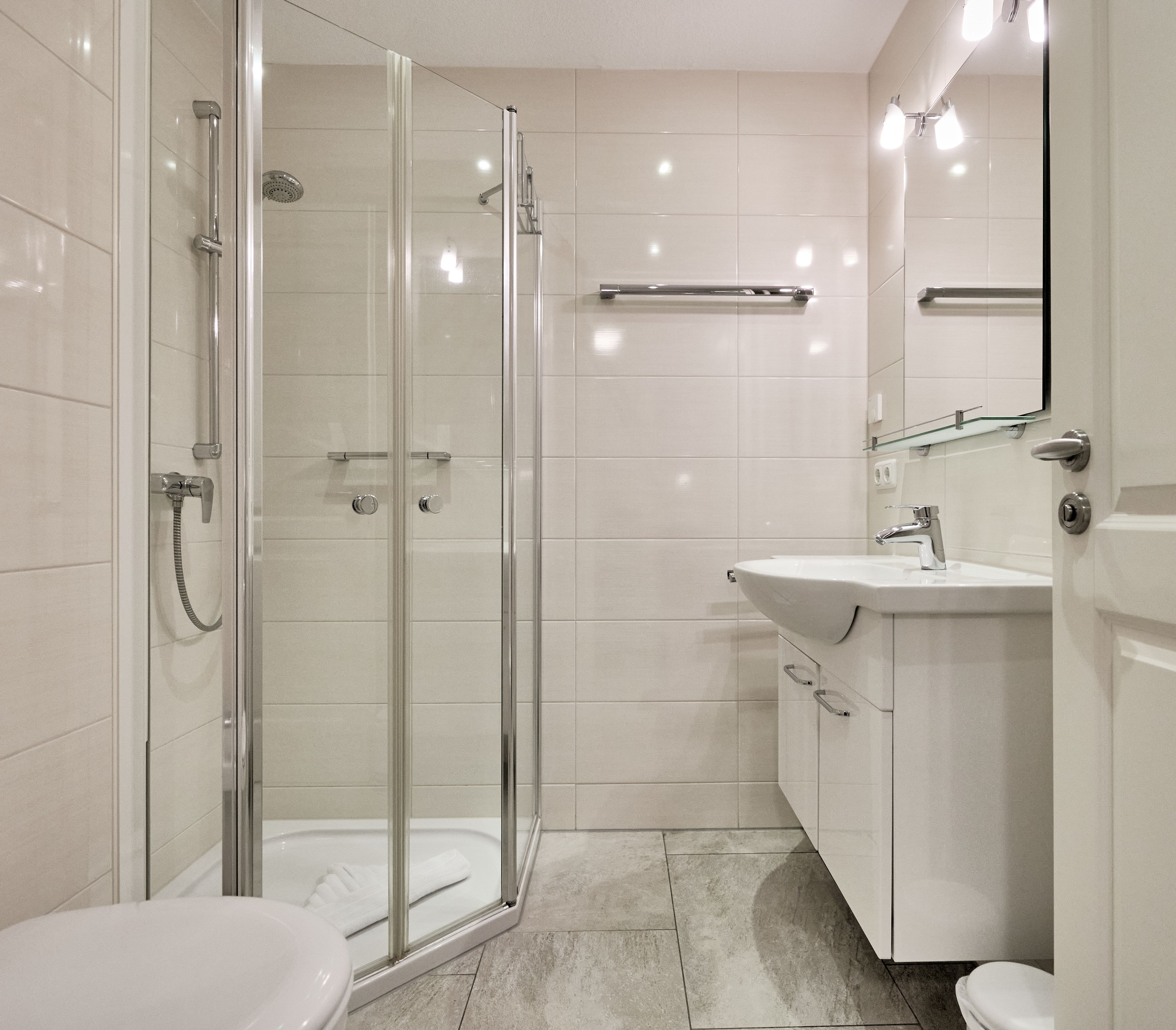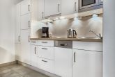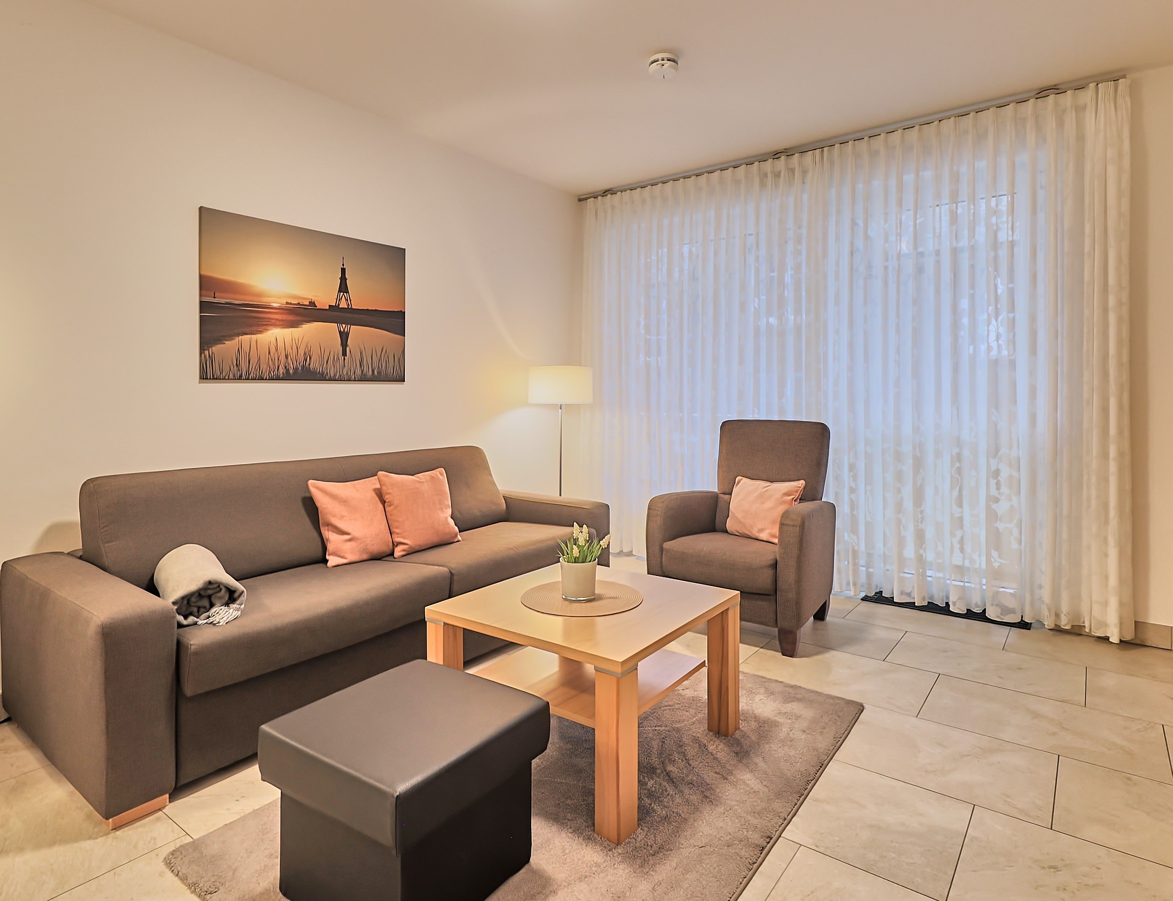Der großzügige Wohn- und Essbereich bietet eine moderne Einbauküche inklusive Grillmikrowelle, einen behaglichen Wohnbereich mit Schlafcouch (160 cm breit) sowie Zugang zum komplett möblierten Südwest-Balkon mit einer kleinen, aber spürbaren Seesicht. Das separate Schlafzimmer verfügt über einen großen Kleiderschrank und einen zweiten HDTV. Das geräumige Badezimmer ist mit Dusche und WC ausgestattet.