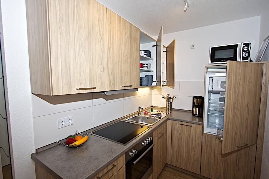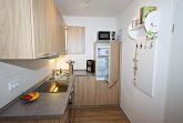 Der helle Wohnbereich, ausgestattet mit einer Eckcouch, mit dem Essbereich lädt ein zum abendlichen Zusammensein. Von hier aus kommen Sie auch auf die Südterrasse. Die Küche ist komfortable, unter anderem mit Geschirrspüler eingerichtet.