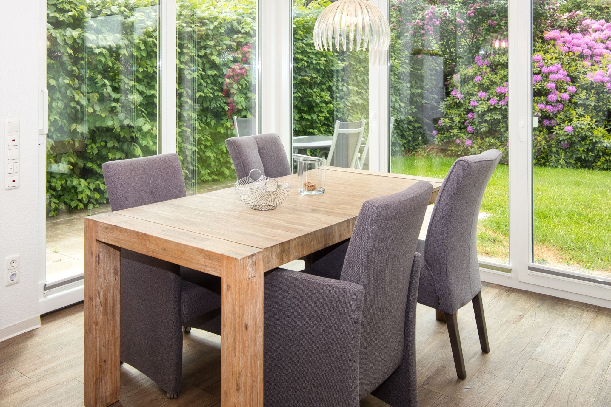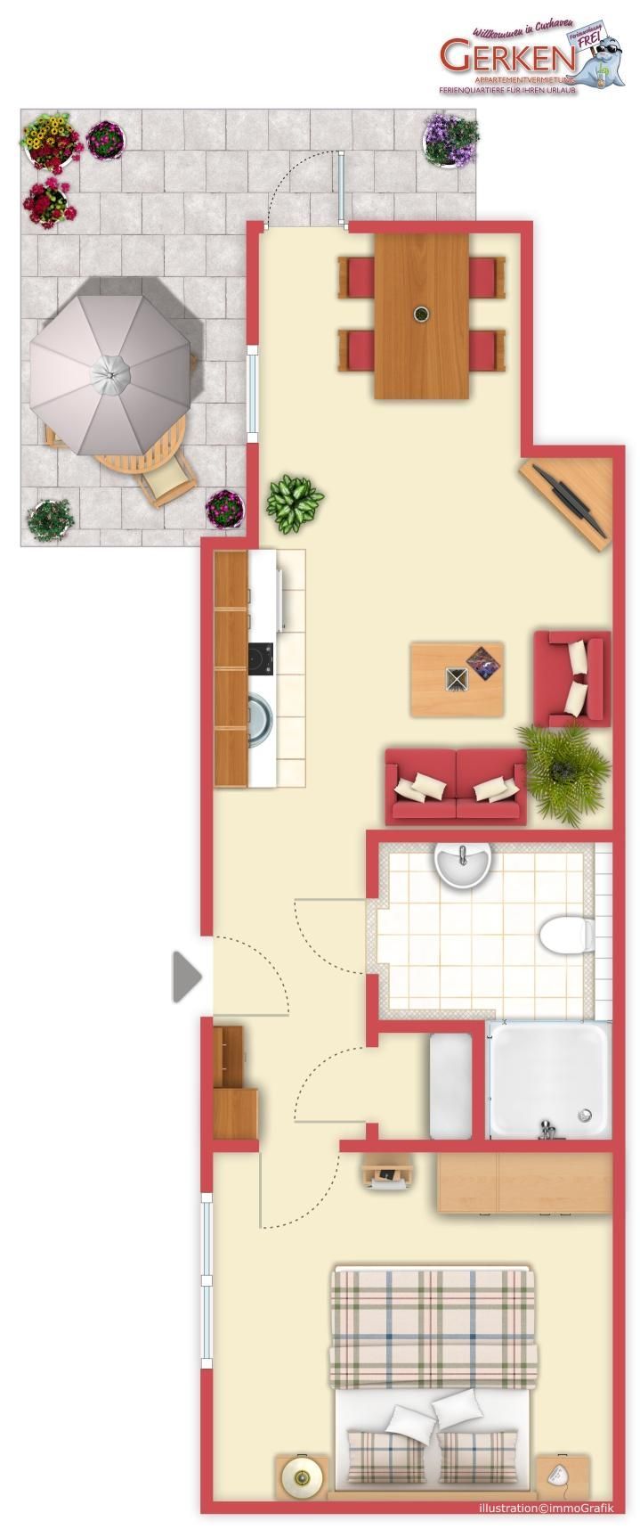 2 Zimmer Ferienwohnung am Grooten Steen 14 in Cuxhaven-Duhnen. Es erwartet Sie hier eine geschmackvolle, moderne und barrierefreie 2-Raum Ferienwohnung im Erdgeschoss mit Süd-Terrasse und Gartenanteil. Auf die Terrasse gelangen sie über den Wohn-/ Ess- und Küchenbereich. Dieser ist großzügig aufgeteilt und bietet Platz für bis zu 4 Personen. Eine große Glasfront am Essplatz zum Garten hin bietet Wintergartenatmosphäre. Eine 3. und 4. Person finden Platz auf der Schlafcouch. Die Küche ist komplett ausgestattet. Das ebenfalls geräumige Schlafzimmer ist mit einem komfortablen Boxspring Doppelbett und genügend Stauraum ausgestattet. Ein Wasch- und Trockenraum, mit Waschmaschine und Trockner steht Ihnen ebenfalls zur Verfügung.