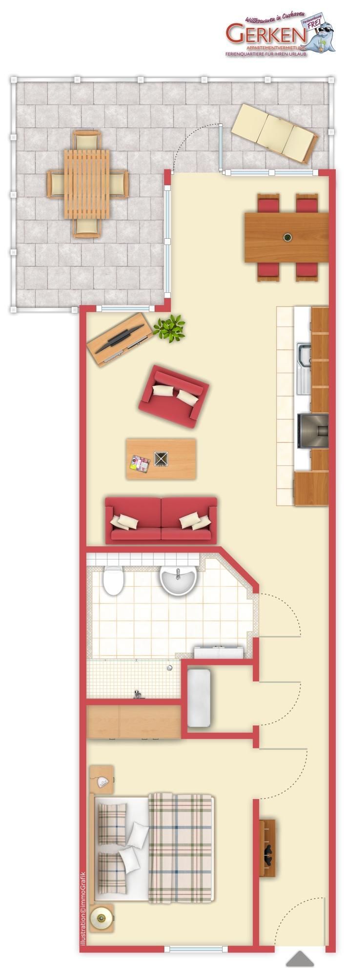 Die komplett ausgestattete Küche ermöglicht Ihnen die Zubereitung leckerer Mahlzeiten. Das geräumige Schlafzimmer beeindruckt mit einem gemütlichen Boxspring Doppelbett und ausreichend Stauraum für Ihre persönlichen Dinge.