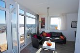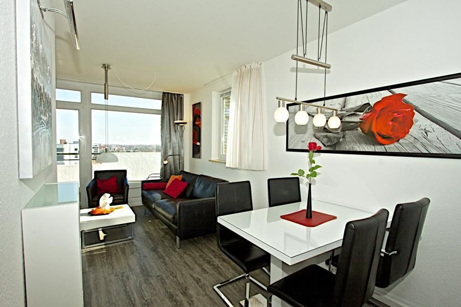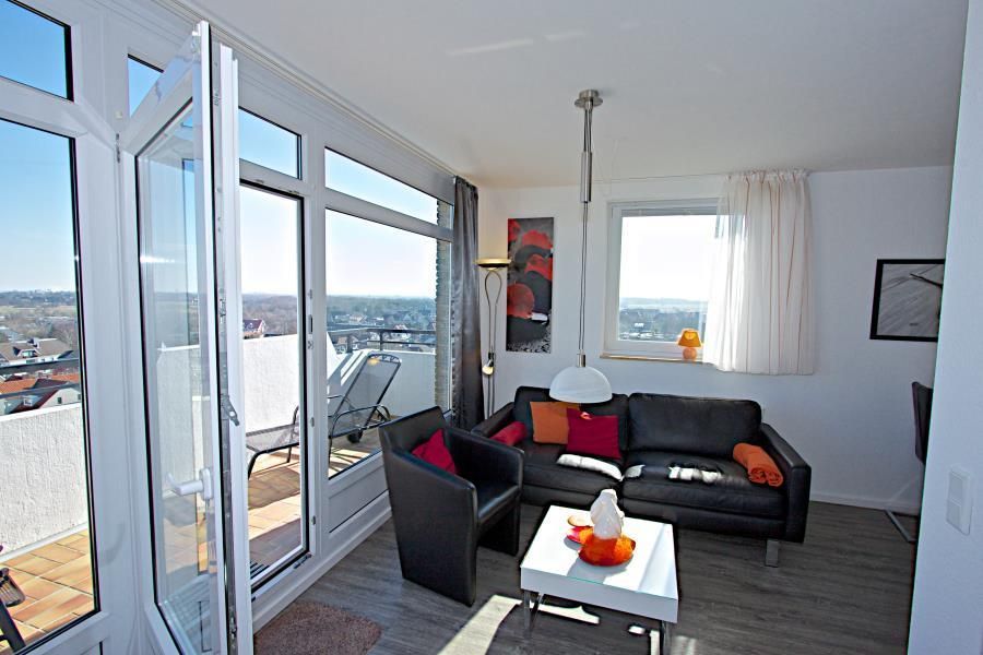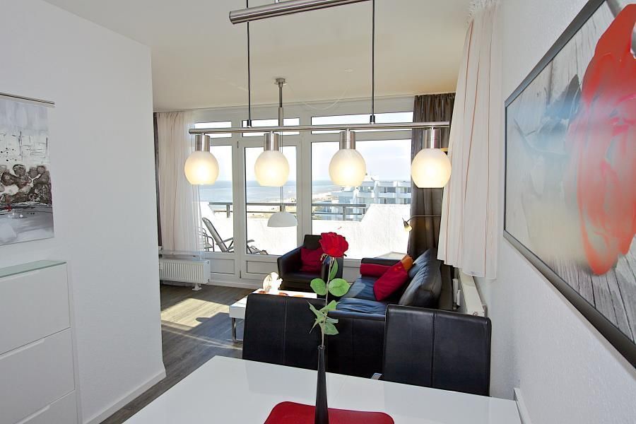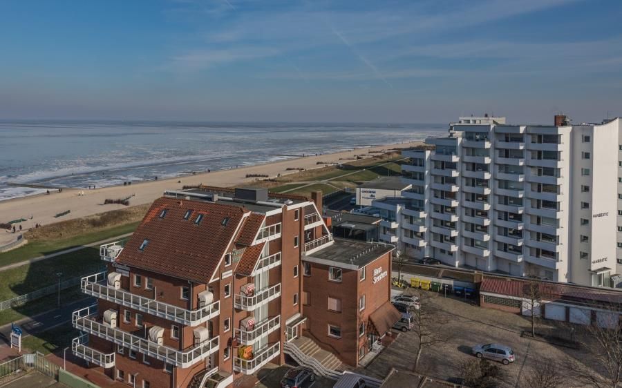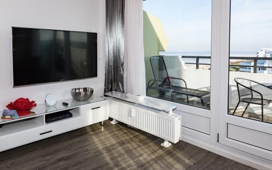 Sie genießen einen grandiosen Ausblick auf den Strand sowie auf die Nordsee mit ihren Weltschifffahrtswegen. Bei guten Wetterverhältnissen sehen sie weit nach Schleswig Holstein hinein. Der große Balkon ist großzügig möbliert, einschl. Relaxsessel und Rollliege. Nahezu aus jedem Wohnbereich des Appartements, d. h. aus den bequemen Lederpolstern heraus, vom Esstisch aus, aber auch von den feststehenden bequemen Betten in der Schlafnische haben Sie einen herrlichen Meerblick, der Sie den ganzen Tag begleitet. Die Mahlzeiten können Sie problemlos in der komplett eingerichteten Kochnische (einschl. Geschirrspüler) zubereiten, oder Sie wählen eines der im Erdgeschoss des Hauses ansässigen Restaurants. Auch die frischen Frühstücksbrötchen holen Sie bequem in der Bäckerei im Hause selbst.