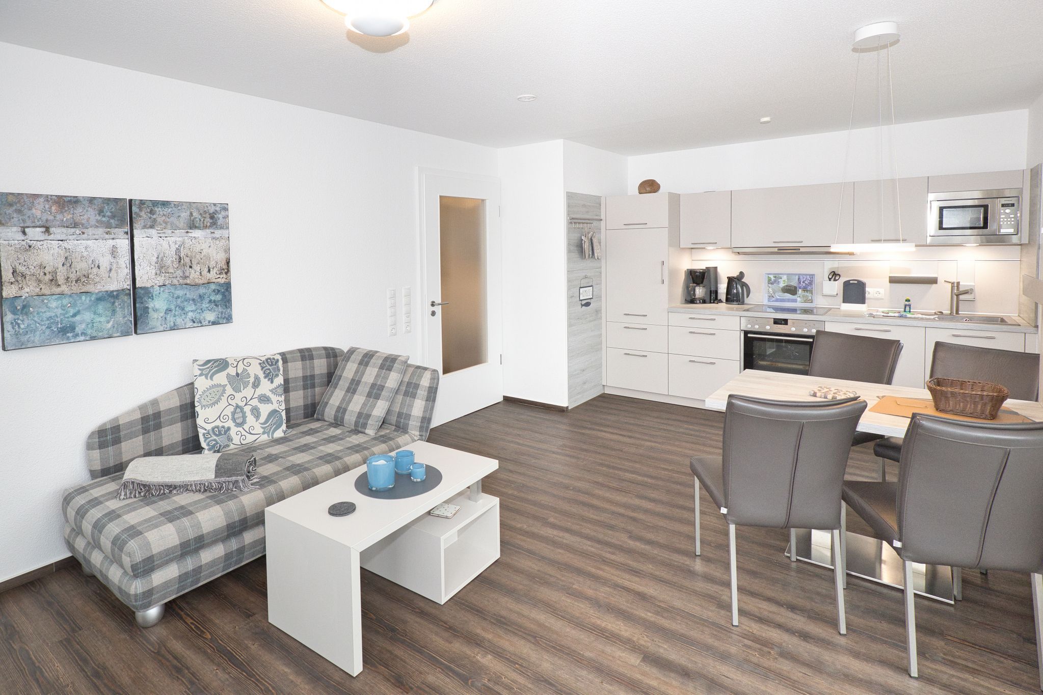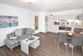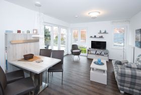 Im Wohnbereich erwartet Sie ein hochwertiges Sofa, ein gemütlicher Sessel sowie ein Marken-Radio, ein DVD-Player und ein Flachbildfernseher für Ihre Unterhaltung. Die komfortable Einbauküche befindet sich zusammen mit einem Esstisch im großen Wohnzimmer und ist unter anderem mit einem Geschirrspüler ausgestattet. Hier können Sie Ihre kulinarischen Fähigkeiten entfalten und Ihre Lieblingsgerichte zubereiten.