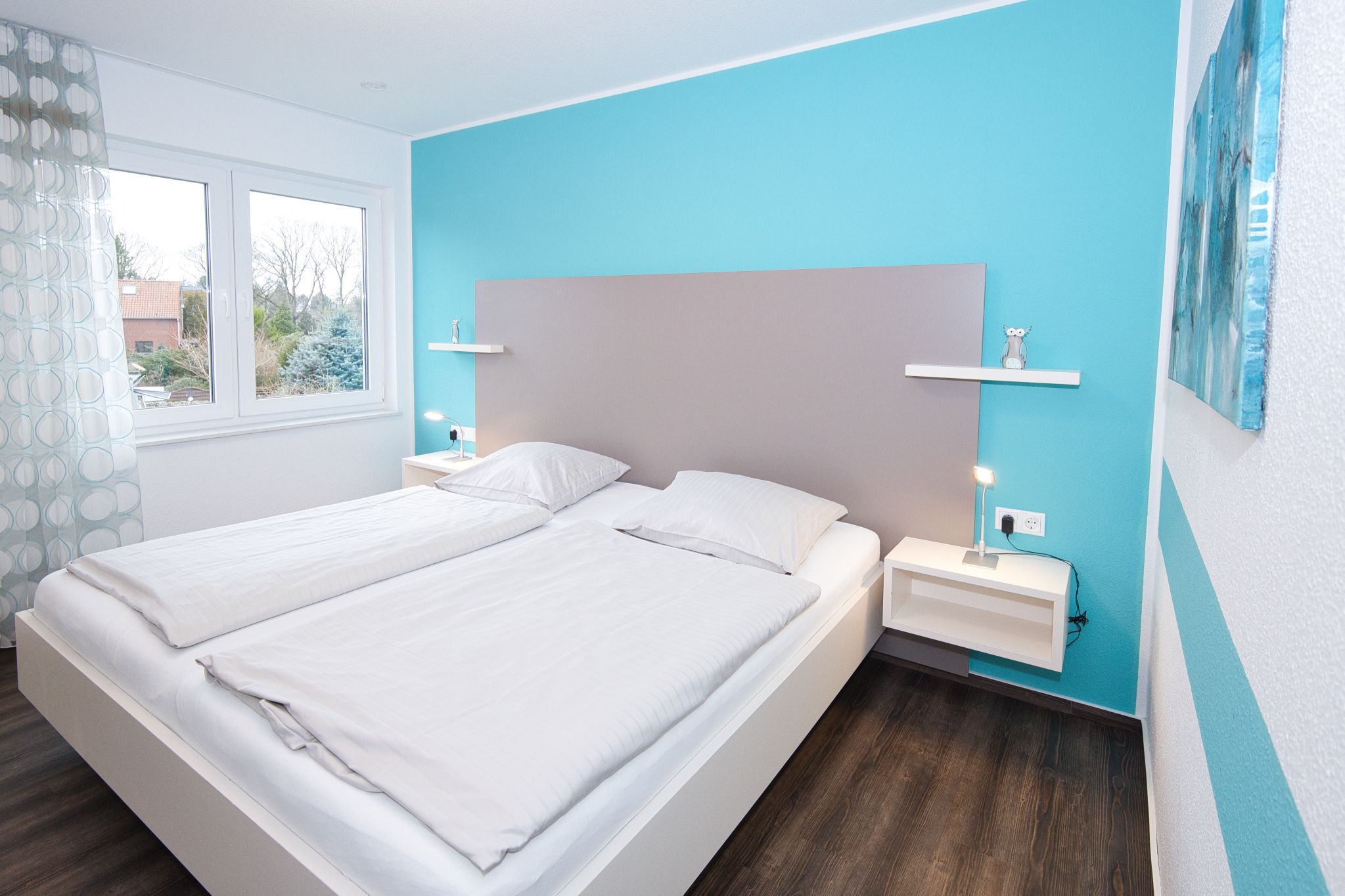 Der Schlafbereich verfügt über bequeme Betten (200x200cm) und einen großen Kleiderschrank mit zusätzlichen Ablagemöglichkeiten, damit Sie sich wie zu Hause fühlen können.