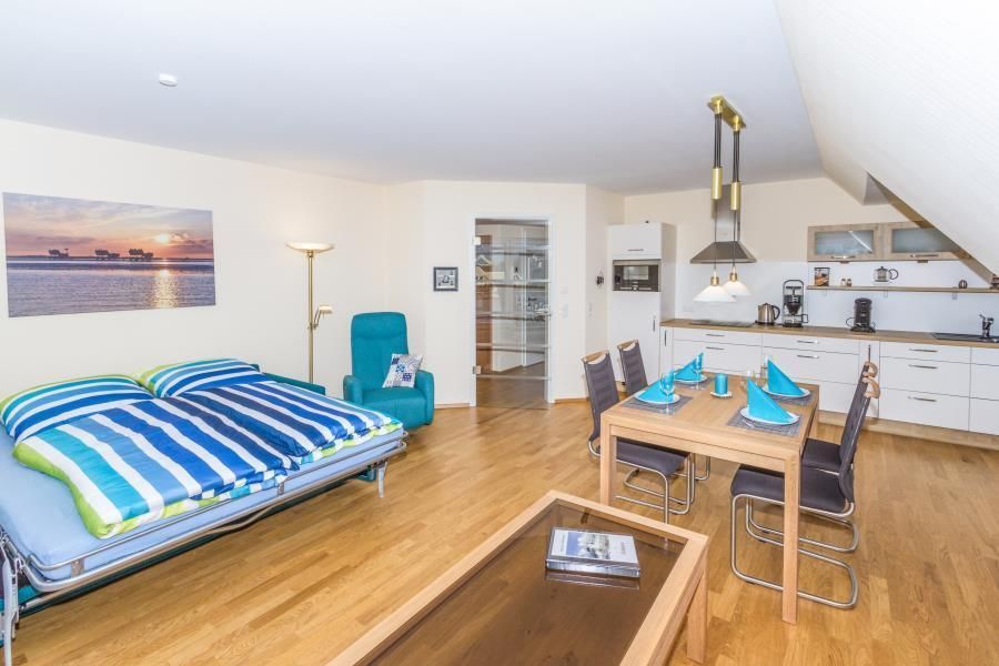 Willkommen in der Wehrbergsdüne, im 2. Stock, FeWo Nr. 8, mit einem traumhaften Blick auf das Meer. Diese exklusive Ferienwohnung erwartet Sie in einer strandnahen Lage mitten im Zentrum von Duhnen, und dennoch in einer ruhigen Umgebung. Auf 74 qm bietet diese Wohnung Platz für 2-4 Personen und verführt mit geschmackvoller, komfortabler und hochwertiger Einrichtung. Echtholzparkett und Fußbodenheizung unterstreichen das Wohlfühlambiente. Großzügige bodentiefe Fenster eröffnen sogar einen Blick auf die Nordsee. Die moderne Einbauküche bietet alles, was Sie benötigen, von der praktischen Grillmikrowelle bis hin zum Geschirrspüler und der Gefrierkombination.