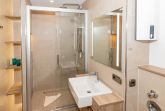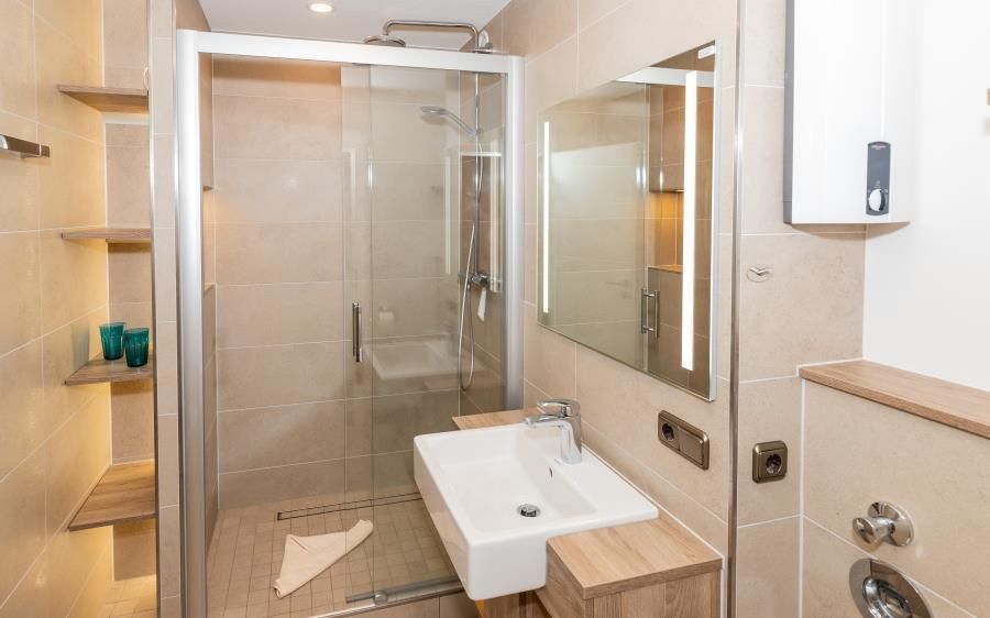Ein modernes Bad mit großer Dusche und individuell beleuchteten Elementen, sowie TV, HiFi-Anlage und DVD-Player im Wohnbereich runden das umfangreiche Angebot des Appartements ab. Die Couch im Wohnbereich lässt sich schnell in einen dritten Schlafplatz mit bequemer Matratze verwandeln. Das Bettzeug liegt griffbereit im Bettkasten unter der Couch.