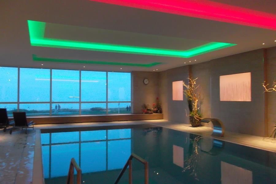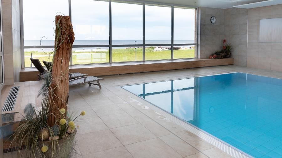 Im ersten Geschoss des Hauses stehen Ihnen zudem ein großes Schwimmbad und ein Wellnessbereich zur Verfügung. Im Becken können Sie ruhig Ihre Bahnen schwimmen oder die Gegenstromanlage nutzen. Zum Wohlfühlen trägt ein Wasserfall im Schwimmbad bei, die kostenfreie Sauna und das Solarium laden zum Entspannen ein. Aus dem Schwimmbad und dem Vorraum der Sauna können Sie den direkten Blick auf das Meer genießen. Es ist die Hausordnung hinsichtlich Schließzeiten zu beachten.