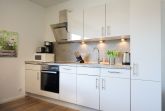 Pier 12 - Ferienwohnung Nr. 3 im haus Pier 12. Die Wohnung ist für max. 4 Personen ausgelegt. Das Schlafzimmer ist mit zwei Einzelbetten, die zu einem Doppelbett zusammenschiebbar sind, ausgestattet. Im Wohnraum ist noch eine Boxspringschlafcouch für 2 Personen vorhanden. Das Wohnzimmer verfügt über eine gemütliche Sitzecke und einen LED Flat-Screen TV sowie eine offene, voll ausgestattete, Küche mit Spülmaschine, Herd mit Cerankochfeld und Backofen, Mikrowelle, Toaster, Kaffeemaschine, Wasserkocher und Geschirr. Der Wohnzimmertisch ist zu einem großzügigen Essplatz für bis zu vier Personen variabel umfunktionierbar. Das Tageslichtbad hat eine Dusche und WC. Weiterhin hat die Wohnung eine schöne große sonnige Terrasse mit Terrassenmöbeln und Blick in den Garten.