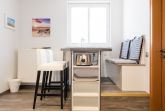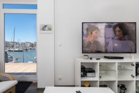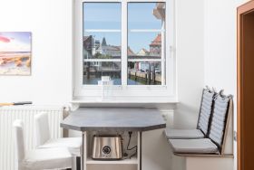Im Schlafzimmer mit Boxspringbetten haben Sie nicht nur einen tollen Blick auf den Marinahafen sondern auch sehr gute Staukapazitäten. Das Badezimmer verfügt über eine große Dusche und ist gut ausgestattet. Der Wohn- und Essbereich ist für 4 Personen eingerichtet und bietet mit dem Schlafsofa zwei weiteren Personen eine komfortable Schlafmöglichkeit. Kinderhochstuhl und Kinderbett (Hauck) stehen kostenlos zur Verfügung. Im Flur zum Eingang der Wohnung steht Ihnen noch ein weiteres Bad in Form eines Gäste/WC zur Verfügung. Auch eine Waschmaschine und Wäscheständer sind vorhanden.