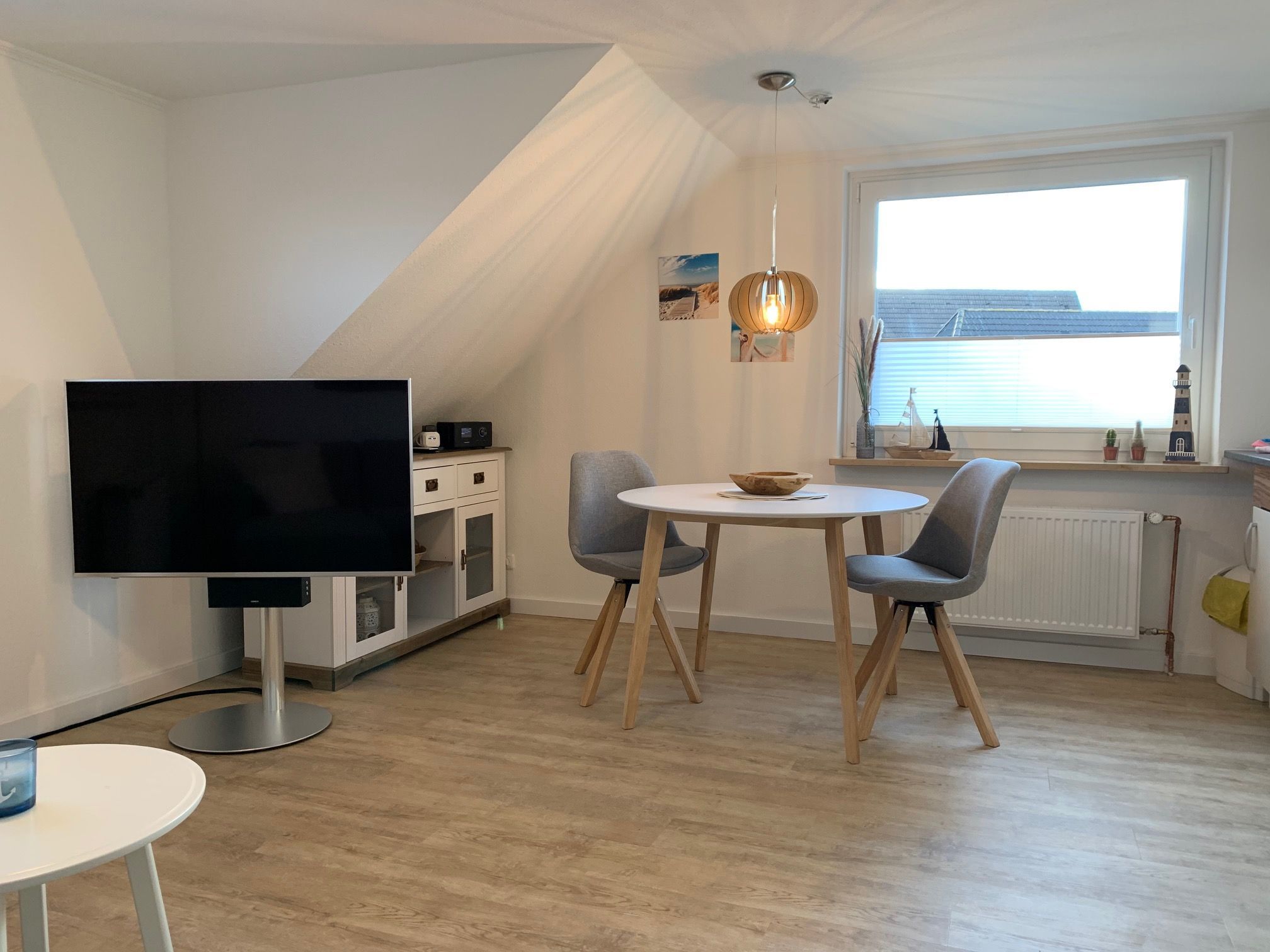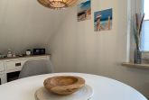 Hier in zentraler Lage und strandnaher Lage von Duhnen erwartet Sie eine gemütliche Ferienwohnung - FeWo 2- . Die Ferienwohnung im 1. Obergeschoss rechts ist komfortabel und gemütlich eingerichtet. Die Ferienwohnung hat einen gemeinsamen Wohn- / Ess- und Küchenbereich. Ausgestattet mit einer gut ausgestatteten Küche, einem Essplatz mit bis zu 2 Sitzmöglichkeiten und einem gemütlichen Sofa. Die Ferienwohnung ist für 2 Personen sehr gut geeignet. Die Böden sind mit hochwertigen Vinylboden ausgelegt. Ein großer 49 Zoll Panasonic Smart HDTV mit GENEVA Soundsystem, mit Netflix und Co., eine WLAN Internetverbindung, ein Internetradio, eine zusätzliche Kaffee-Padmaschine, eine Waschmaschine und Trockner (auf Voranmeldung im Haus zu nutzen) rundet unser Angebot für Sie ab. Sie benötigen eine Mikrowelle? Kein Problem, geben Sie uns eine kurze Info und wir stellen diese zur Anreise in die Wohnung. Für die Monate Mai bis September steht Ihnen noch ein rotorlose Ventilator mit Luftreiniger zur Verfügung.
