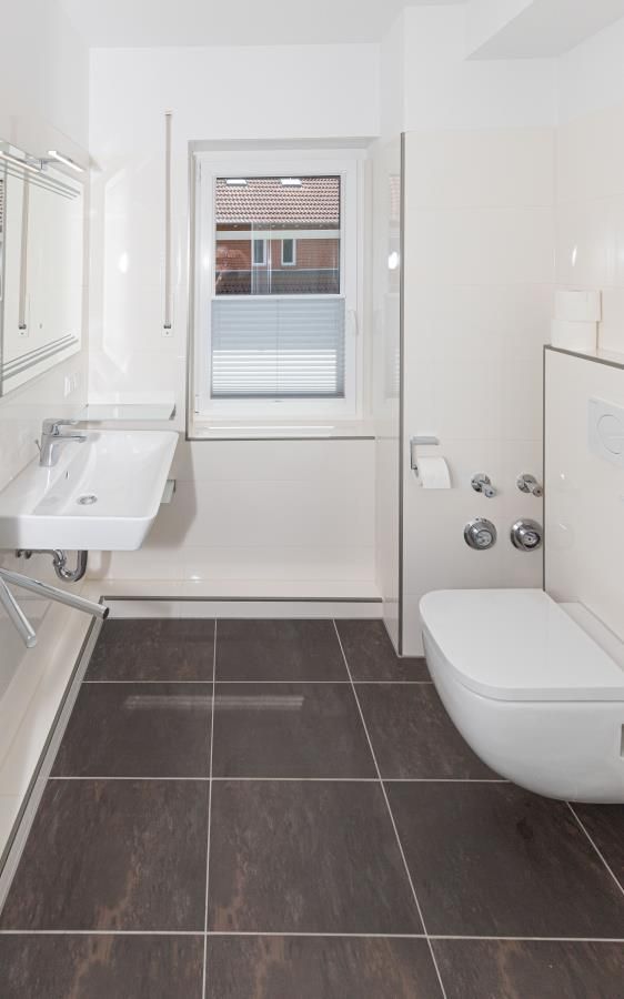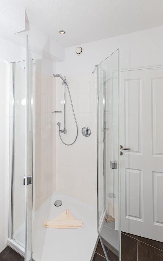 Das moderne Tageslichtbad verfügt über eine bodengleiche Dusche, WC, sowie einen Spiegel mit integrierten Bluetooth-Lautsprechern ein kleines Extra für einen entspannten Start in den Tag.