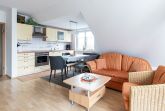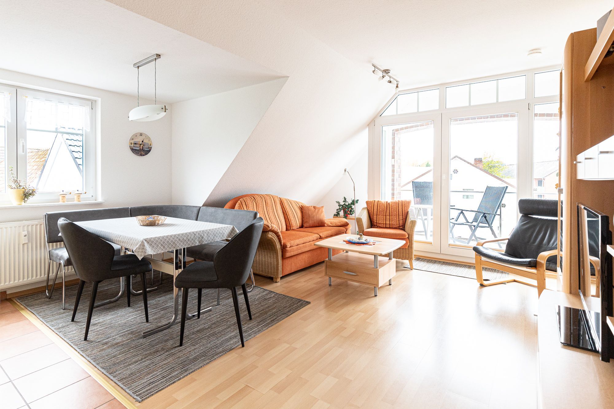 Die Wohnung verfügt über ein geräumiges Schlafzimmer mit einem großen Kleiderschrank, damit Sie sich wie zu Hause fühlen können. Das Duschbad ist mit einer Fußbodenheizung und einem Fenster ausgestattet, um Ihnen ein angenehmes und erfrischendes Erlebnis zu bieten. Der gemütliche Wohnbereich ist großzügig gestaltet und bietet mit einer 4,60 m langen Fensterfront eine traumhafte Aussicht auf die Umgebung. Hier können Sie sich entspannen und in wenigen Schritten die Nordsee genießen. Der Essbereich bietet genügend Platz für 2 Personen und ist der ideale Ort für ein gemütliches Abendessen. Der Balkon mit Balkonmöbeln und einer Sonnenschutzmarkise, die Sie bequem per Fernbedienung bedienen können, lädt zum Verweilen und Entspannen ein.