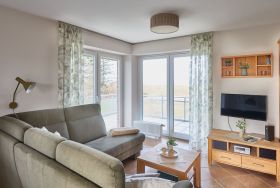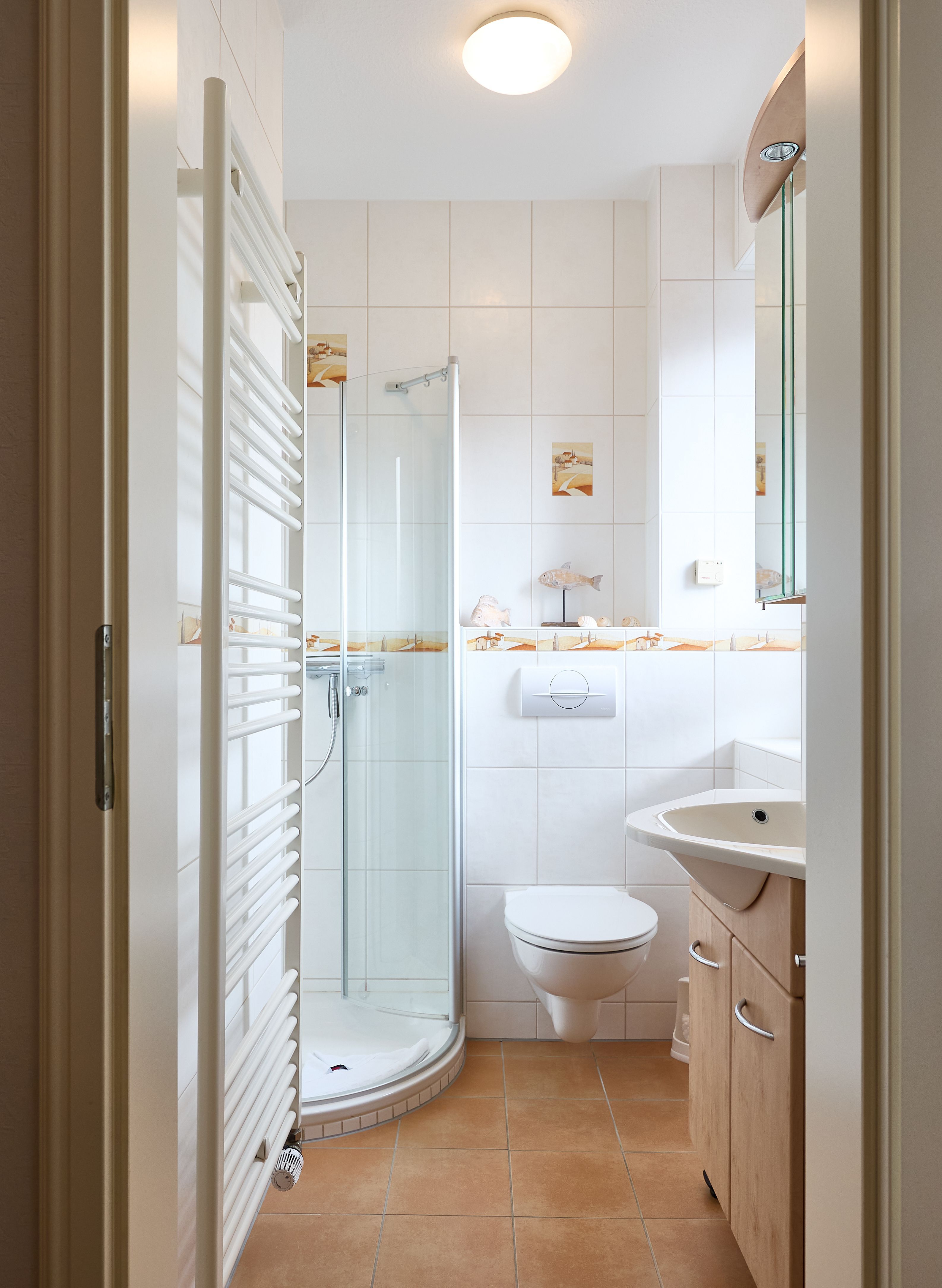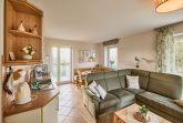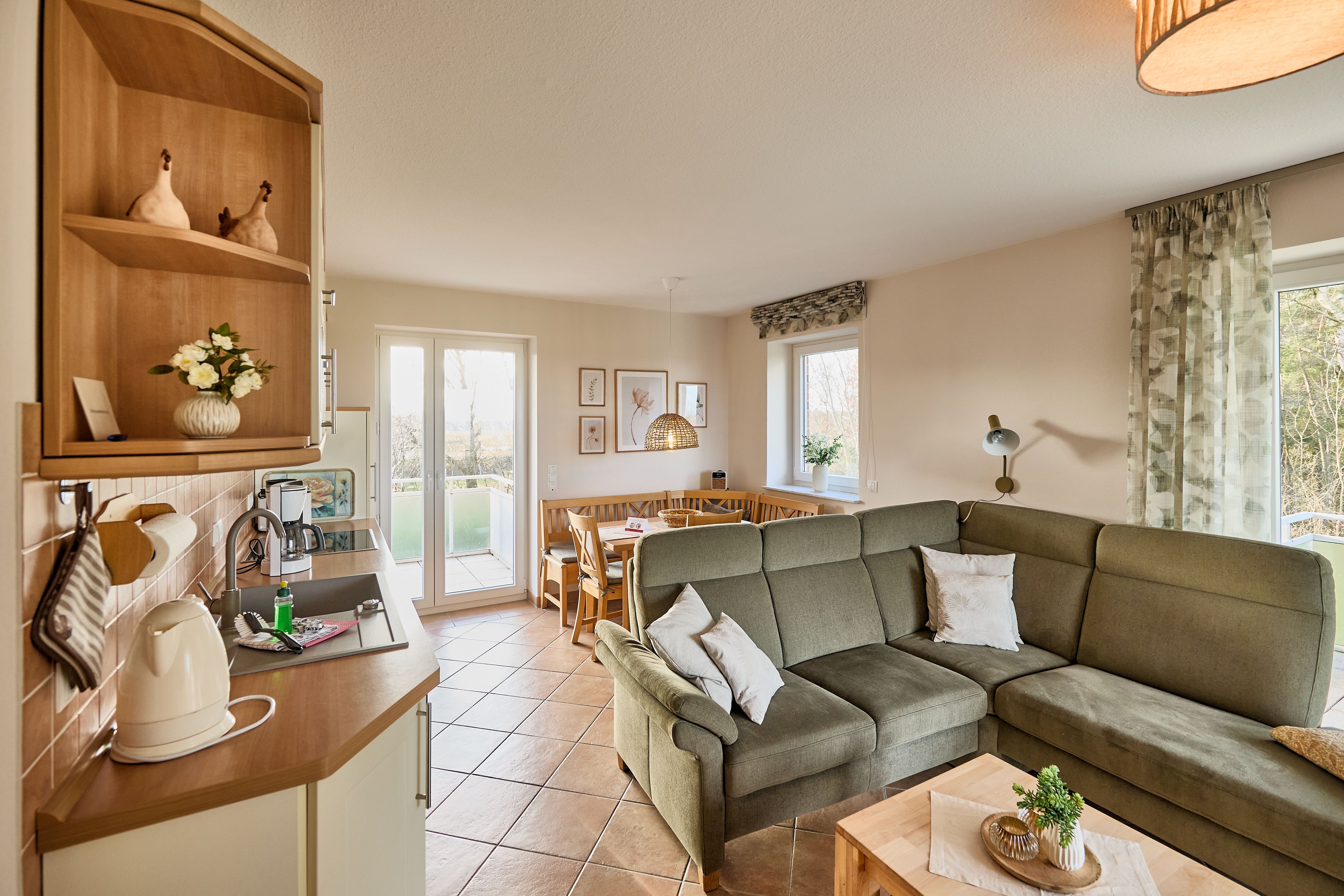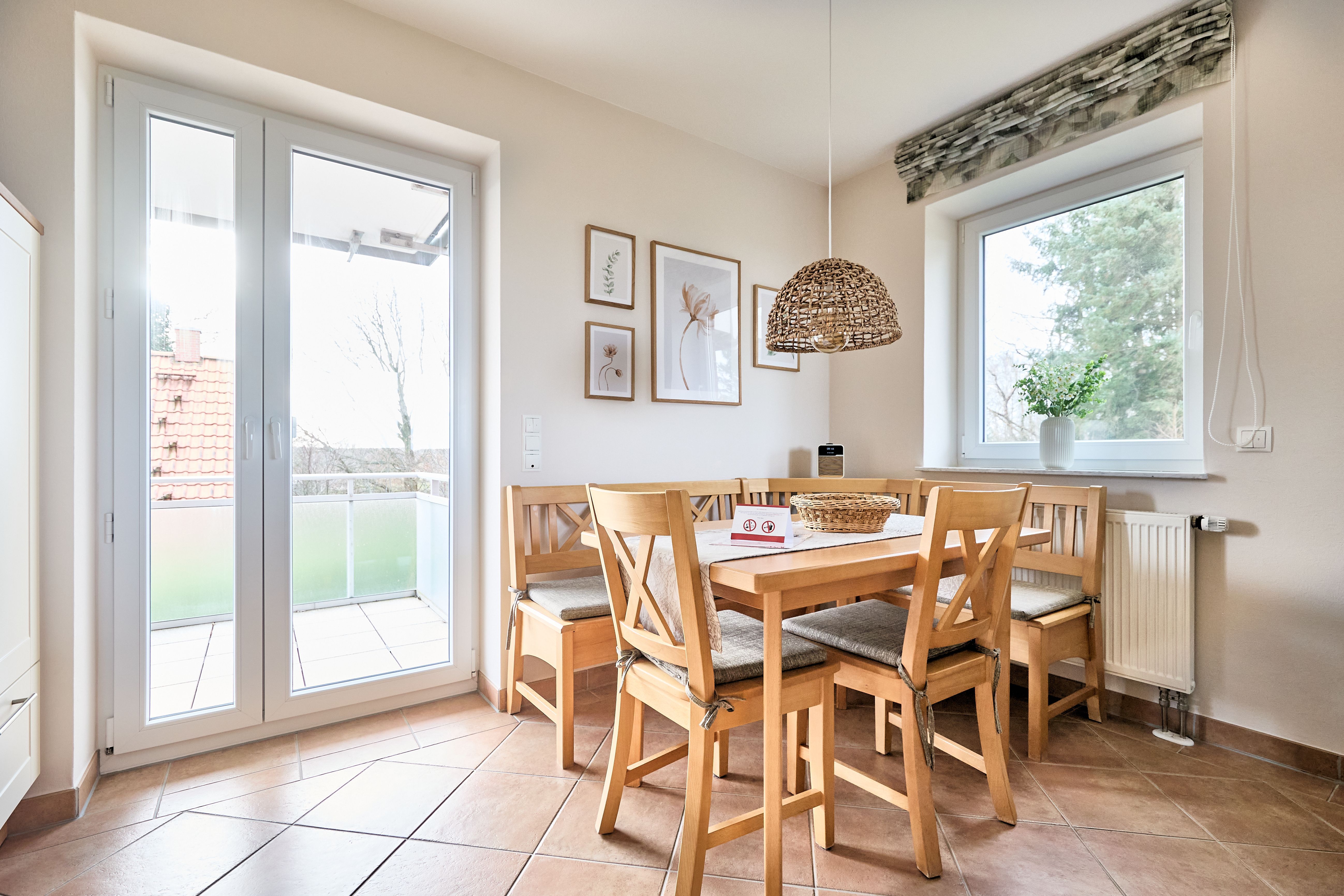 Am Ende des Flures erwartet Sie ein gemütlicher Wohn- und Essbereich. Hier finden Sie eine großzügig ausgestattete Einbauküche mit allen Extras, die Sie benötigen. Dieser Bereich lädt Sie ein, morgendliche Frühstücke zu genießen und abends Spiele zu spielen. Von hier aus gelangen Sie auf die beiden wunderschönen Balkone. Der Süd-Ost Balkon bietet Ihnen den ganzen Tag über Sonne, während der Nord-West Balkon eine direkte Seesicht ermöglicht.