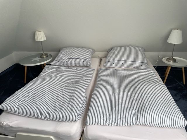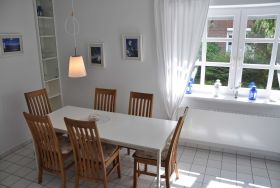 Doppelhaushälfte, zentrale Lage, ruhige Umgebung, mit kleinem Garten und Terrasse in Südlage, im Erdgeschoß: separate Küche (Mikrowelle, Herd, Backofen, Spülmaschine, Kaffeemaschine, Senseo-Kaffeepadmaschine, Wasserkocher, Toaster), Gäste WC, Wohn-/Esszimmer, im Obergeschoss: zwei Schlafzimmer mit je 2 Betten (ein Schlafzimmer mit Zustellmöglichkeit für ein Kinderbett, Bad: Dusche (Glastür)/WC, Waschmaschine, im Dachgeschoss ein Schlafzimmer mit 2 Einzelbetten (ebenfalls mit Kinderbett möglich).
