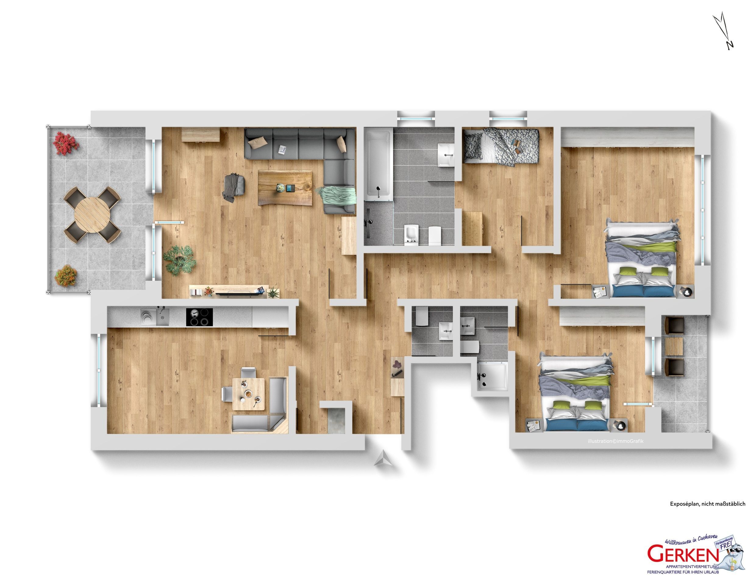 Insgesamt drei Schlafbereiche mit komfortablen Boxspring-Doppelbetten (2x 180cm, 1x 120cm) sorgen für erholsame Nächte. Das Badezimmer/WC verfügt über eine Dusche, während ein zweiter Bereich mit Badewanne und WC zur Duschnutzung einlädt. Hier dran befindet sich auch der 3. Schlafbereich. Sozusagen als Durchgangszimmer zum Hauptbad. Der 2. Schlafbereich mit dem Zugang zum eigenen Badbereich hat zudem noch eine überdachte Loggia.