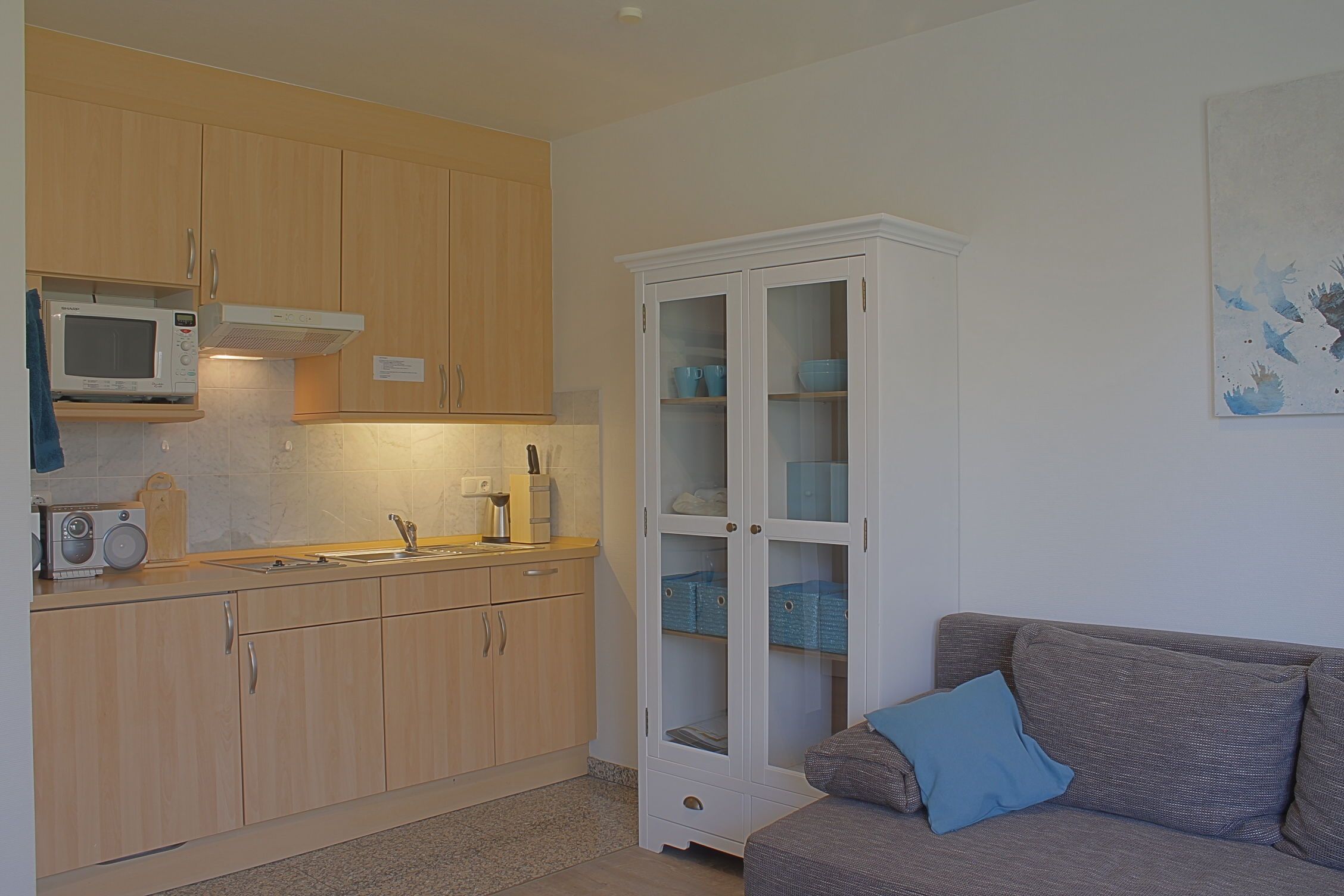 Die Küchenzeile ist mit allem eingerichtet, was man so braucht. Von der Kaffeemaschine bis zum Toaster ist alles vorhanden.