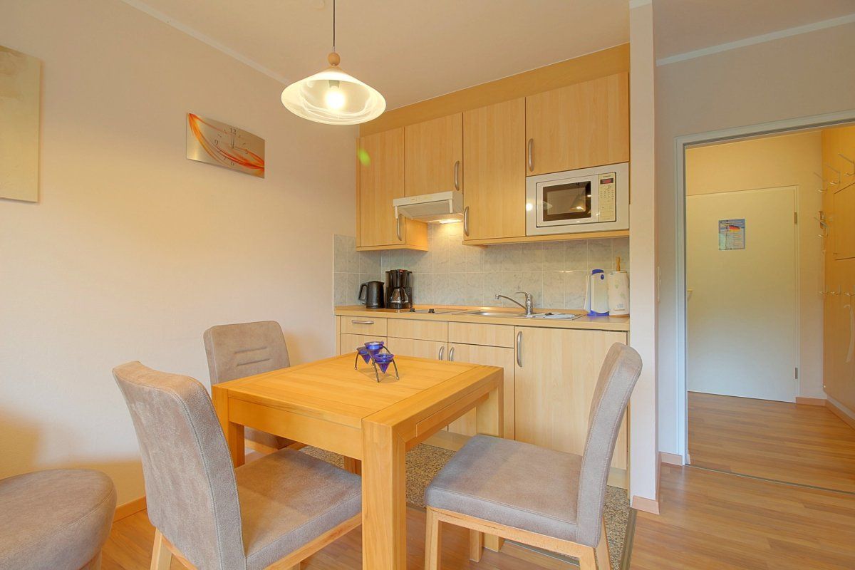 Die Küchenzeile ist mit allem eingerichtet, was man so braucht. Von der Kaffeemaschine bis zum Toaster ist alles vorhanden.
