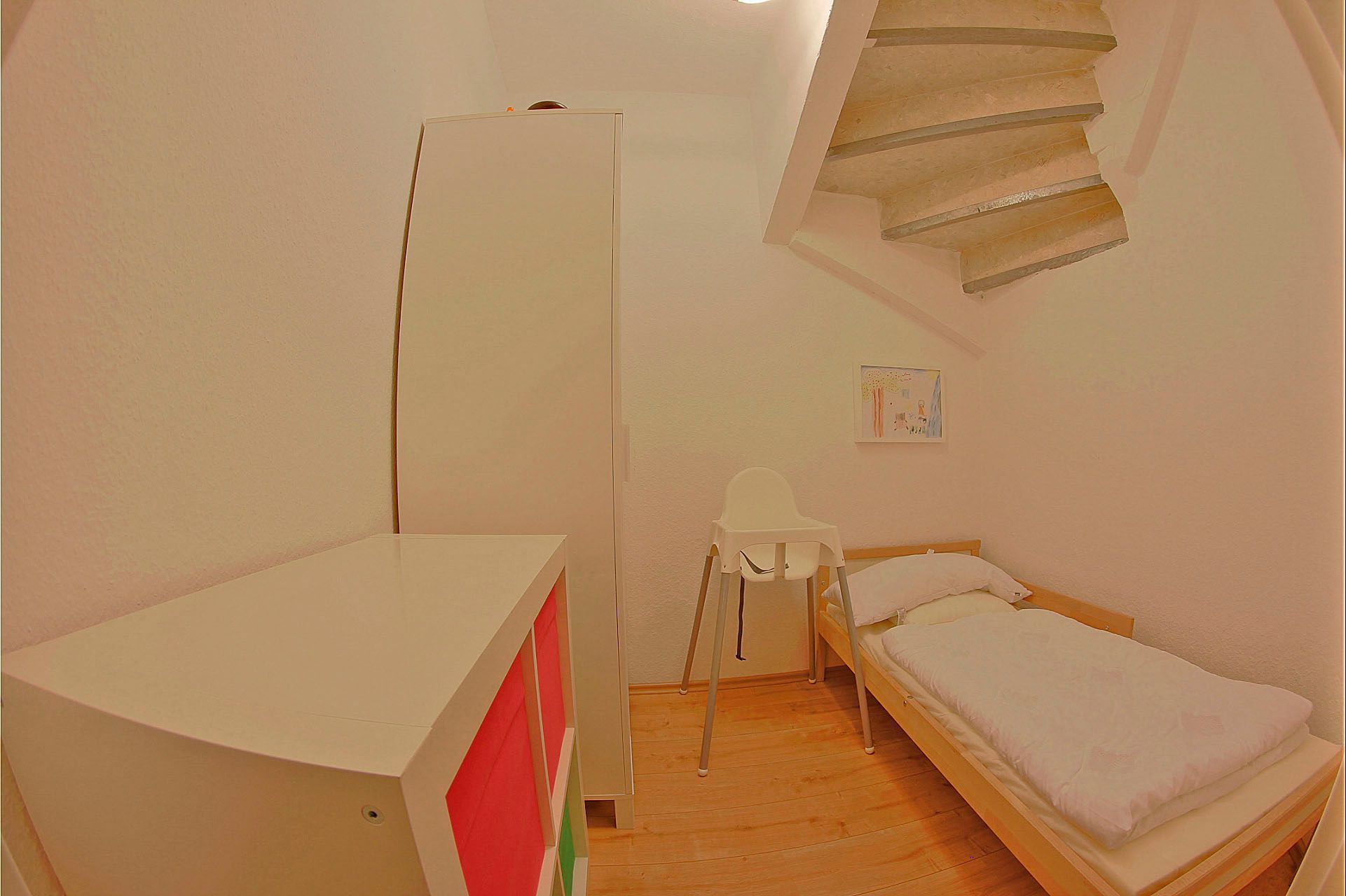Schlafzimmer mit Doppelbett, großem Kleiderschrak, Fliegengitter, kleiner Raum unter der Treppe als Schlafbereich für ein Kleinkind mit Kinderbett, Duschbad mit Waschmaschine.