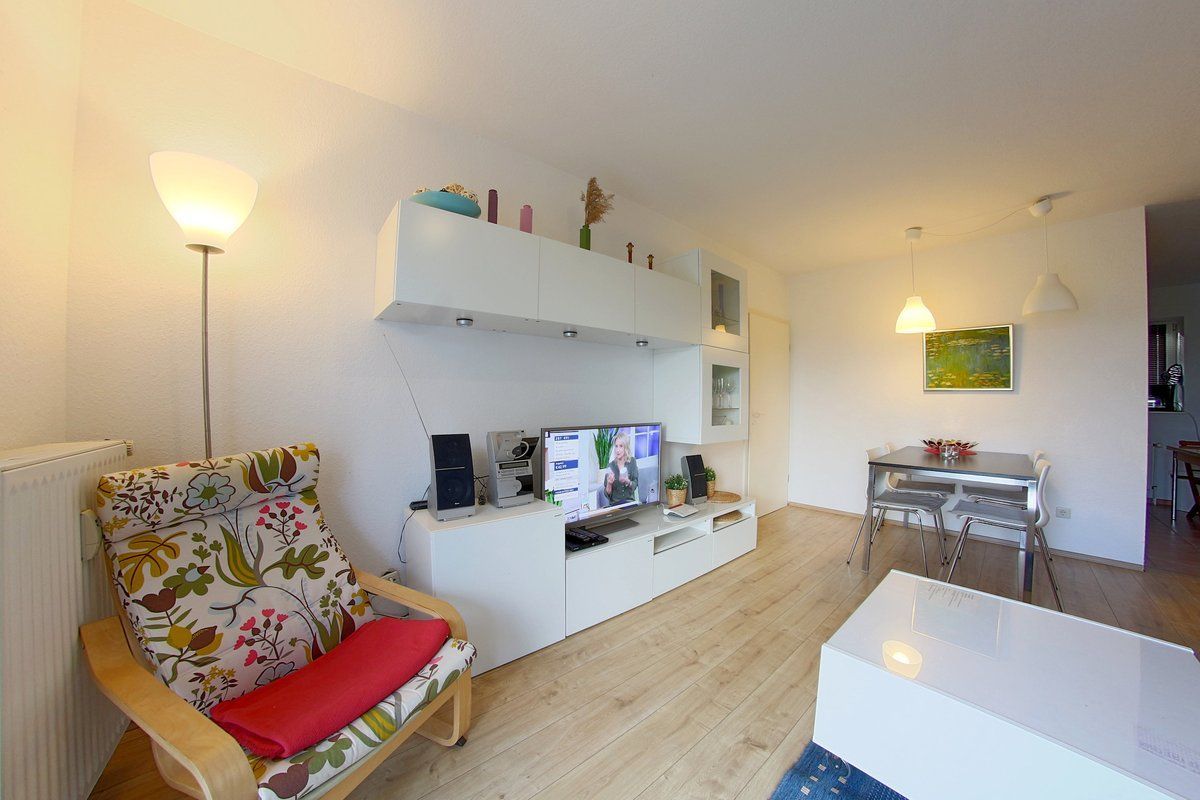 Wohnzimmer mit LCD-TV, Radioanlage, Sofa (als bequemes Doppelbett nutzbar), Tisch mit vier Stühlen, Schrankwand.