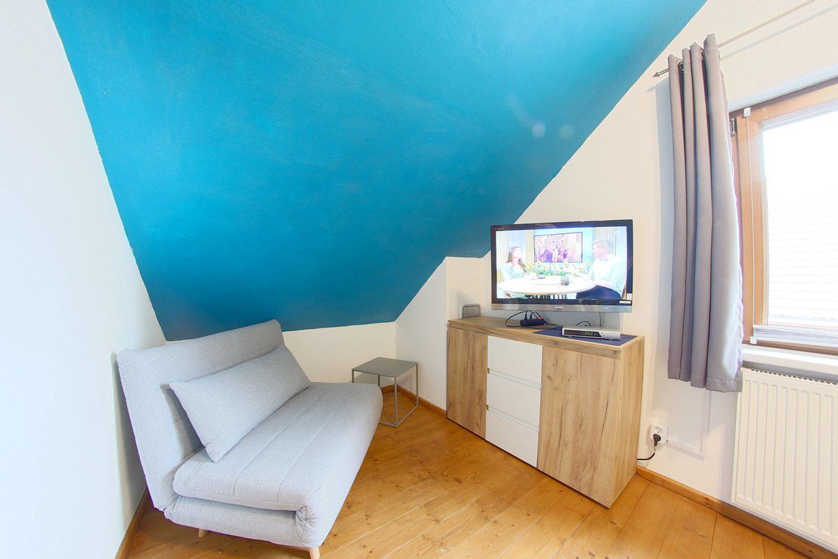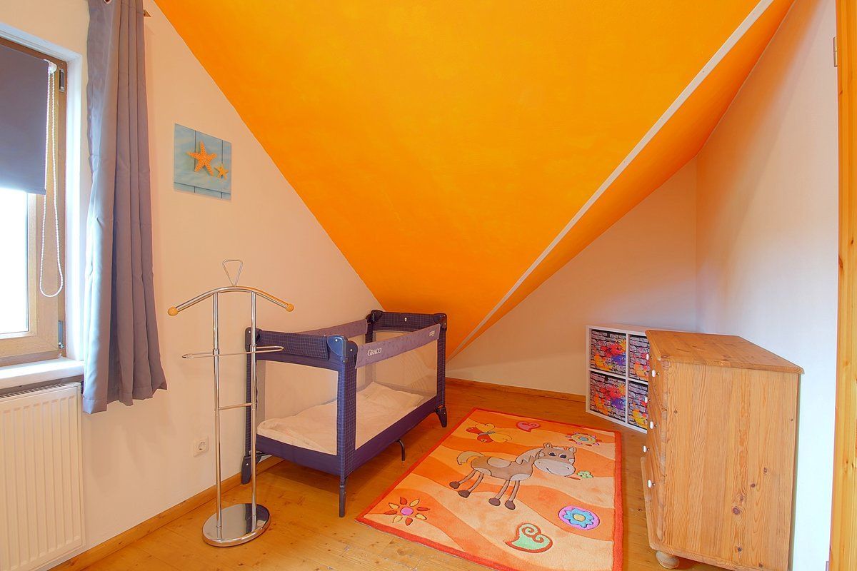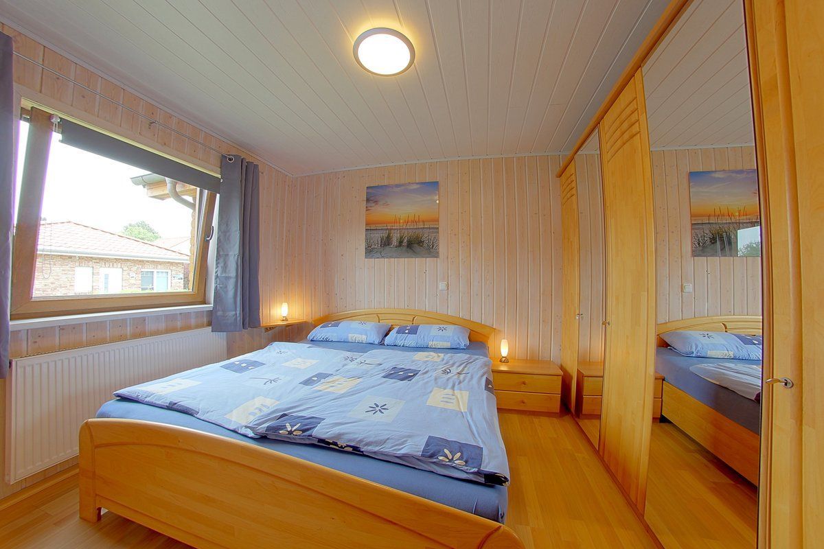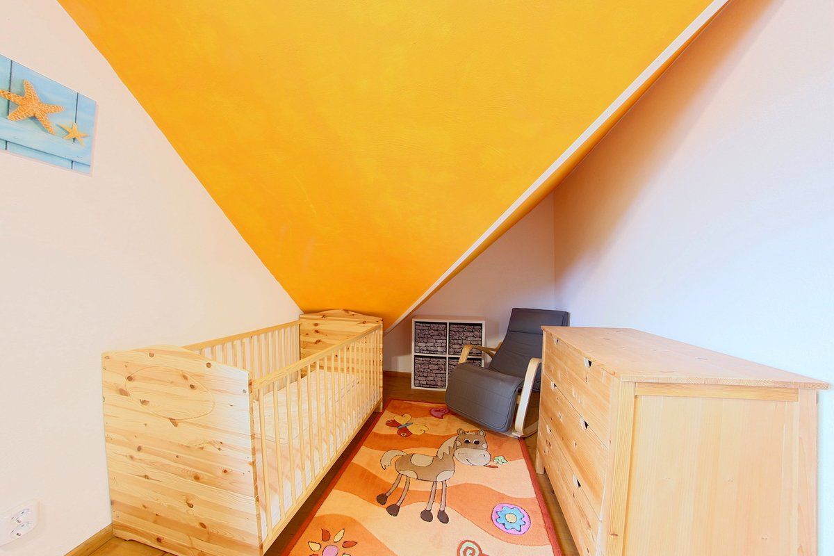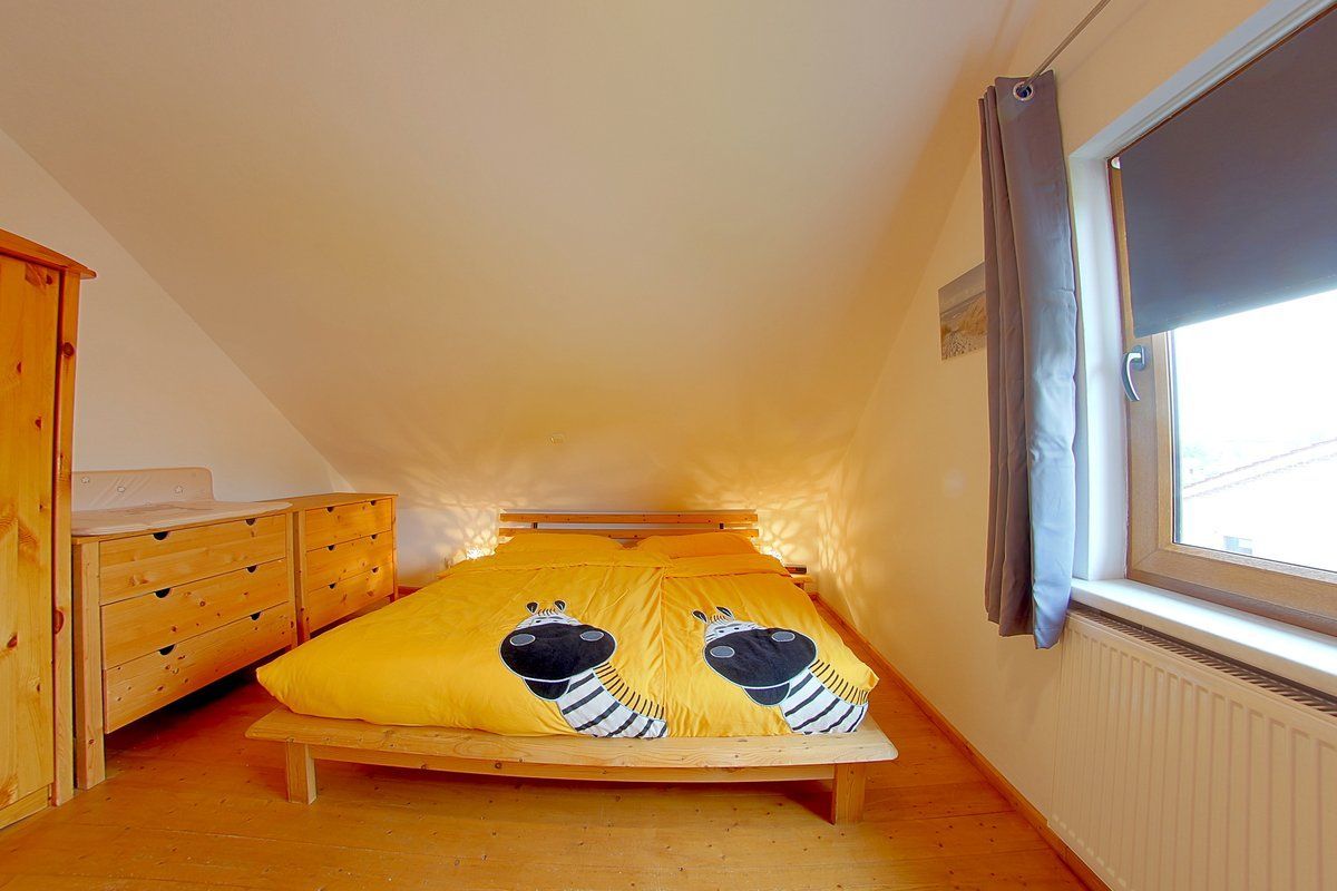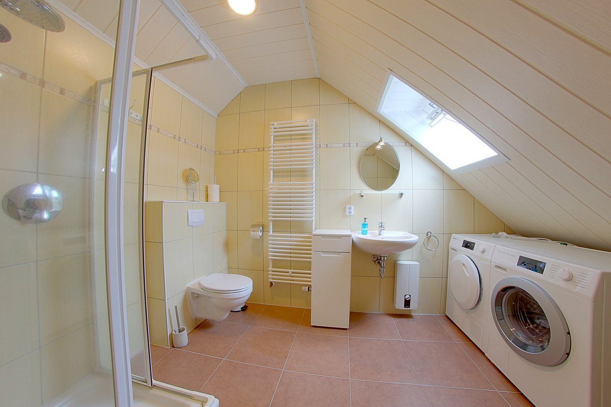 Im Erdgeschoss befindet sich ein modernes Duschbad mit Sauna, sowie ein Schlafzimmer mit Doppelbett (1,80 x 2,00 m). Im Obergeschoss befinden sich zwei weitere Schlafzimmer mit jeweils einem Doppelbett (1,80 x 2,00 m) und ein Kinderbett, sowie einer Wickelauflage. Das Duschbad im Obergeschoss bietet außerdem eine Waschmaschine und Wäschetrockner für unsere Gäste.
