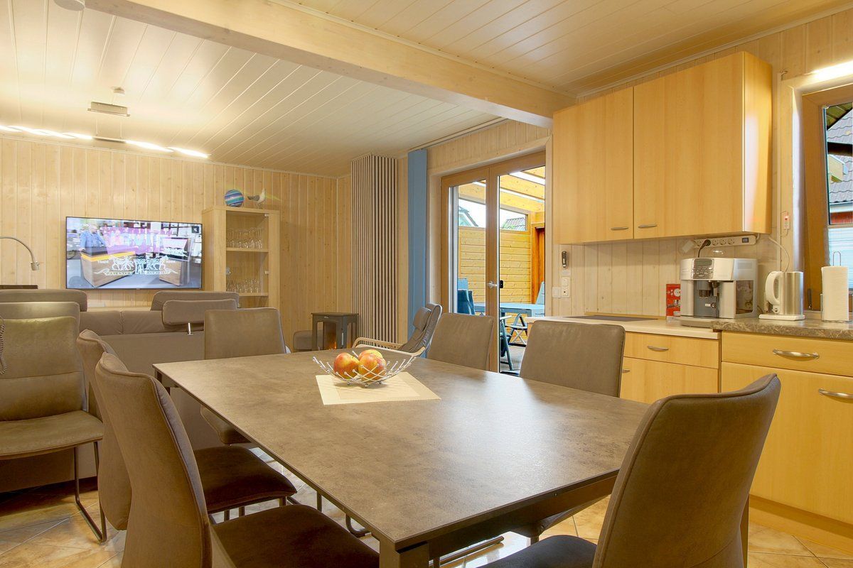 Im Erdgeschoss gibt es einen offenen Wohn- und Essbereich mit Elektrokamin und komplett ausgestatteter moderner Einbauküche, in der es an nichts fehlt.