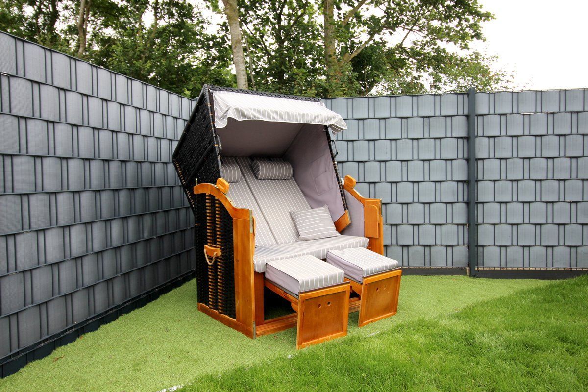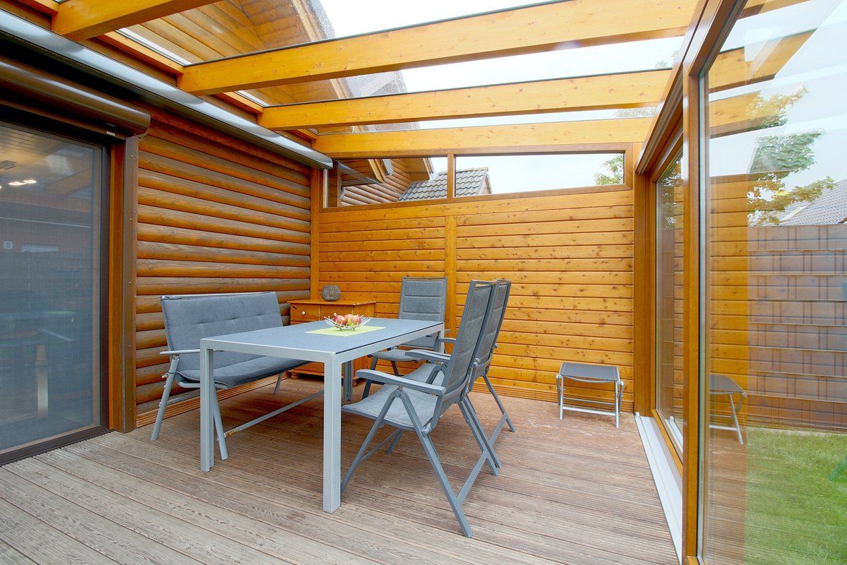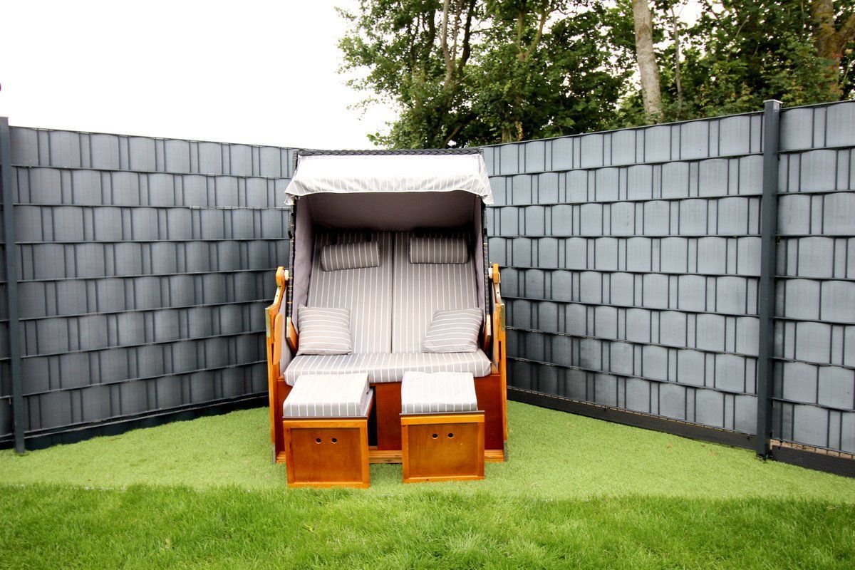 Vom Wohnzimmer aus gelangen Sie auf die großzügige überdachte Südterrasse mit Gartenmöbeln, Sonnenliegen und Strandkorb. Das Grundstück ist eingezäunt.