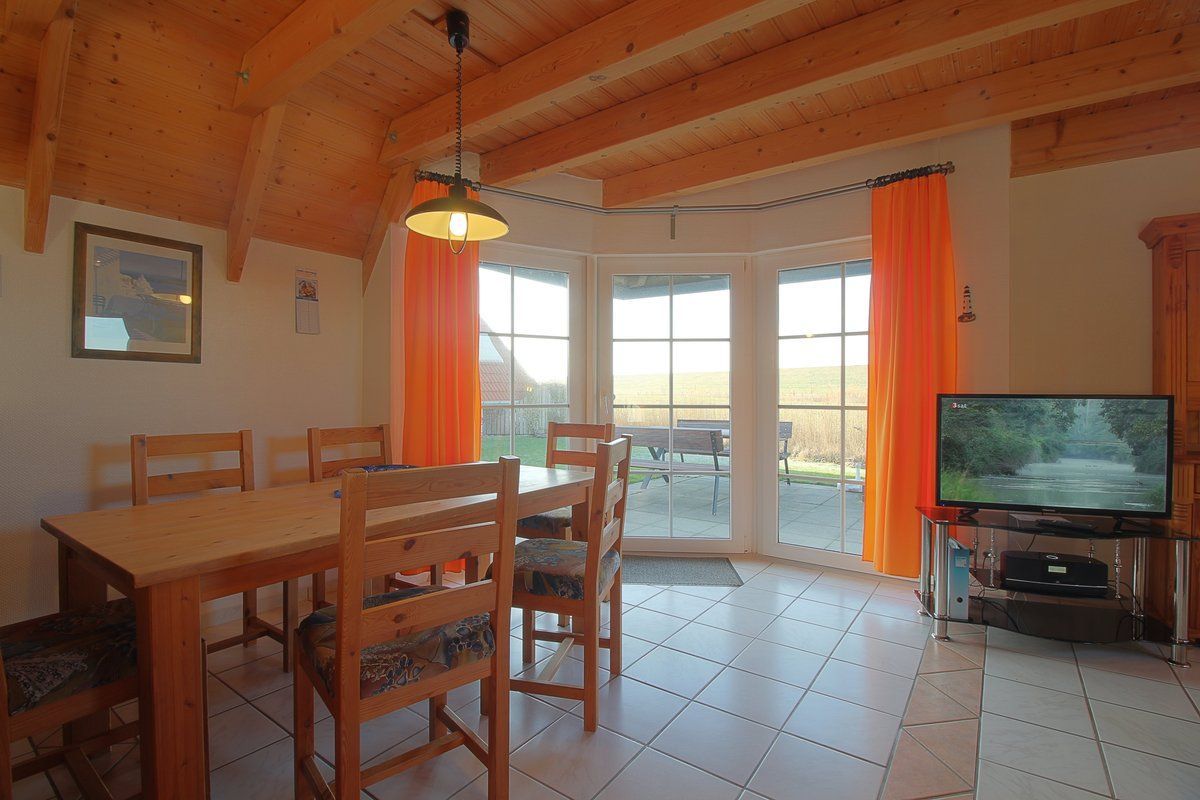 Im komplett gefliesten Wohnbereich gibt es einen offenen Wohnbereich mit Flat-TV, Essplatz und Küche mit komplett ausgestatteter Einbauküche mit Geschirrspüler, in der es an nichts fehlt. Vom Wohnraum aus geht es auf die sonnige Terrasse mit Abstellraum und Gartenmöbeln und tollem Blick auf den Deich.