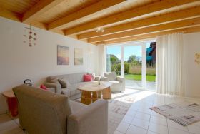 Familiengerecht eingerichtetes Haus für den Nordseeurlaub. Im komplett gefliesten Erdgeschoss gibt es einen offenen Wohn- Essbereich mit Flat-TV und Küche mit komplett ausgestatteter Einbauküche mit Geschirrspüler. Vom Wohnraum aus geht es direkt auf die sonnige Terrasse.