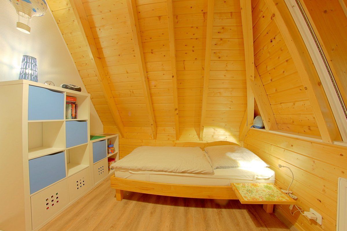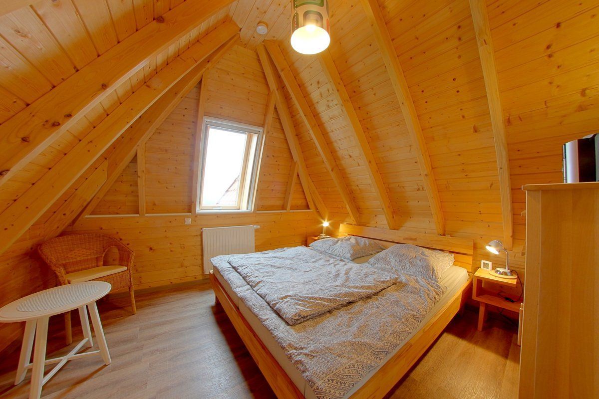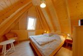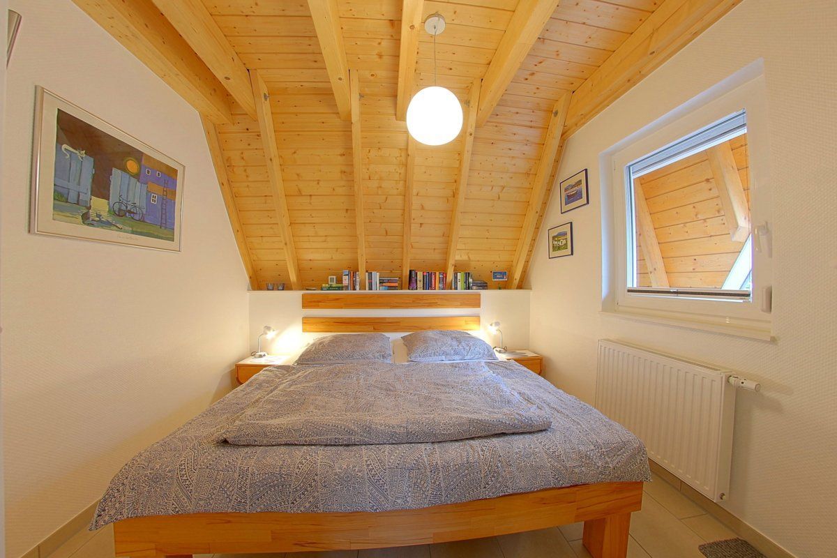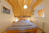 Das erste Schlafzimmer im Obergeschoss verfügt ebenfalls über ein massives Buchenholzbett (180 x 200 cm), 5-Reflex-Zonen-Lattenroste und Matratzen sowie zwei Nachtschränke mit ausreichend Beleuchtung. Ein Korbsessel und ein kleiner Tisch runden das Bild ab. In diesem Raum ist auch noch Platz für das Reisekinderbett