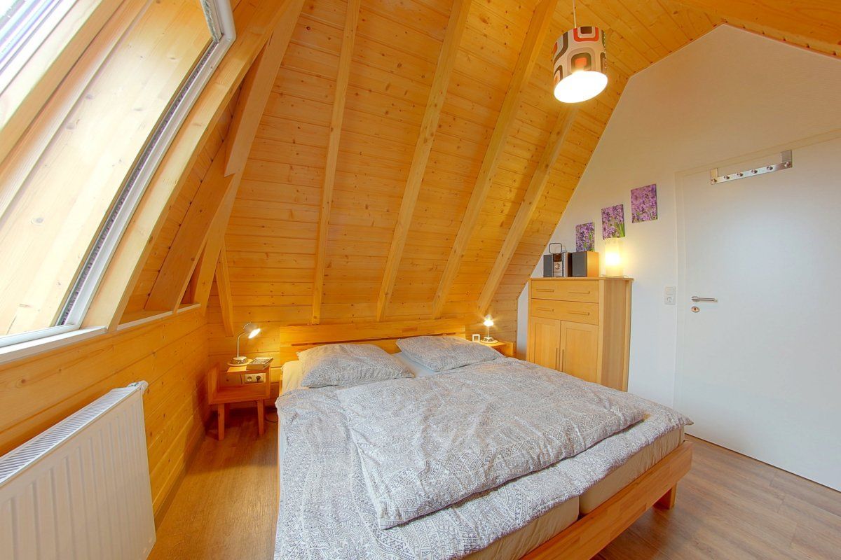 Das Schlafzimmer im Erdgeschoss ist mit einem hochwertigen Doppelbett (180 x 200 cm) aus massiver Buche, höhenverstellbaren 5-Reflex-Zonen-Lattenrosten und Matratzen ausgestattet. Die Komforthöhe von ca. 45cm sorgt nach einem erholsamen Schlaf für ein gesundes und ideales Aufstehen. Zwei Nachtschränke mit Leseleuchten und ein kleiner Flachbildfernseher runden das Gesamtbild ab. Ein Kleiderschrank bietet genügend Platz für Ihre persönlichen Dinge.