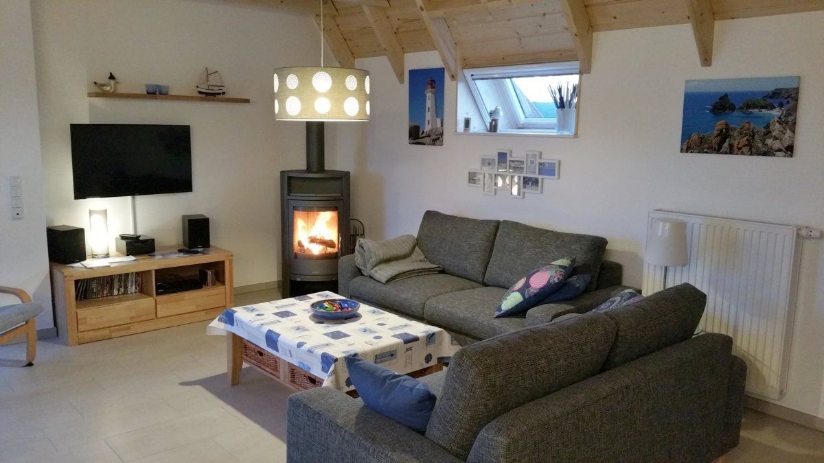An kalten Tagen sorgt neben einer modernen Gaszentralheizung ein Ofen für behagliche Wärme. Für Ihr Entertainment am Abend oder bei Schietwedder steht ein großer 40-Zoll-Flachbildschirm, ein Blu-Ray-Player und eine Auswahl an DVD`s zur Verfügung. Eine Musik-Kompaktanlage mit Bluetooth und USB-Anschluss sorgt jederzeit für den Zugriff auf Ihre Lieblingsmusik auf Ihrem Tablet oder Smartphone. Eine Auswahl an CD`s steht ebenfalls zur Verfügung. Darüber hinaus besteht die Möglichkeit der kostenlosen Nutzung (in das deutsche Festnetz) des vorhandenen Telefonanschlusses. Seit März 2023 verfügt unser Haus über einen modernen und sehr schnellen Glasfaseranschluß! Damit steht ggf. auch einem reibungslosen Arbeiten aus dem Fereinhaus nichts mehr im Wege.
