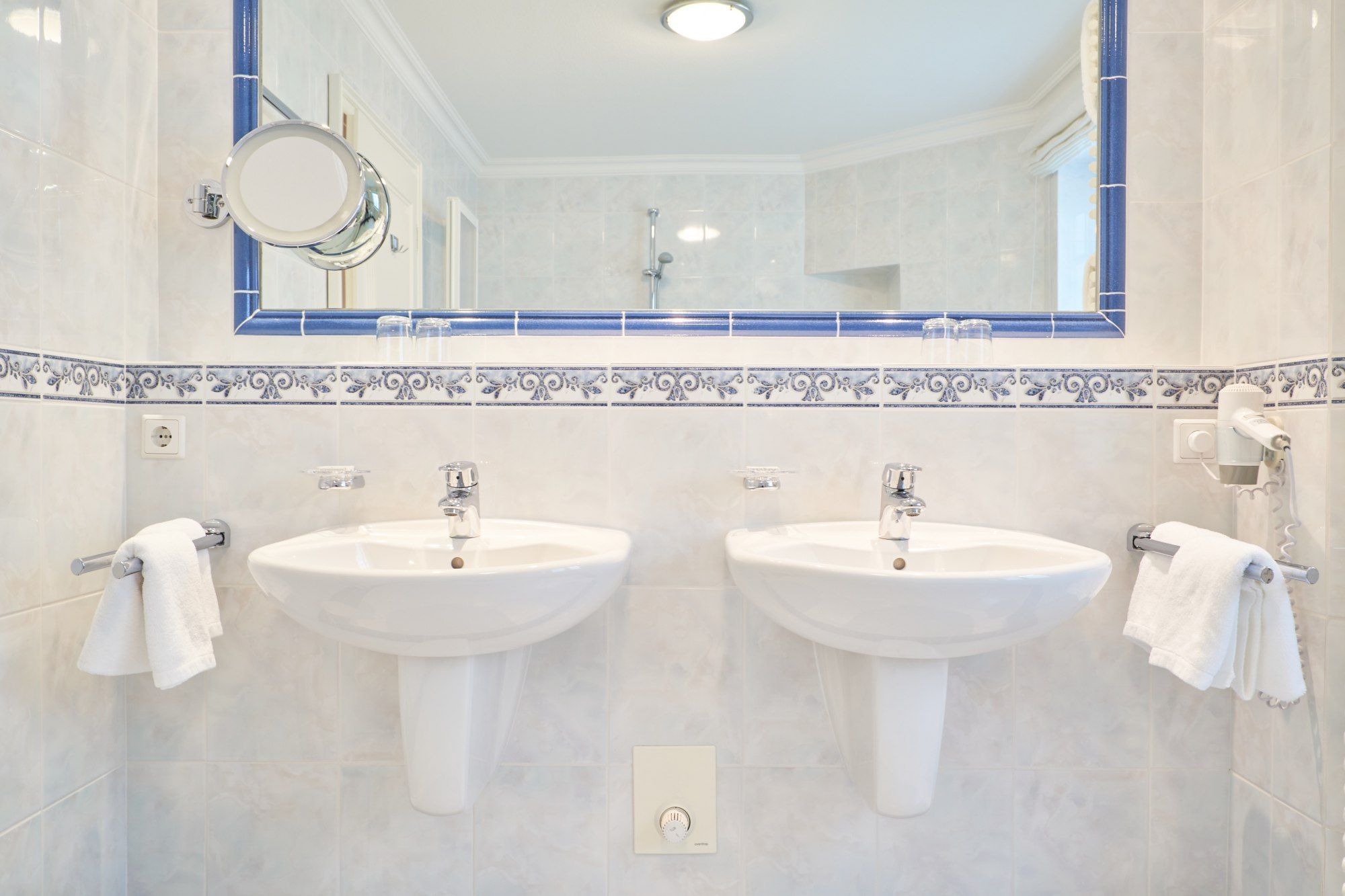Zwei Badezimmer, einmal mit Wanne, Doppelwaschbecken und WC, und ein Duschbad mit WC.