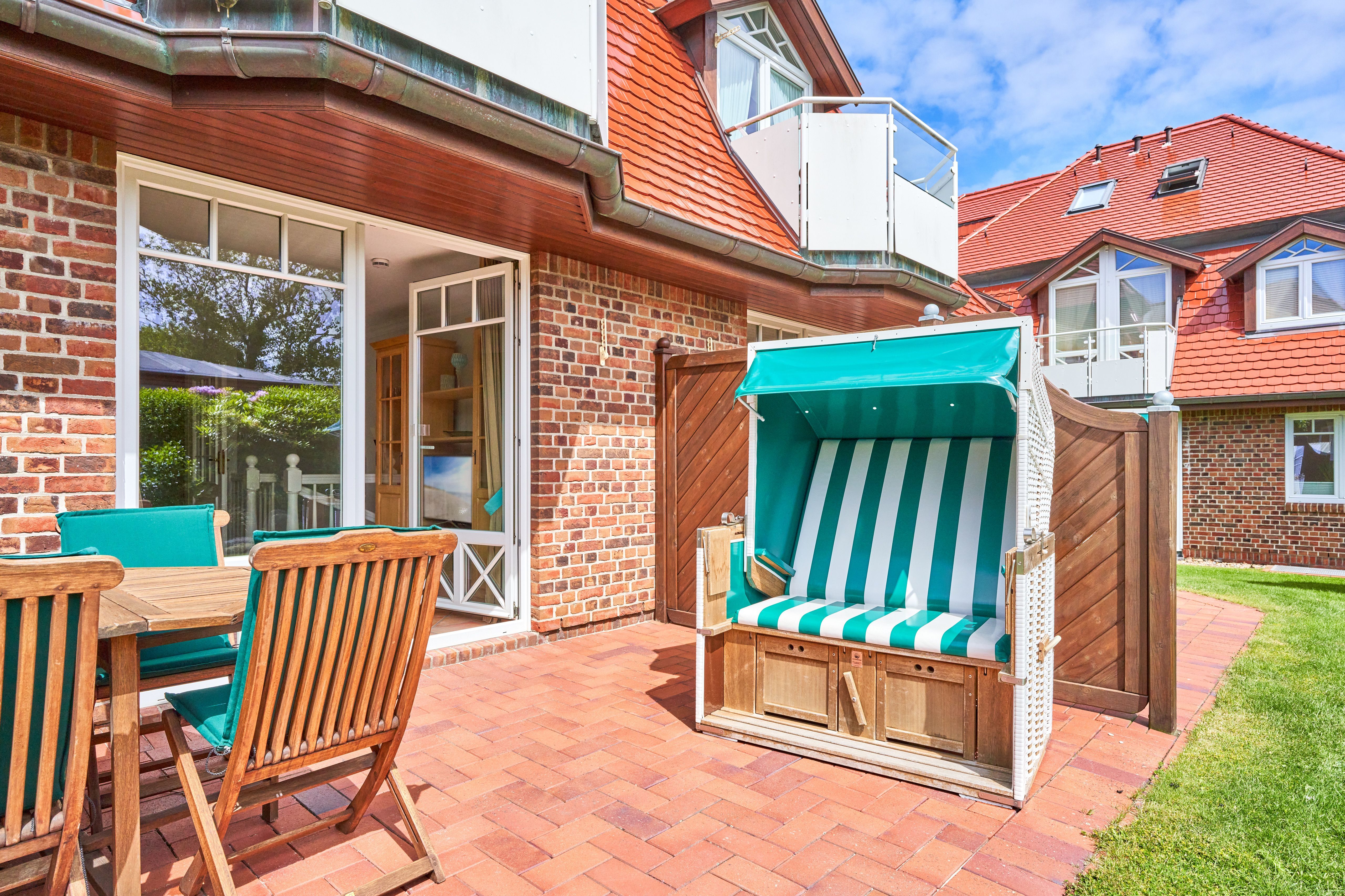 Auch eine Terrasse mit Strandkorb und Gartenmöbeln steht Ihnen zur Verfügung.