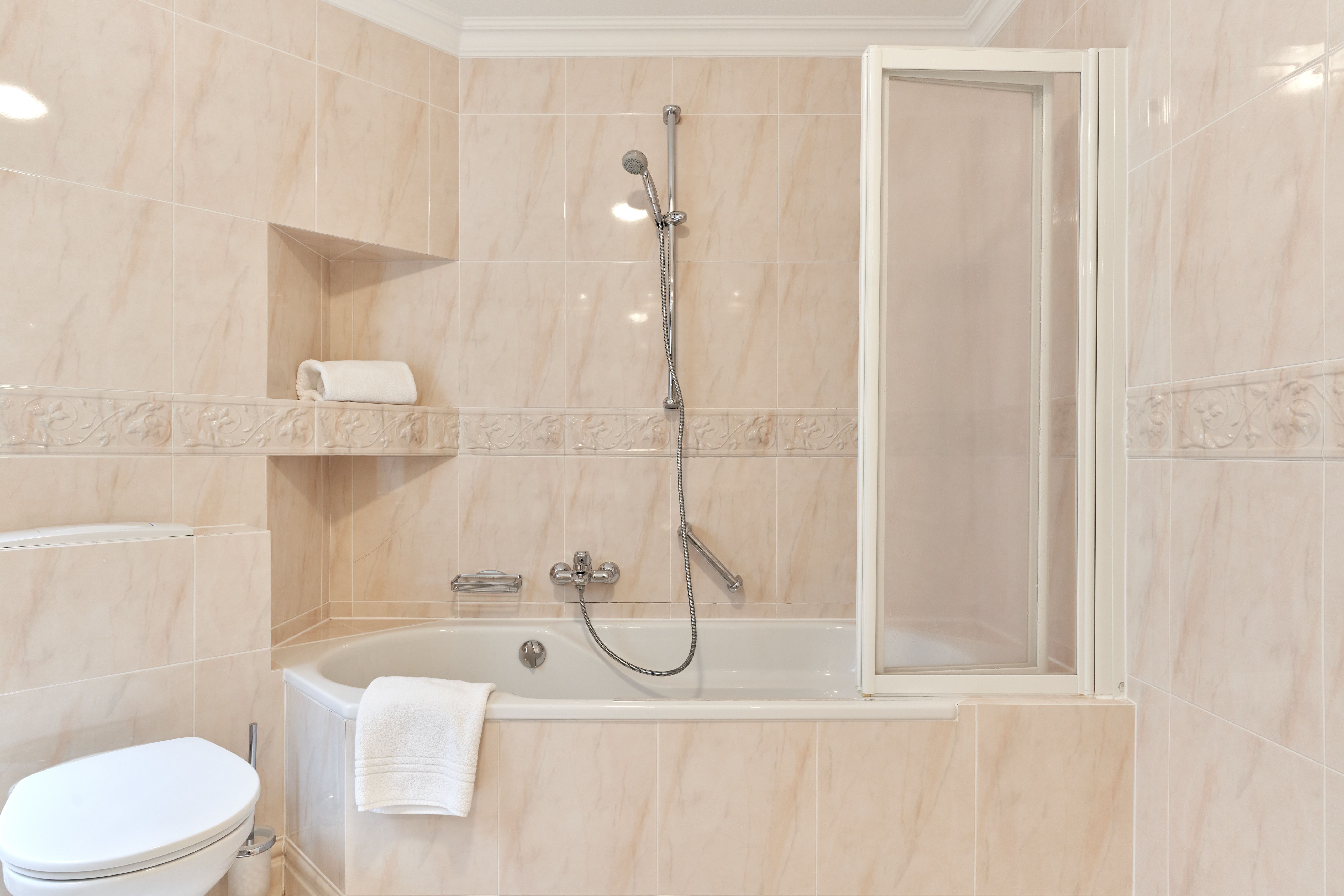 Zwei Badezimmer, einmal mit Wanne, Doppelwaschbecken und WC und ein Duschbad mit WC.