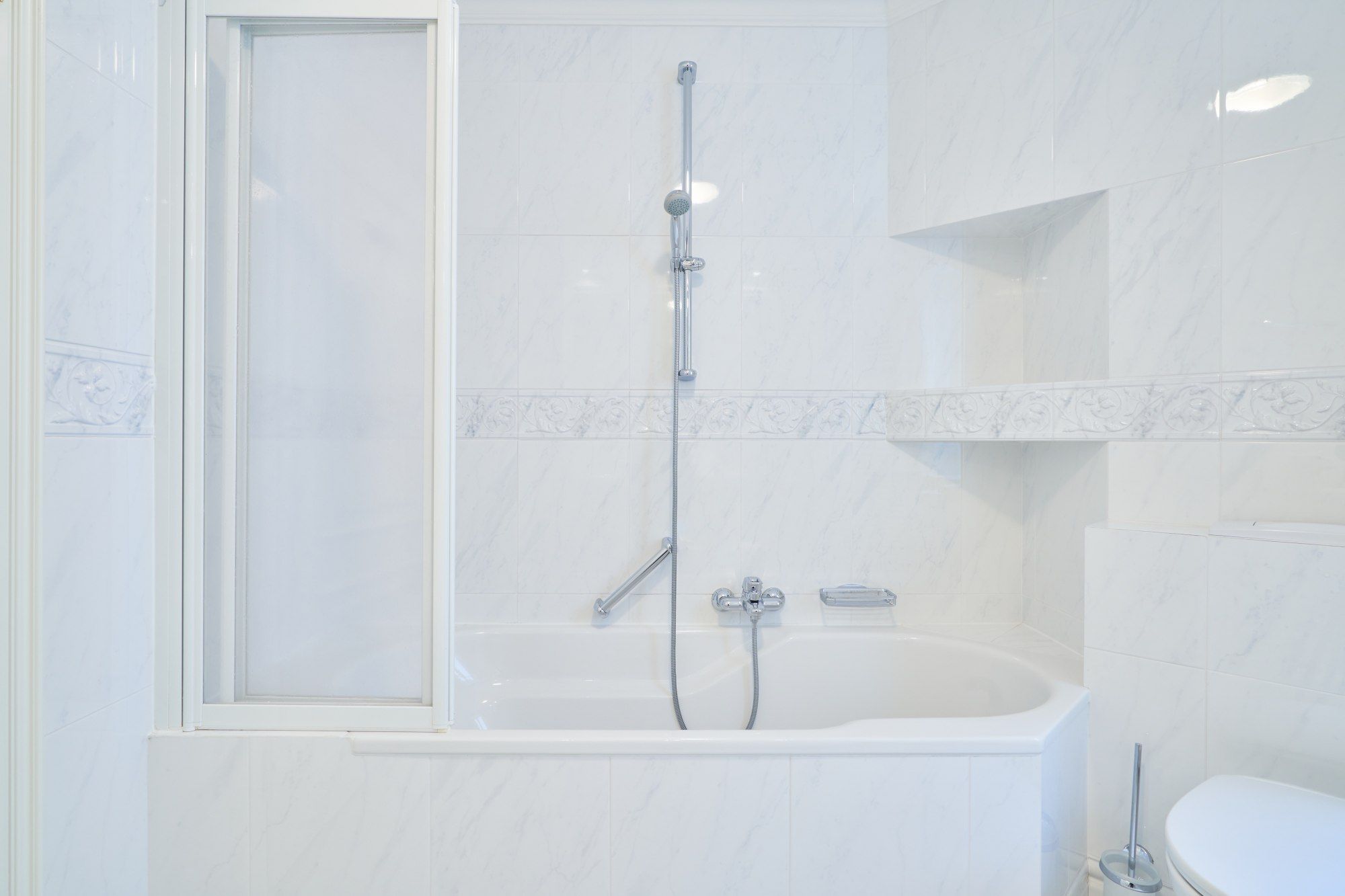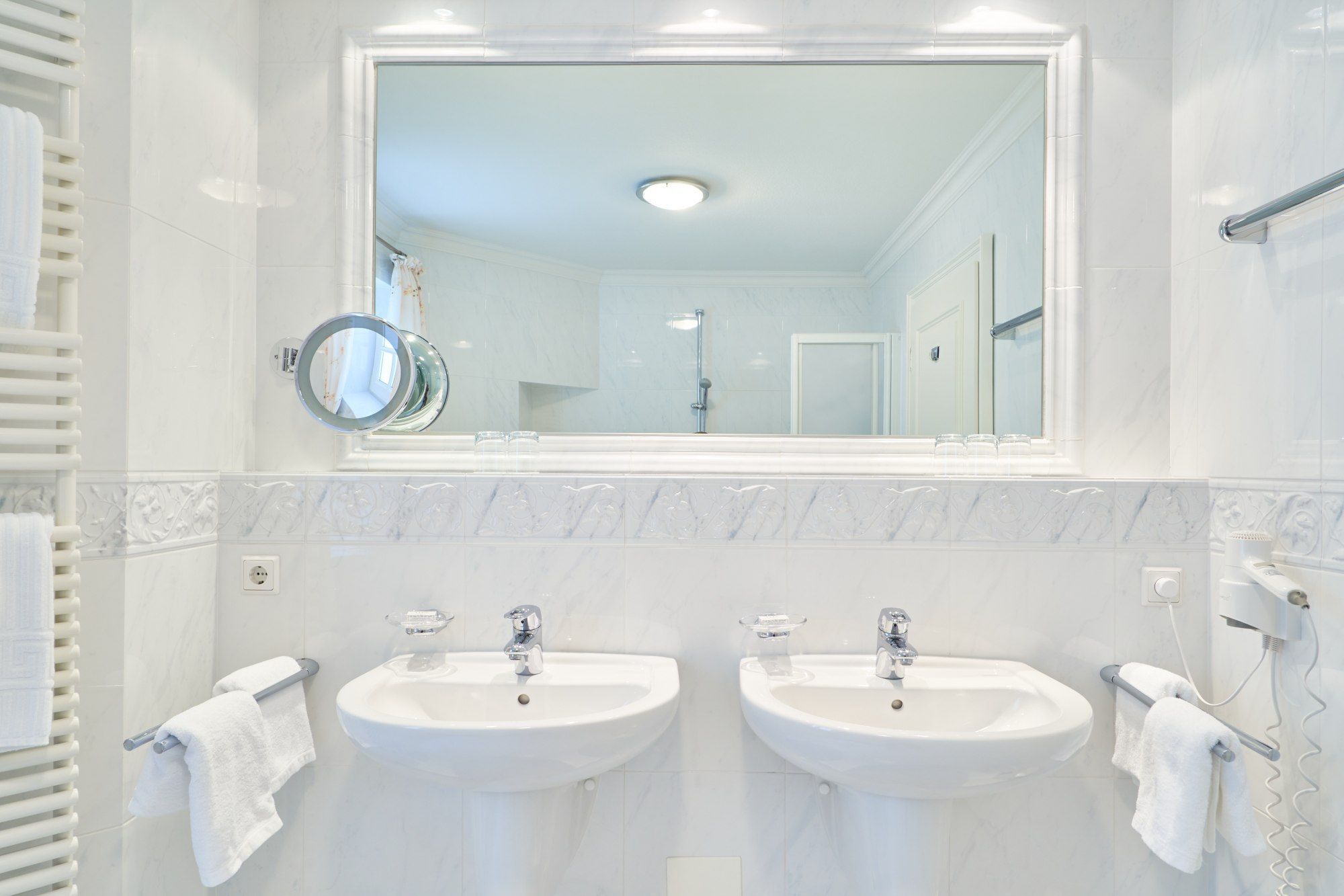 Zwei Badezimmer, einmal mit Wanne, Doppelwaschbecken und WC und ein zusätzliches WC.