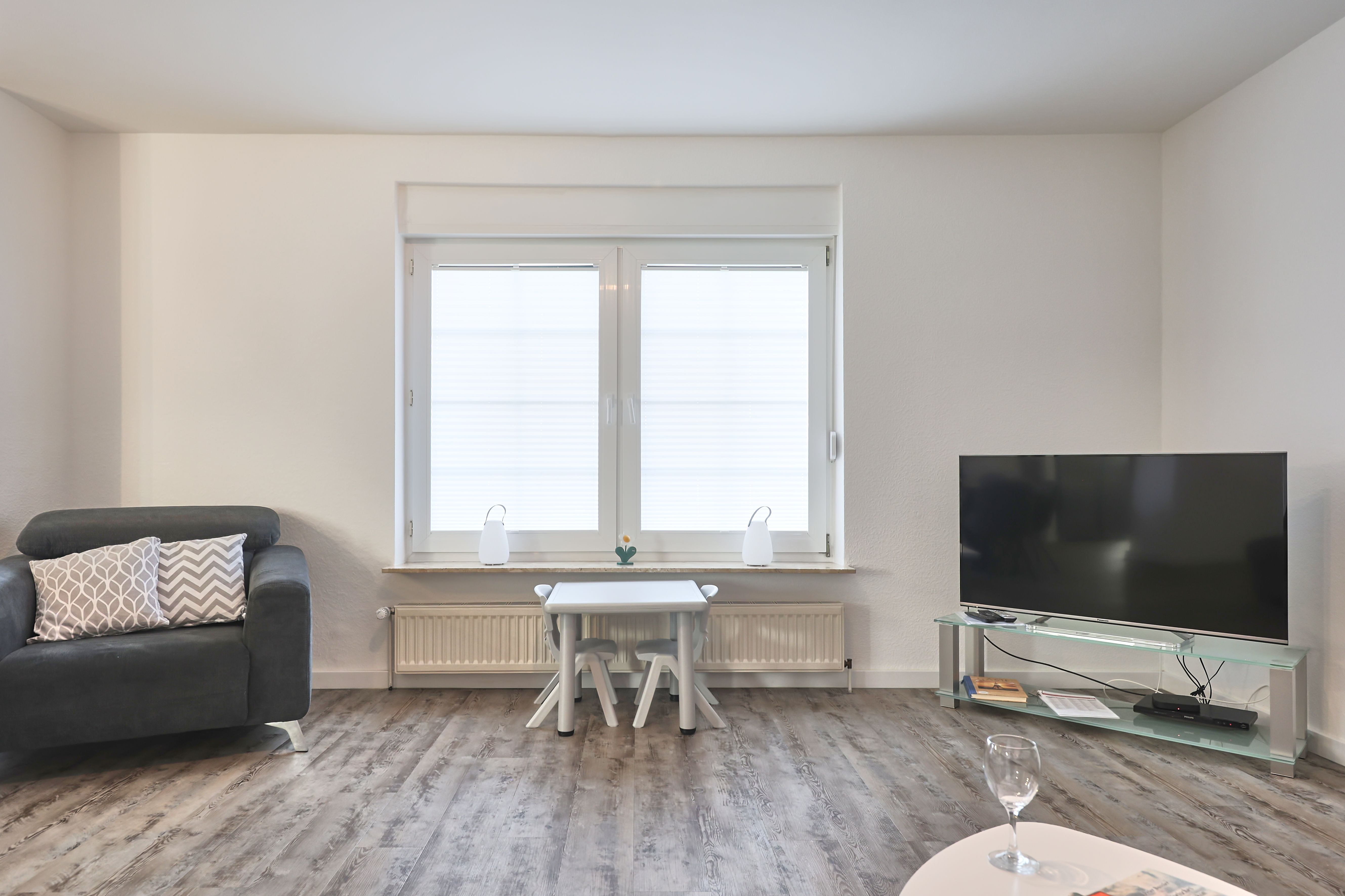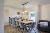 Im Erdgeschoss erwartet Sie ein großzügiger Wohnbereich (ca. 45 m²), der mit einem großen Sofa, Sessel, einem HD Smart TV mit GIGA TV, und einem Sonoro Radio mit CD ausgestattet ist. Hier finden auch gemeinsame Spieleabende oder entspannte Stunden vor dem Fernseher statt. Der große Esstisch bietet Platz für bis zu 8 Personen, sodass die gesamte Familie zusammen speisen kann.