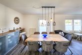 Von hier aus gelangen Sie auf die Terrasse mit Zugang zum Garten, der mit einer Schaukel für Kinder sowie verschiedenen Sitzmöglichkeiten ausgestattet ist. Ein großer 3-Meter-Terrassentisch mit 8 bequemen Sitzmöbeln lädt zu gemeinsamen Mahlzeiten im Freien ein.