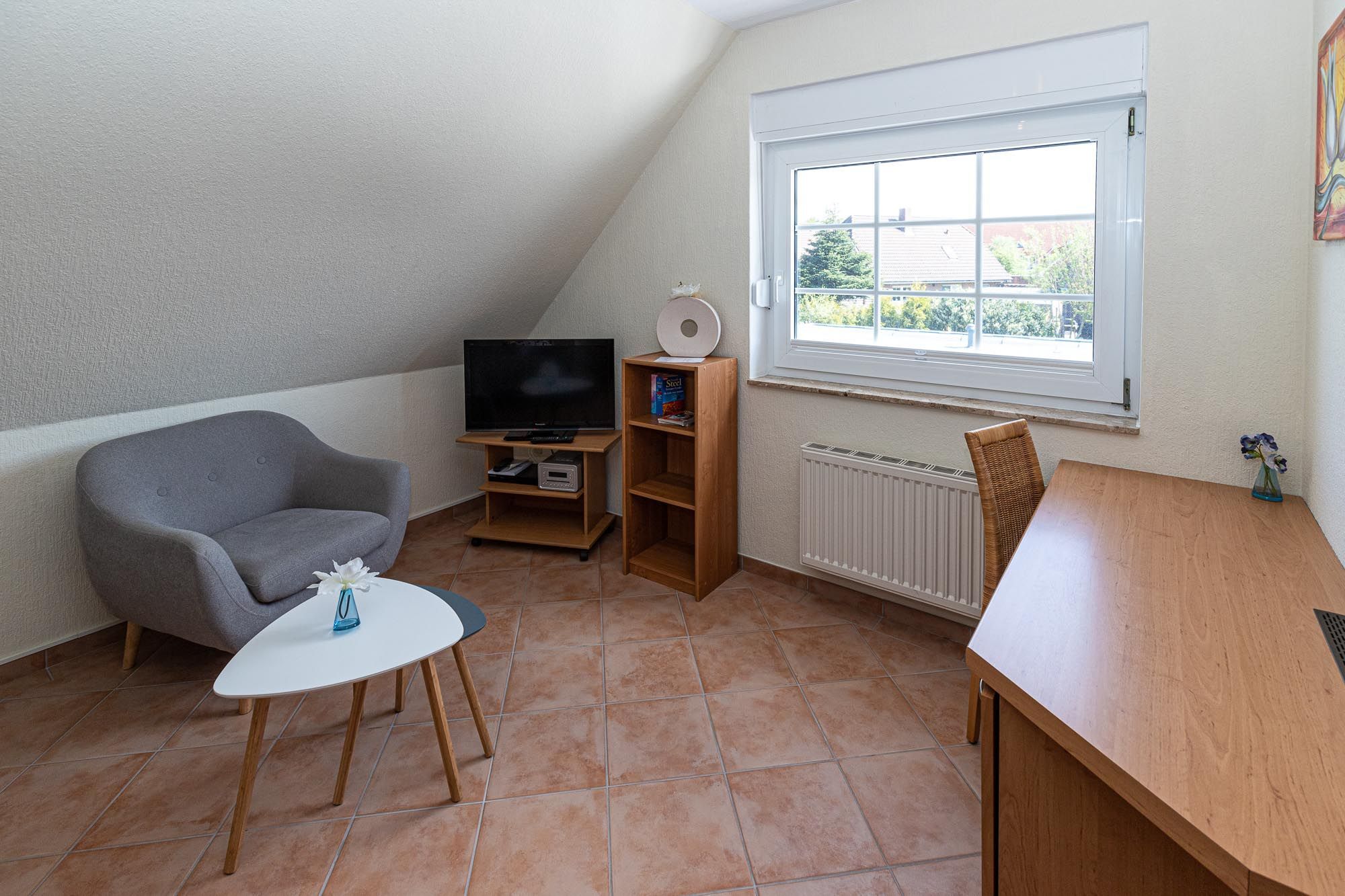 Besonders hervorzuheben ist ein Schlafzimmer, das zusätzlich über einen eigenen Wohnbereich mit Couch, Sessel, TV, CD-Radio, einem kleinen Kühlschrank und Schreibtisch verfügt ideal für ruhige Stunden oder als Rückzugsort.