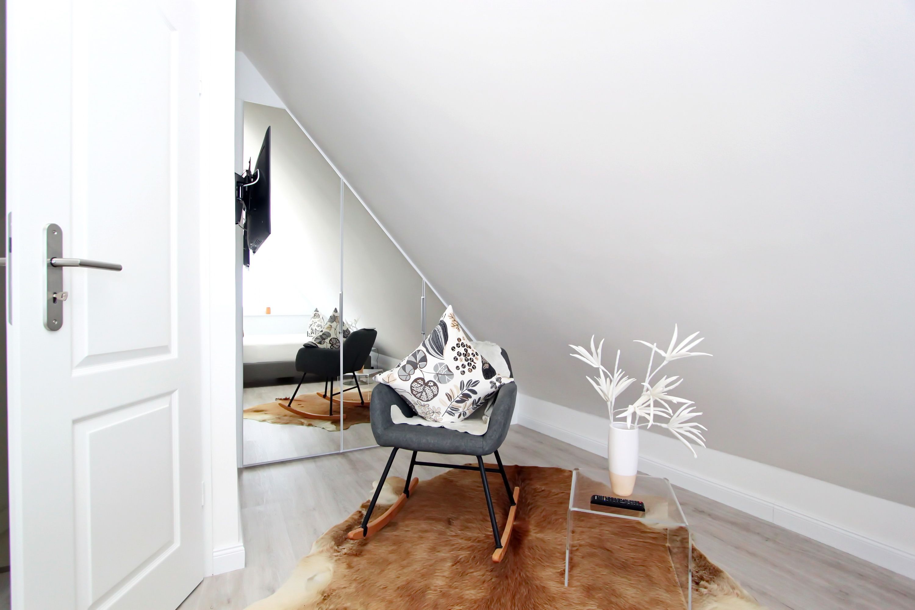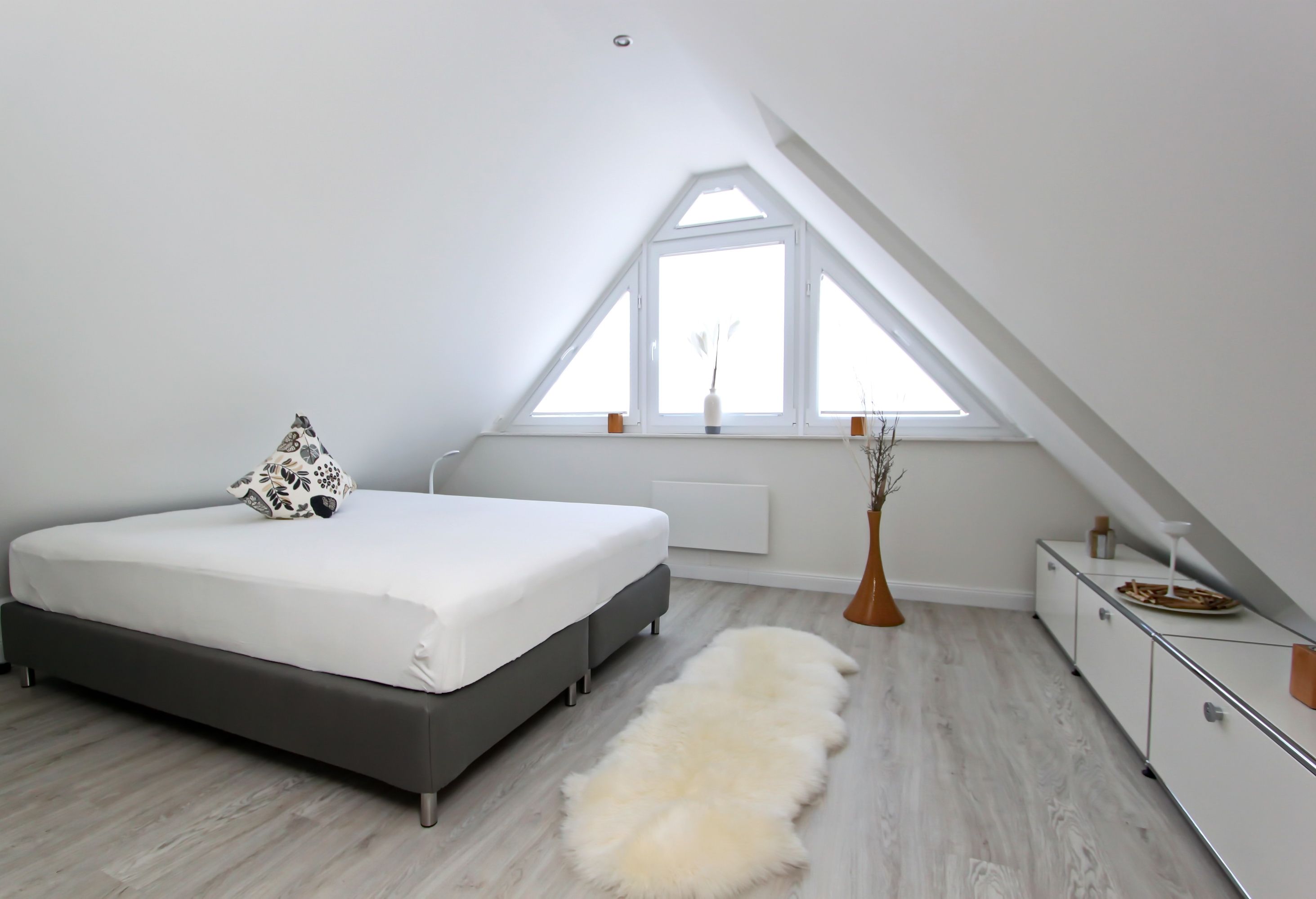 Das separate Schlafzimmer verfügt über ein Doppelbett, Nachttische, Flatscreen-TV und einem großen Kleiderschrank, der ausreichend Stauraum bietet. Flur mit kleinem Schreibtisch und Garderobe. Duschbad/WC mit ebenerdiger Dusche. Über eine Treppe gelangen Sie ins Dachgeschoss. Dort ist ein weiteres Schlafzimmer mit einem Doppelbett, Nachttische, Flatscreen-TV, Einbauspiegelschrank, kl. Schaukelstuhl, Tisch und viel Stauraum in den kleinen Sideboards entlang der Wand. Das Appartement ist komplett mit hochwertigen Vinyl Boden ausgelegt. Bei Anreise sind die Betten bezogen, auch Handtücher sind inklusive.
