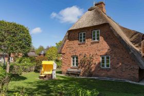 Diese Endhaushälfte unter Reet läßt für Gäste kaum Wünsche offen. Das tiefgezogene Reet und der für die Insel Föhr so typische Baustil gibt einem das Gefühl in einem der ältesten Häuser der Insel zu wohnen. Dabei muss auf keinen Komfort verzichtet werden. Die moderne Enrichtung bietet mit vielen ausgesuchten Details eine Menge, damit Ihre Urlaubswünsche in Erfüllung gehen. Sie wohnen direkt am alten Kurkpark und spüren in Ihrem Garten den Wind vom Meer wenn er durch die Blätter und Äste der mächtigen Zedern und Düneneichen streicht. Der Strand liegt in nur 100 Meter Entfernung. Wem es im gemütlichen Strandkorb am Haus denn doch einmal ein wenig zu langweilig wird, ist in etwa 15 Gehminuten im Trubel der kleinen Stadt von Wyk. Ein Haus zum Verlieben! **** Sterne