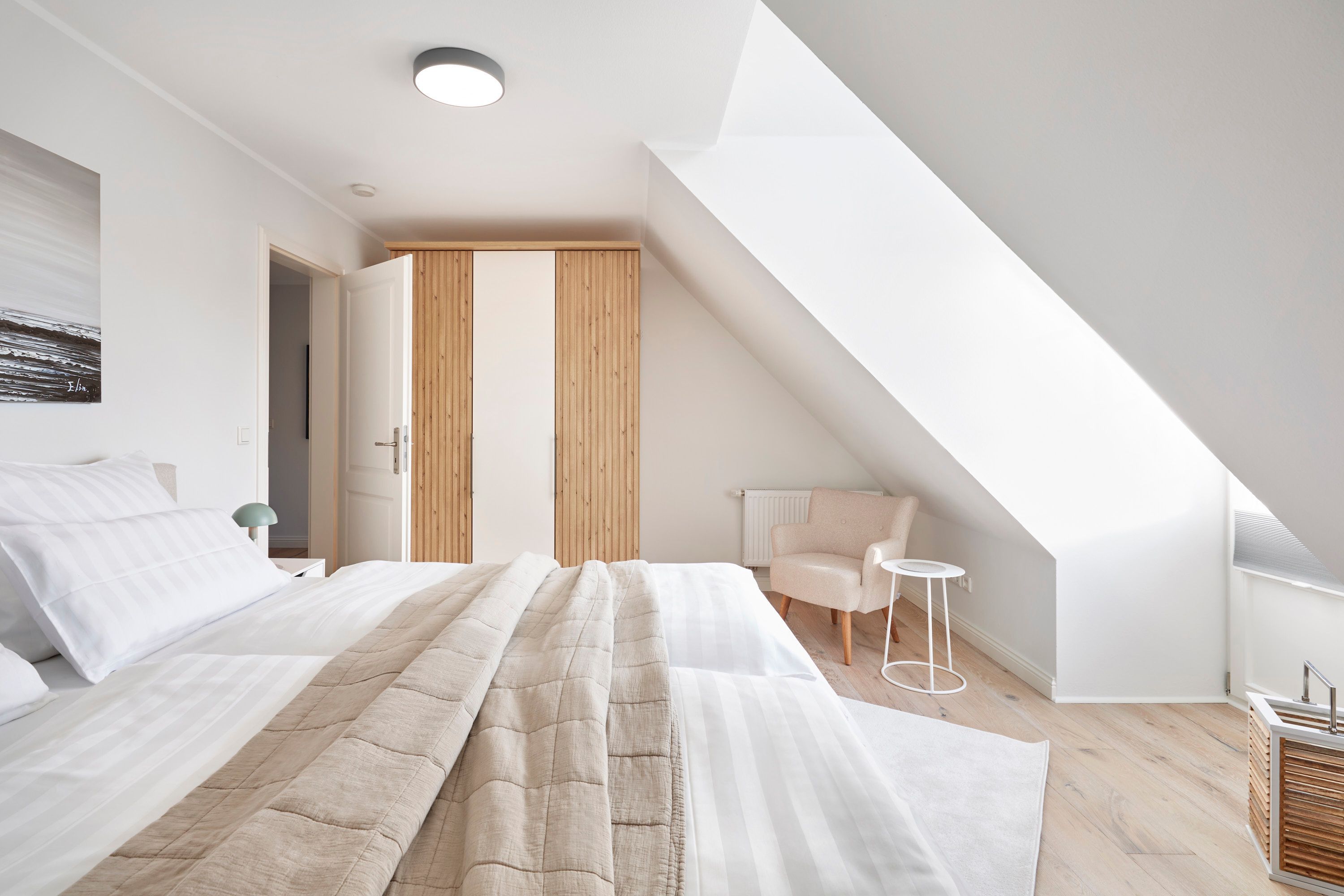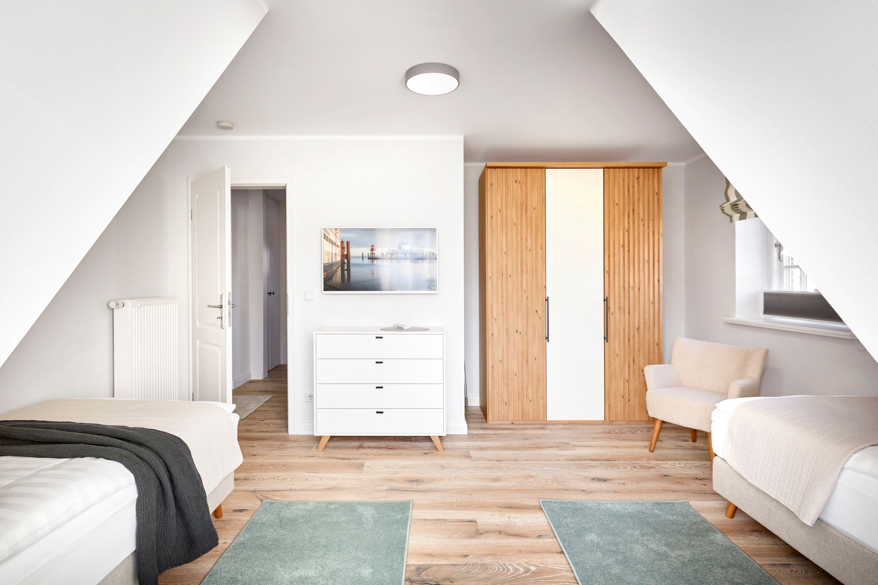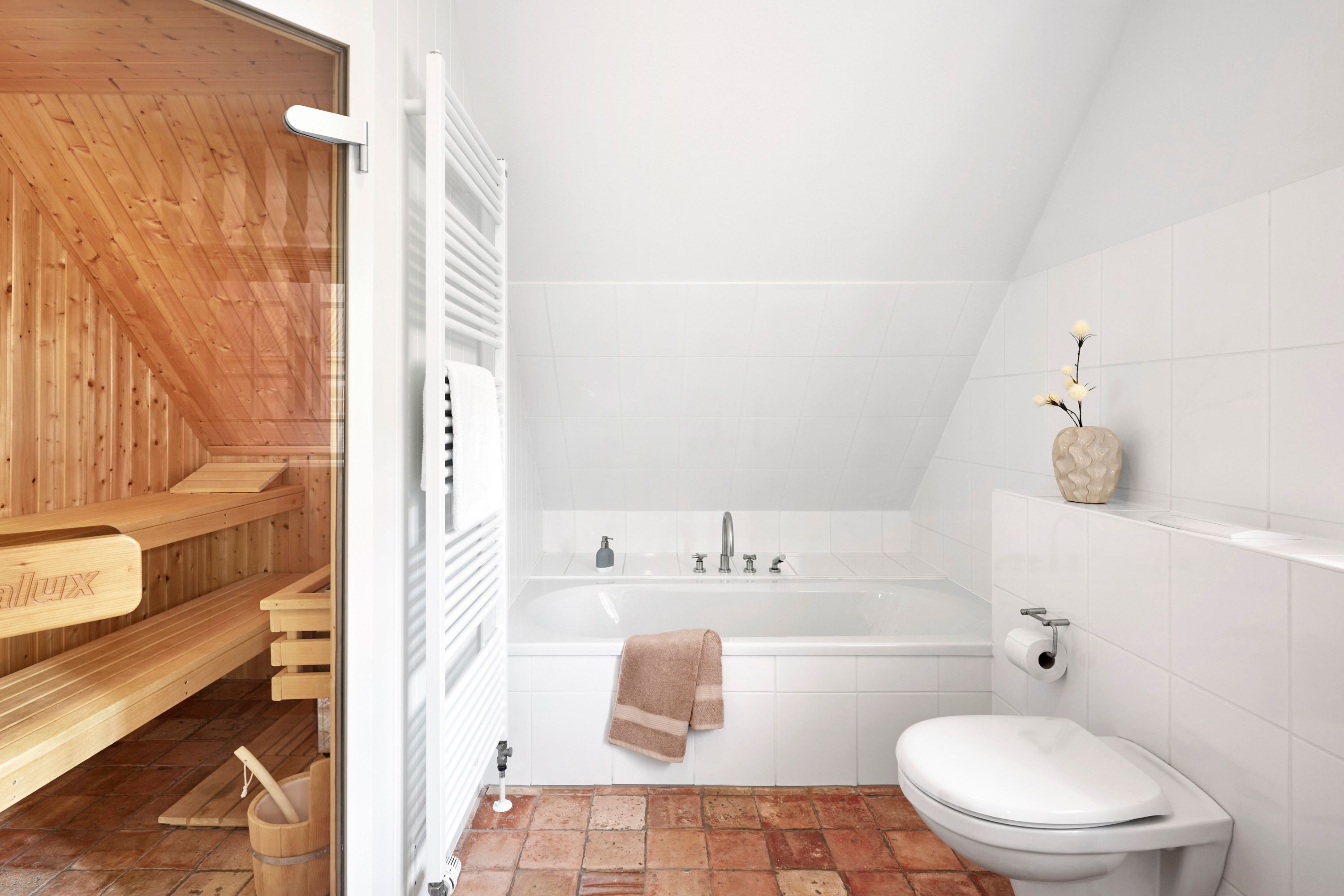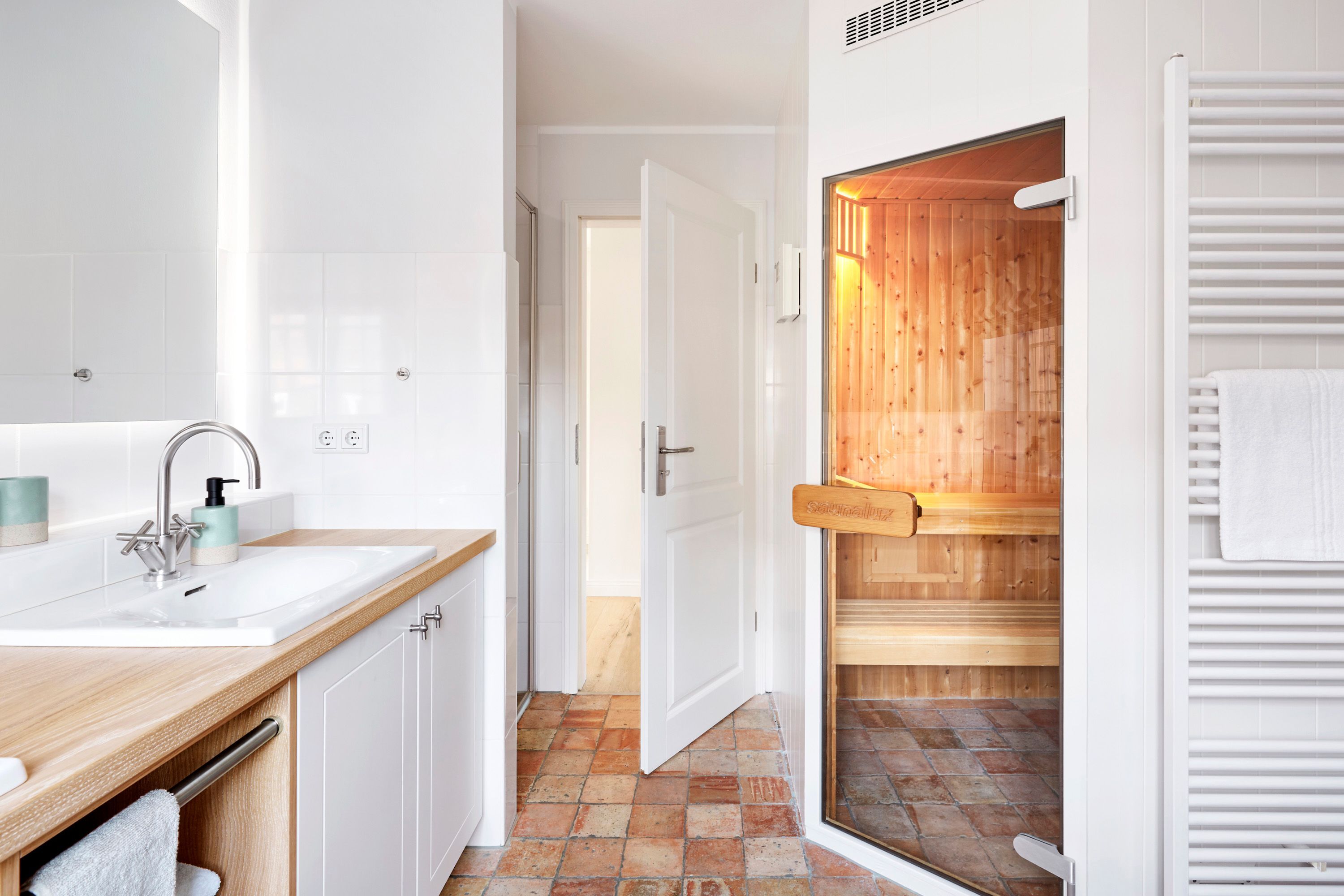 Im Obergeschoss erwartet Sie eine private Wellness-Oase mit Sauna und Badewanne, eingebettet in ein stilvolles Duschbad. Zudem stehen drei behagliche Schlafzimmer zur Verfügung zwei mit Doppelbetten, eines mit zwei Einzelbetten. Zwei der Schlafzimmer bieten direkten Zugang zu einem Balkon.