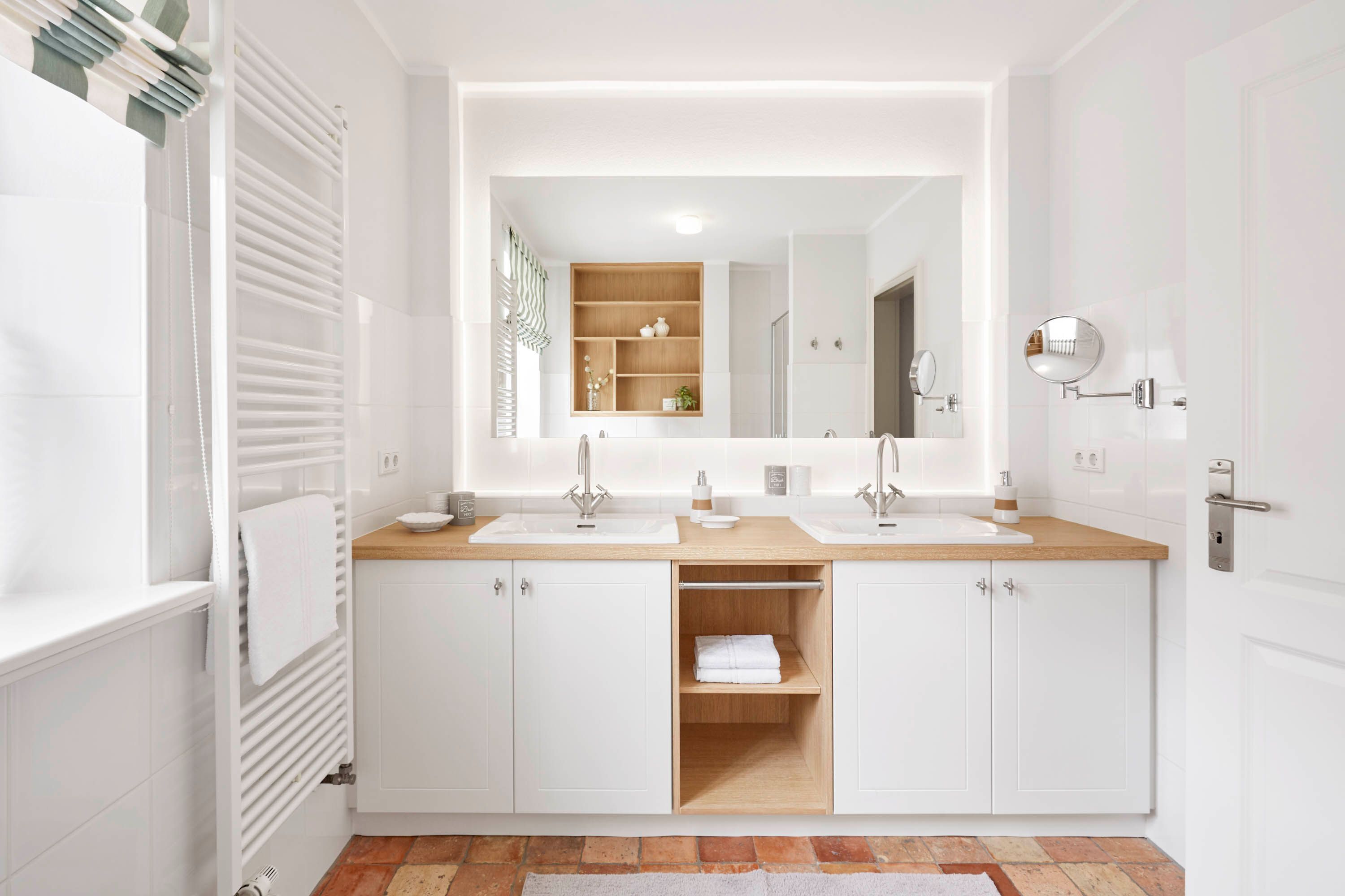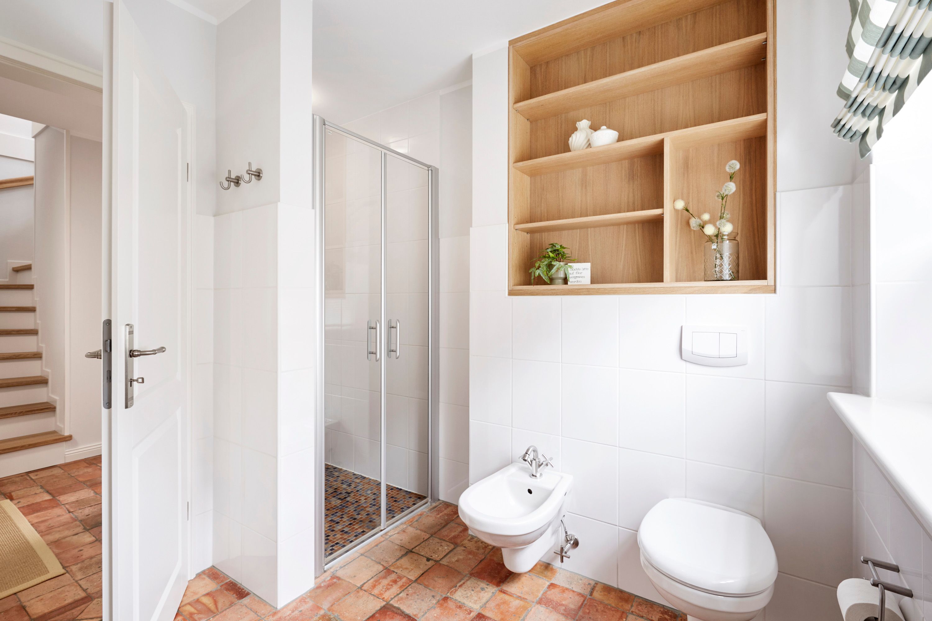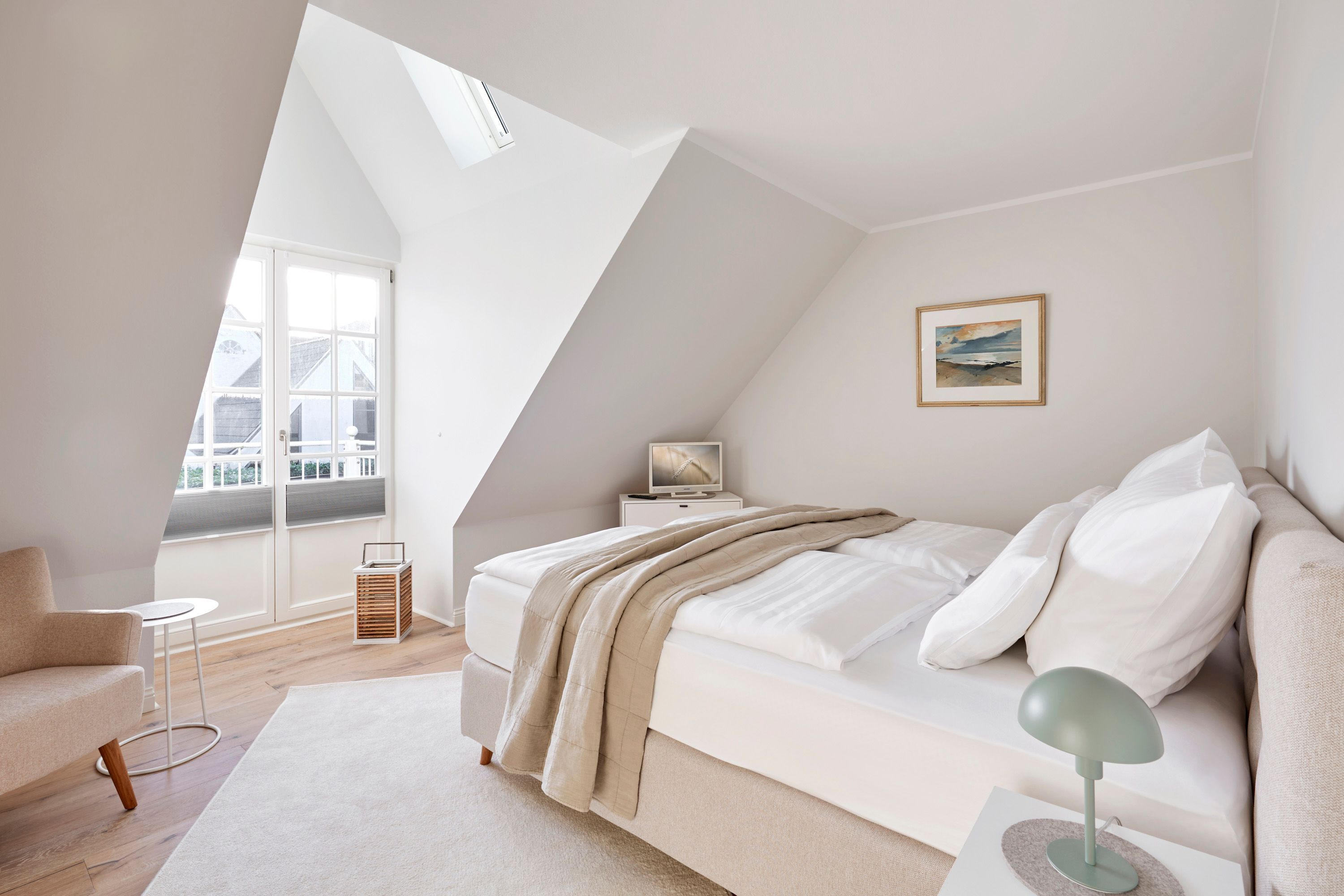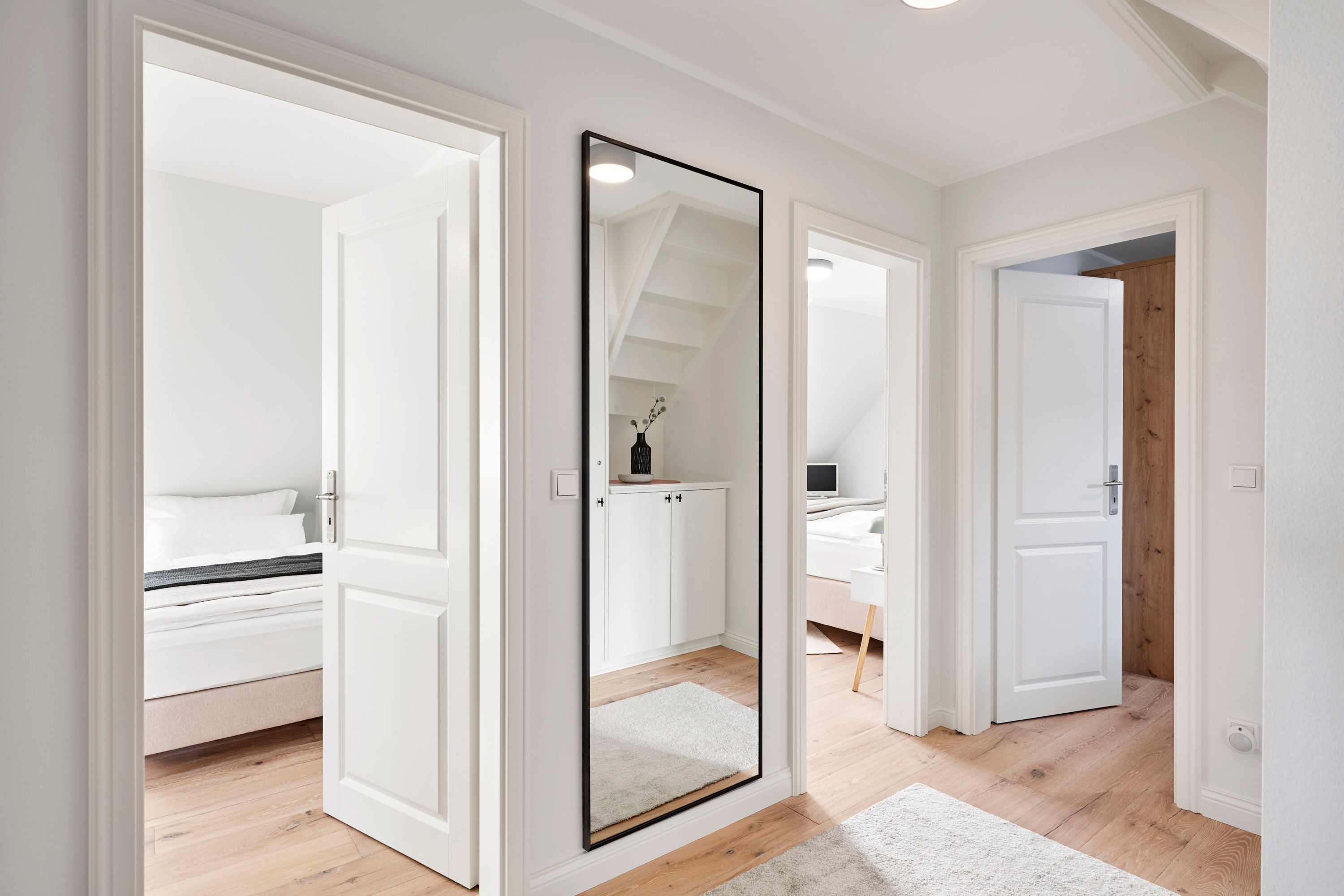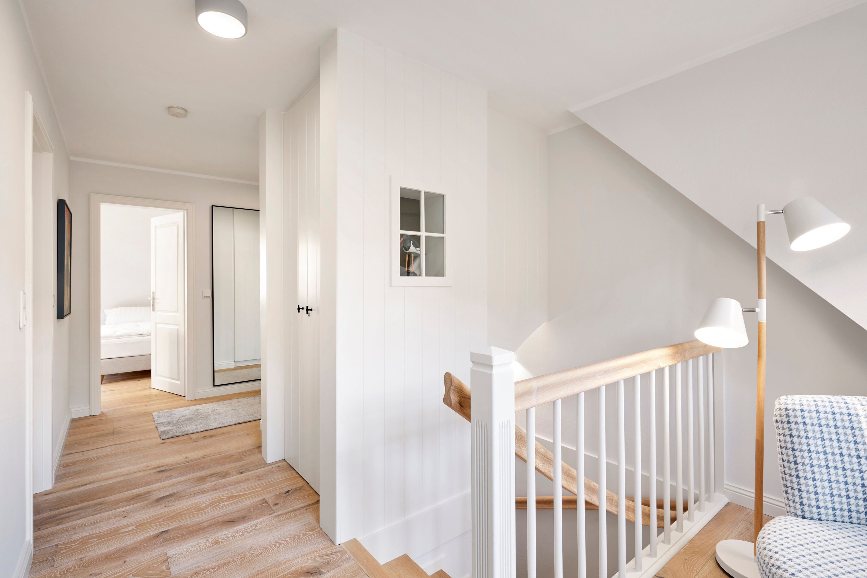 Im Obergeschoss erwartet Sie eine private Wellness-Oase mit Sauna und Badewanne, eingebettet in ein stilvolles Duschbad. Zudem stehen drei behagliche Schlafzimmer zur Verfügung zwei mit Doppelbetten, eines mit zwei Einzelbetten. Zwei der Schlafzimmer bieten direkten Zugang zu einem Balkon.