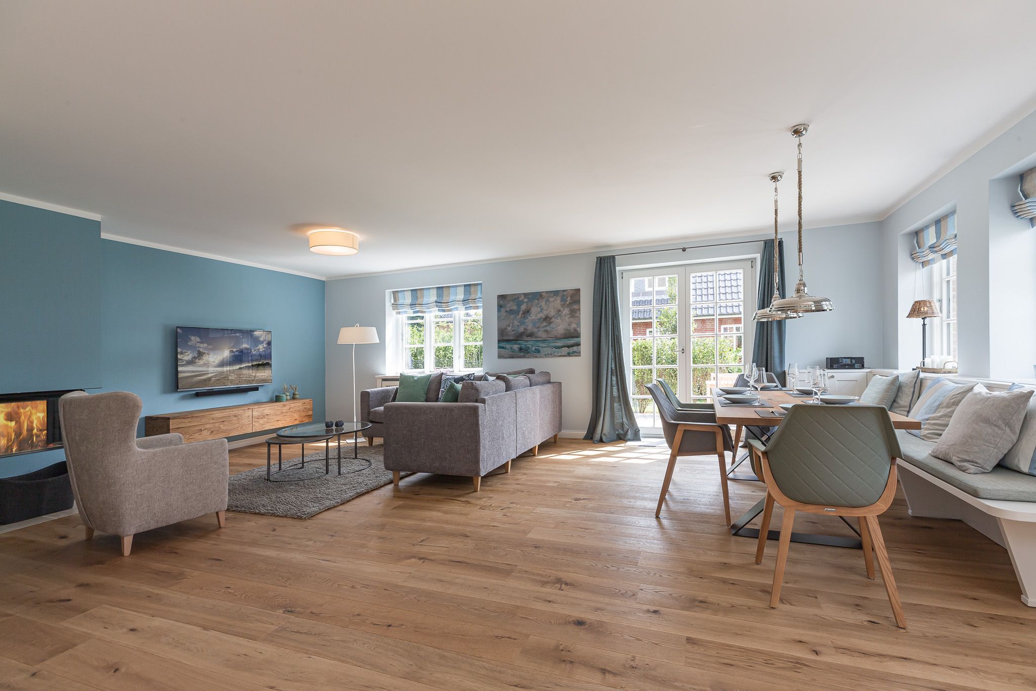 Der großzügige Wohnraum mit integriertem Essbereich und offener Küche mit farblich schön abgestimmten Farben, läßt sofort Urlaubsstimmung aufkommen. Die Bäder und Schlafräume sind jedes für sich ein Highlight. Sie werden sich sofort wohlfühlen und diese Atmosphäre genießen. Die große Terrasse wartet darauf genutzt zu werden. Der Blick in den Garten zeigt die Tiefe des Grundstücks. Natürlich fehlt auch die Saune nicht und der Kamin sorgt im Herbst und Winter für gemütliche Abende. Der kurze Weg zum Strand macht diese Haushälfte zu einem tollen Urlaubdomizil auf Zeit.