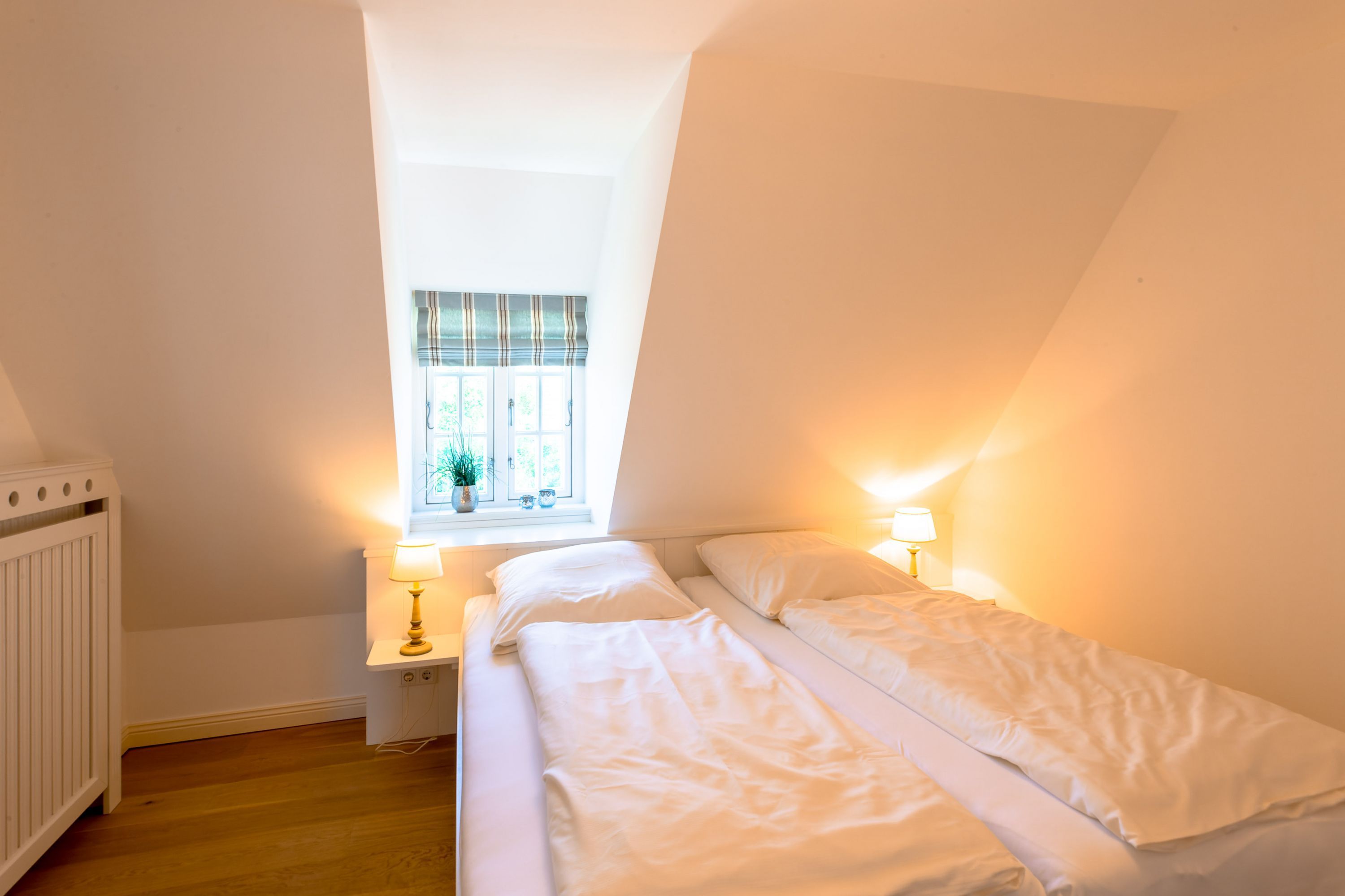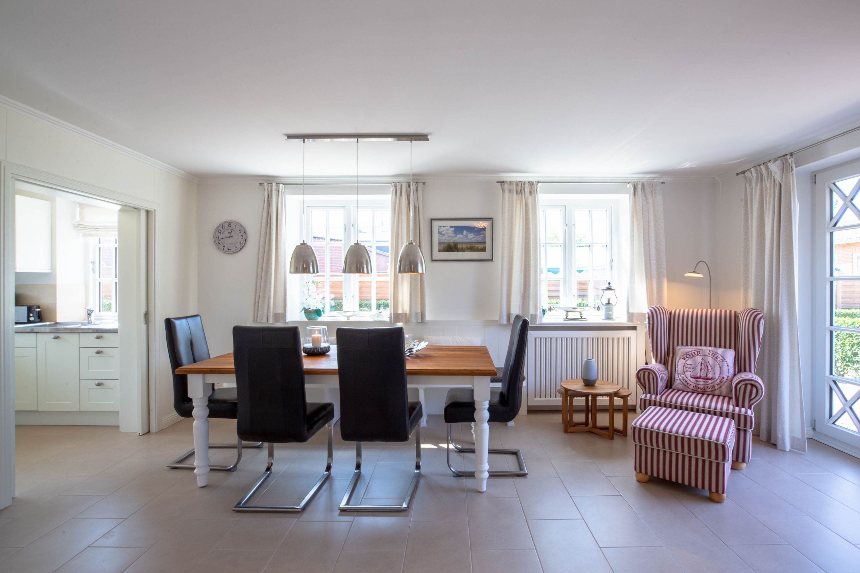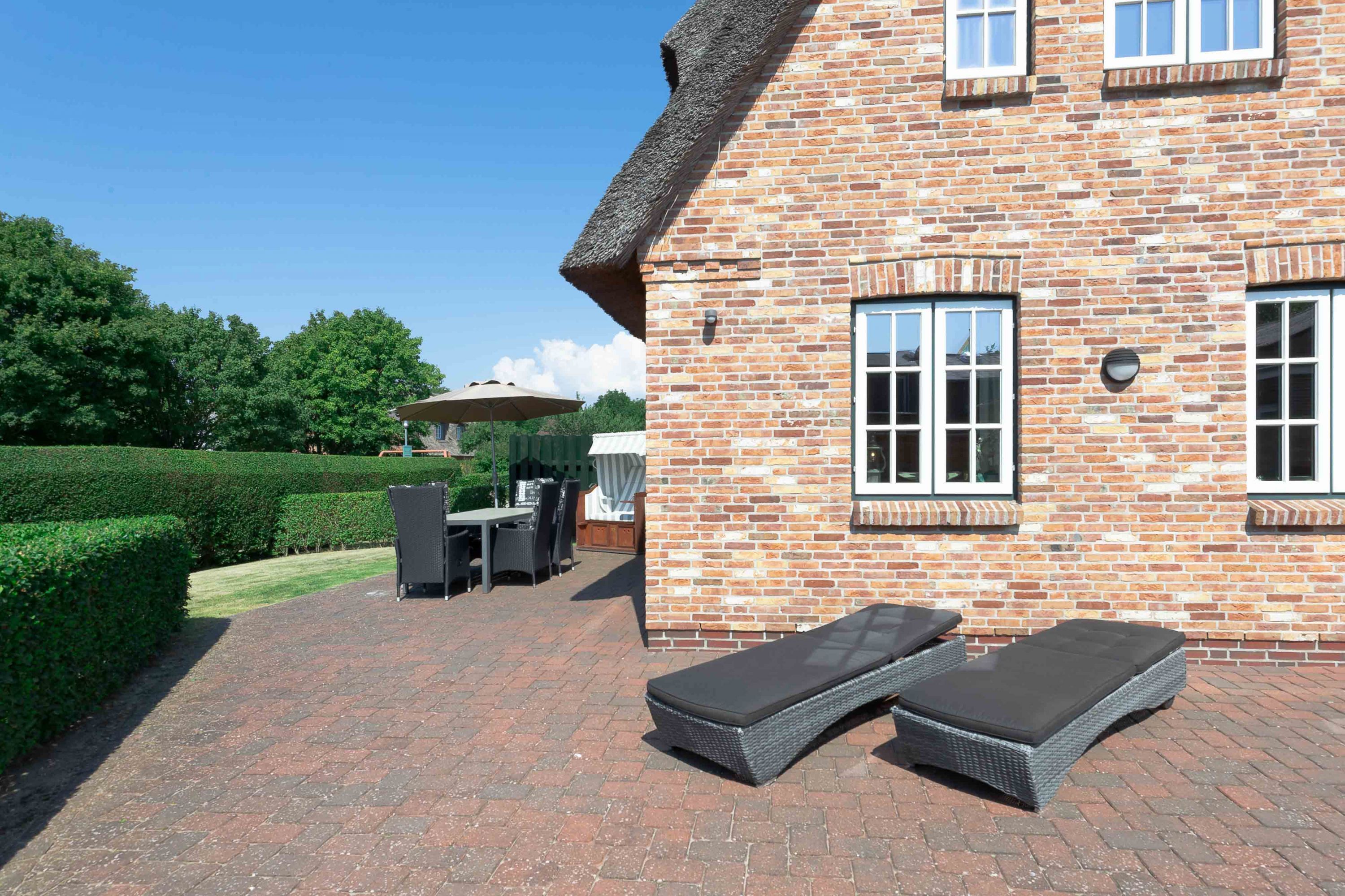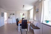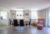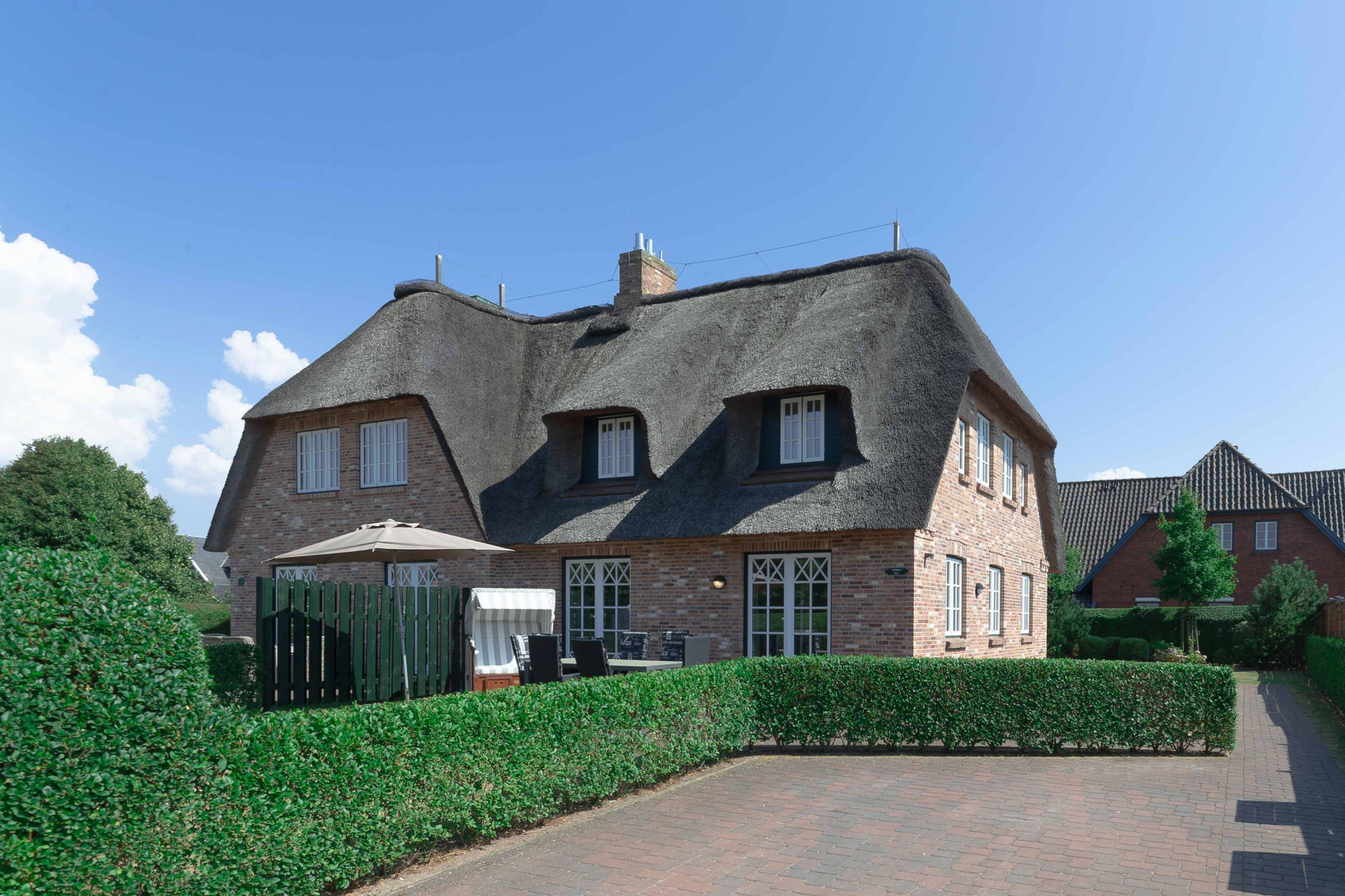 Ein typisches Friesenhaus mit sehr schöner Architektur. Die Summe schöner Details wie Holzsprossenfenster, Reetdach, Fliesen und Holzarbeiten - schafft eine wunderbare Atmosphäre. Das Doppelhaus unter Reet liegt an der Marsch, eingebettet in Wrixum - dem kleinen Nachbarort von Wyk mit dörflichem Charme. In der Nachbarschaft befindet sich ein Café mit leckerem, selbstgebackenem Kuchen, ein Fahrradverleih um die Insel per Rad zu erkunden und die Backstube des ortsansässigen Bäckers. Die Stadt Wyk mit seinen Geschäften und der Promenade sowie vom Strand nur etwa 5 - 10 Fahrradminuten entfernt.