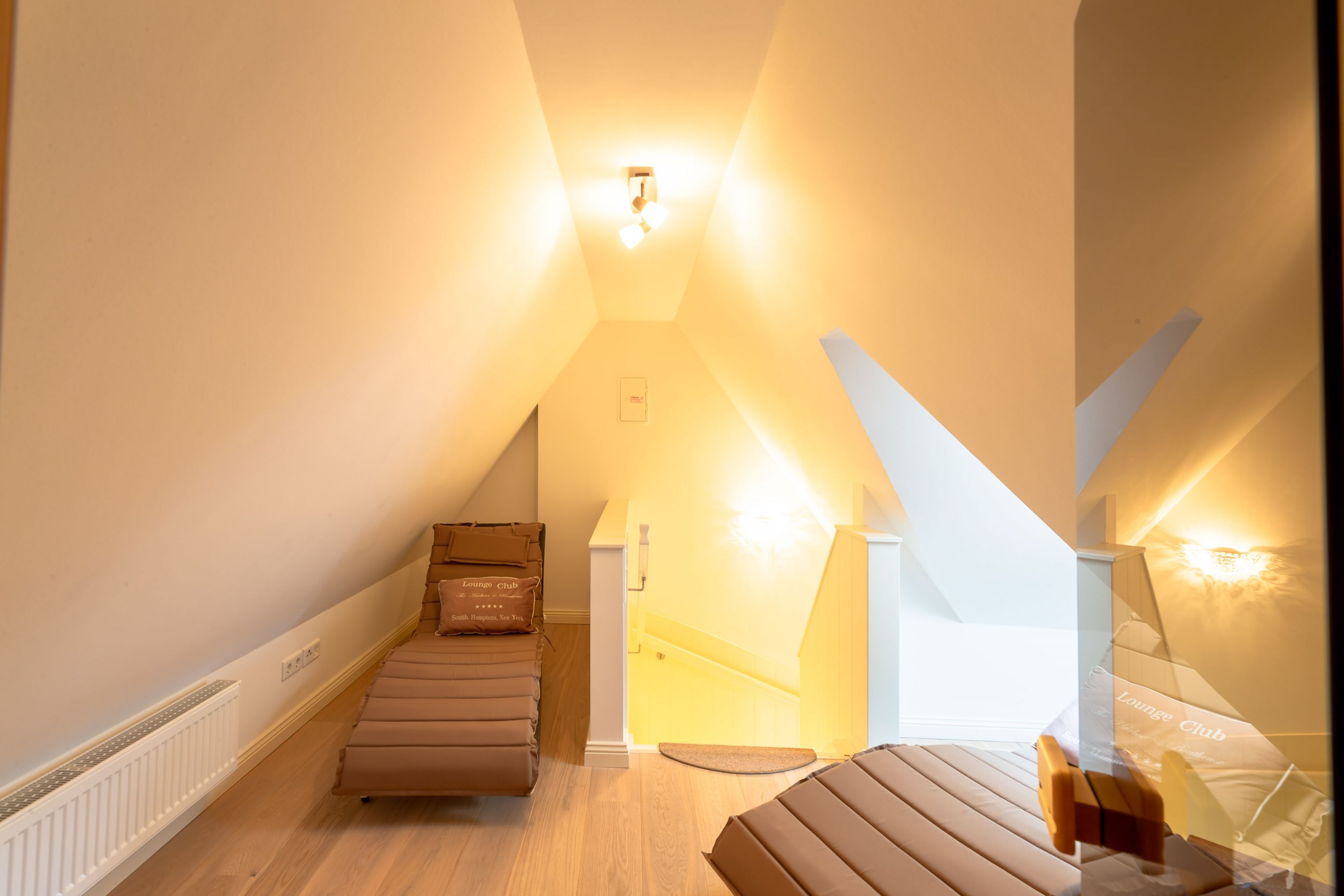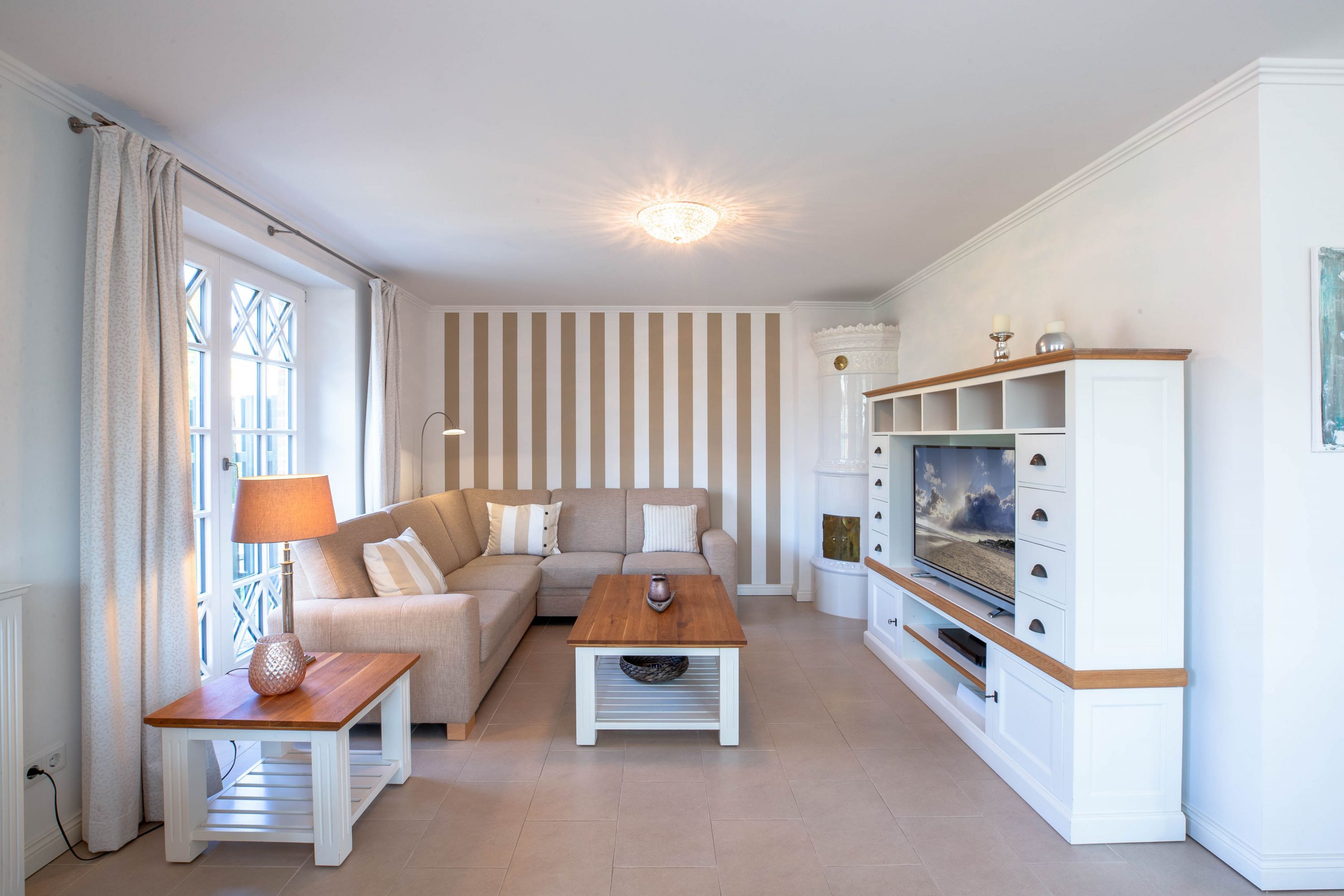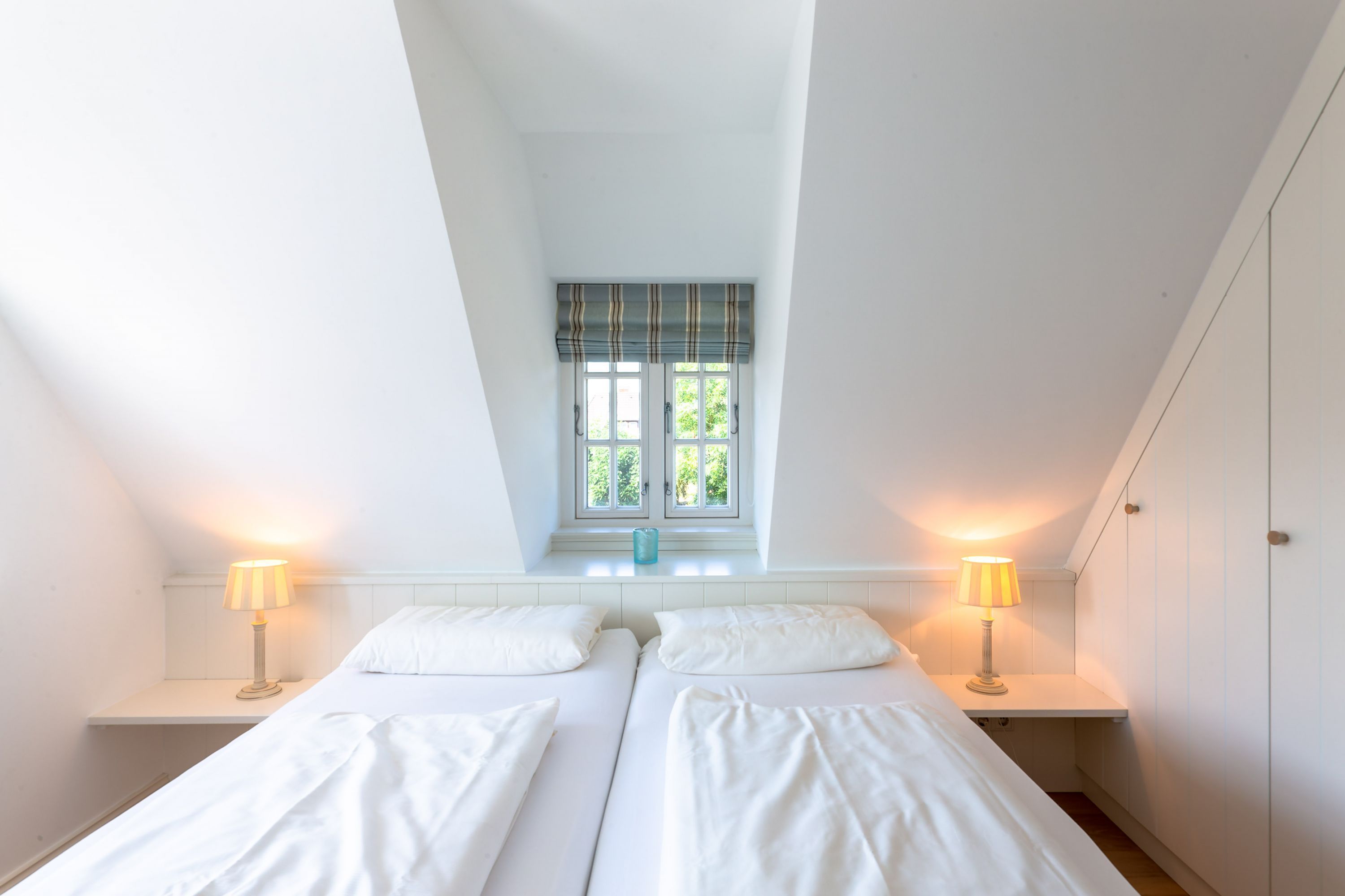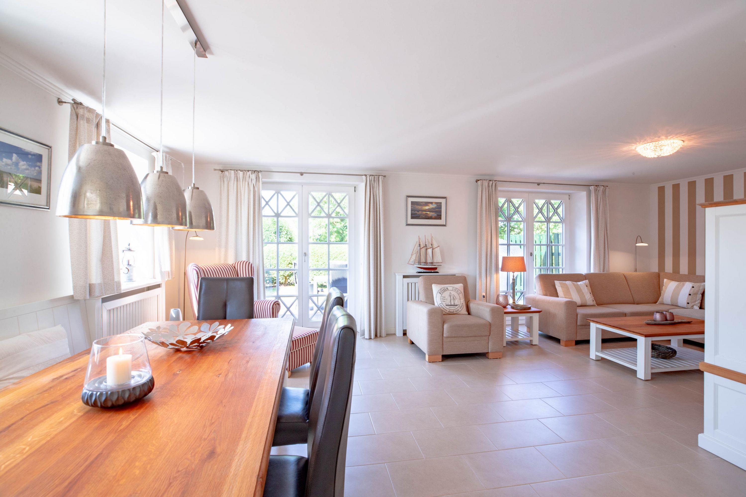 Ein typisches Friesenhaus mit sehr schöner Architektur. Die Summe schöner Details wie Holzsprossenfenster, Reetdach, Fliesen und Holzarbeiten - schafft eine wunderbare Atmosphäre. Das Doppelhaus unter Reet liegt an der Marsch, eingebettet in Wrixum - dem kleinen Nachbarort von Wyk mit dörflichem Charme. In der Nachbarschaft befindet sich ein Café mit leckerem, selbstgebackenem Kuchen, ein Fahrradverleih um die Insel per Rad zu erkunden und die Backstube des ortsansässigen Bäckers. Die Stadt Wyk mit seinen Geschäften und der Promenade sowie vom Strand nur etwa 5 - 10 Fahrradminuten entfernt.