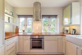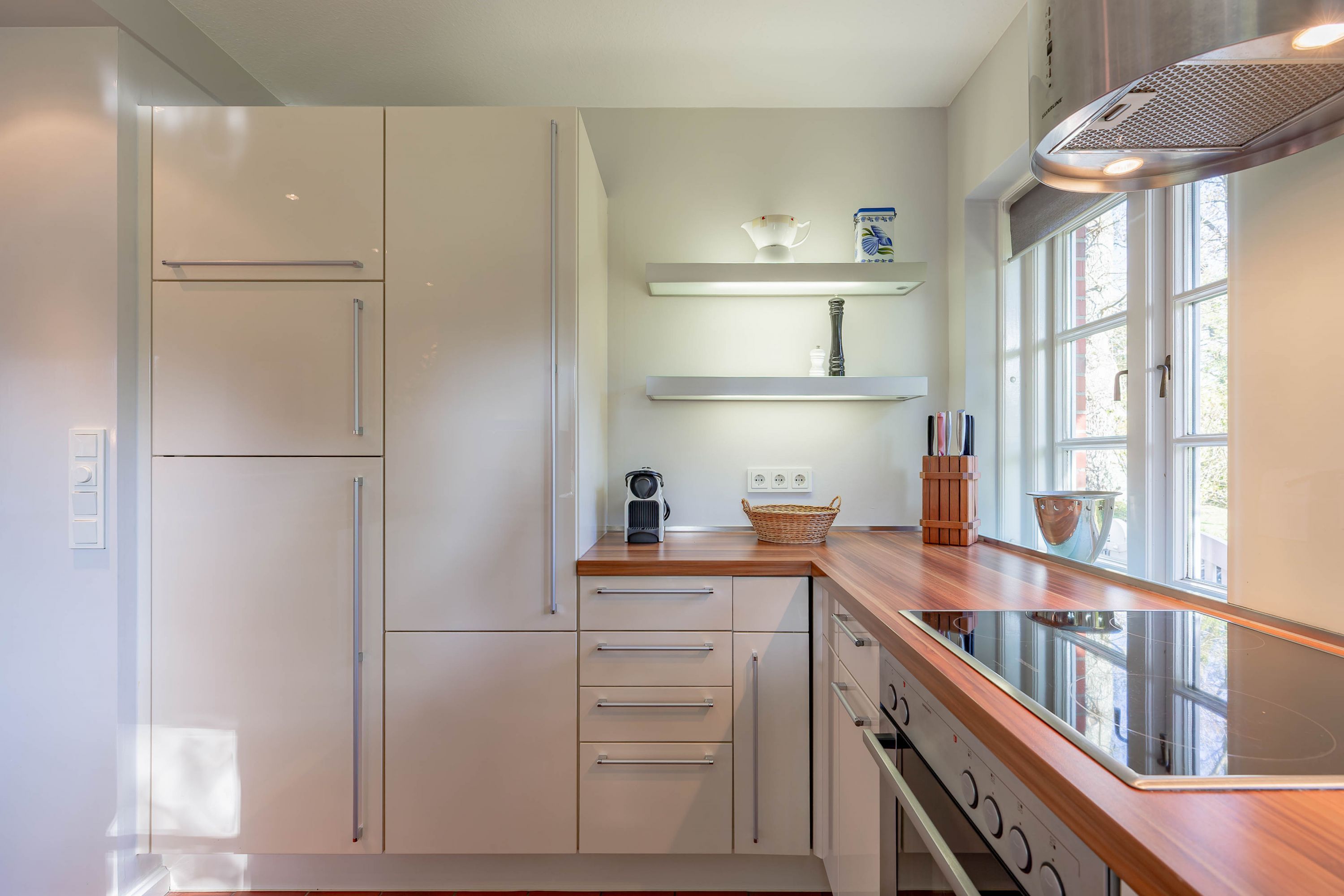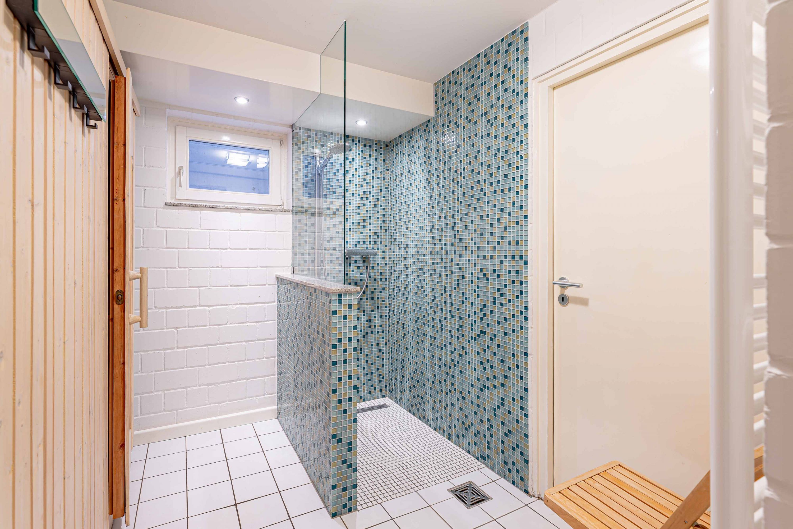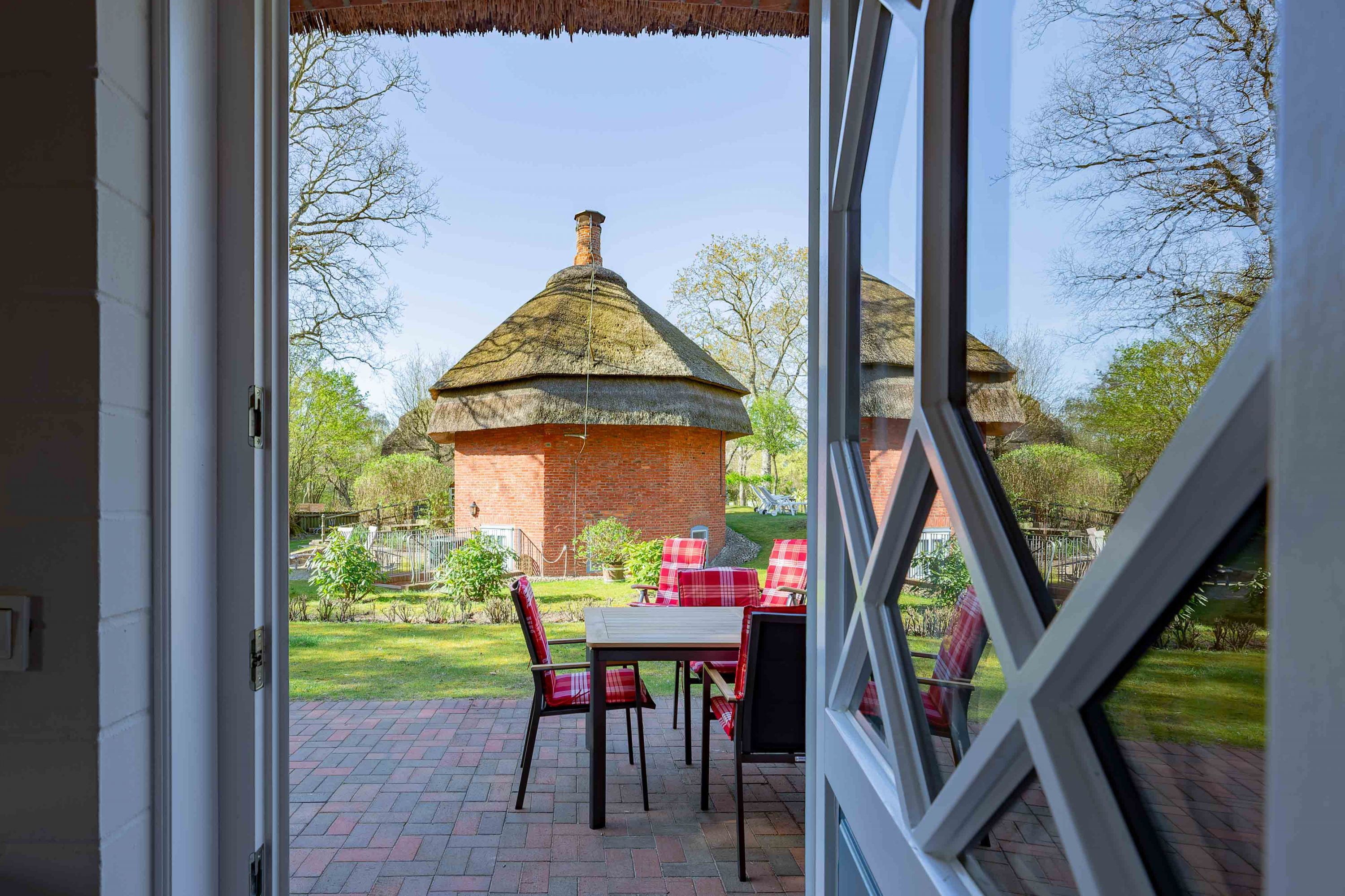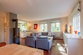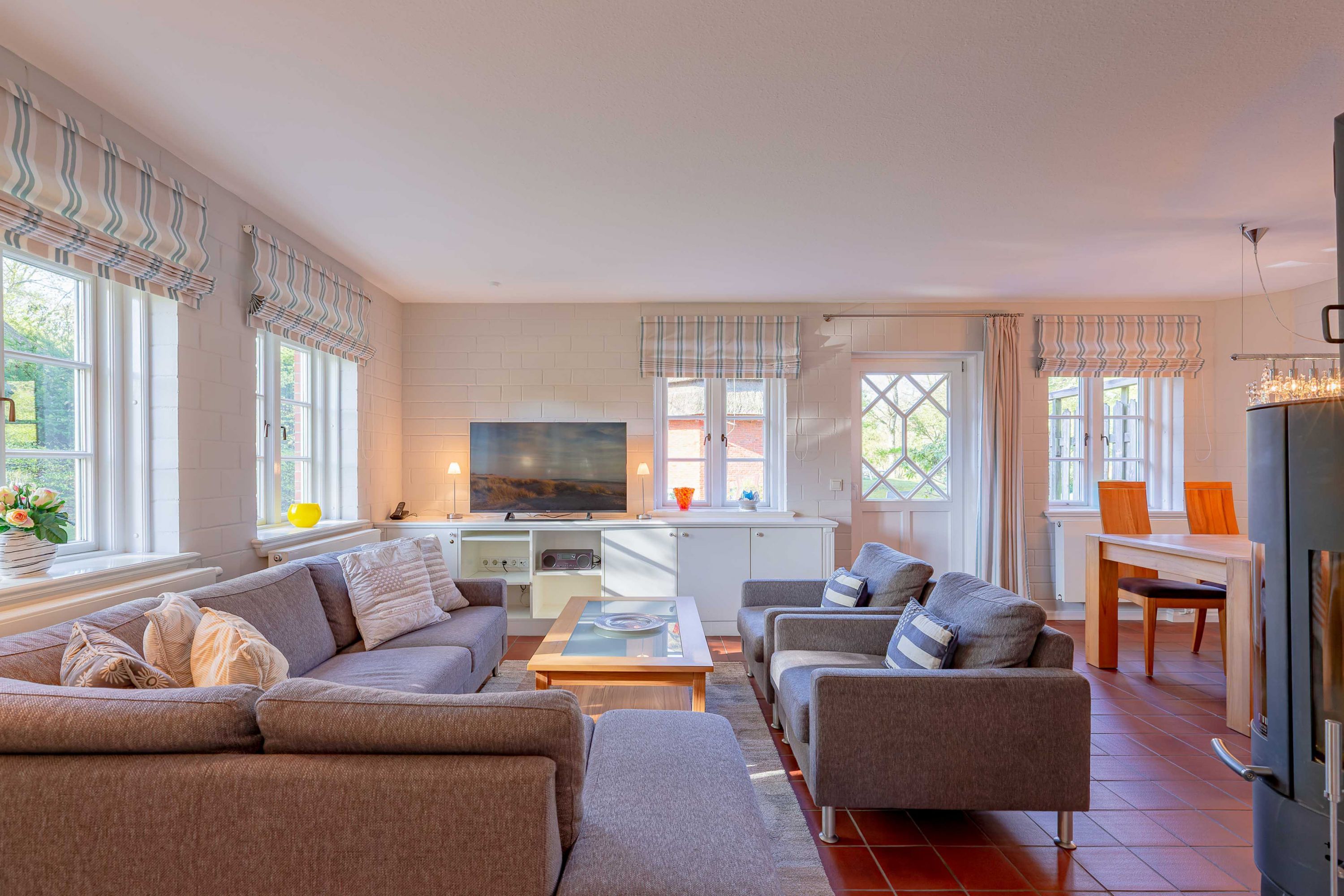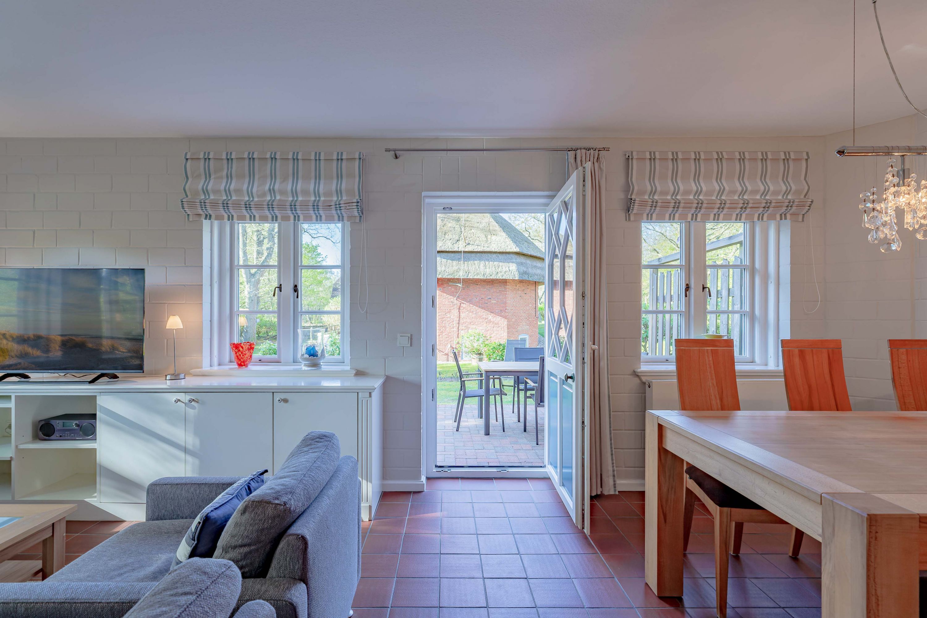 Diese Reetdachdoppelhaushälfte im friesischen Baustil auf einem parkähnlichen Grundstück liegt nur 150m vom Südstrand entfernt. Am Rande des Garten wurde der alte Baumbestand des Kurparks erhalten. Im Erdgeschoss befinden sich ein großes Wohnzimmer mit Essbereich und direktem Zugang zur Südterrasse. Gartenmöbel und Strandkorb warten hier auf Sie. In der kalten Jahreszeit schafft der drehbare Kaminofen eine behagliche Atmosphäre. Im Obergeschoss befinden sich zwei Schlafräume sowie ein begehbares Ankleidezimmer. Das moderne Badezimmer mit Waschtisch und Badewanne lädt zur Entspannung ein. Im Souterrain befindet sich die Sauna, sowie eine Dusche und ein kleiner Hauswirtschaftsraum mit Waschmaschine und Trockner.